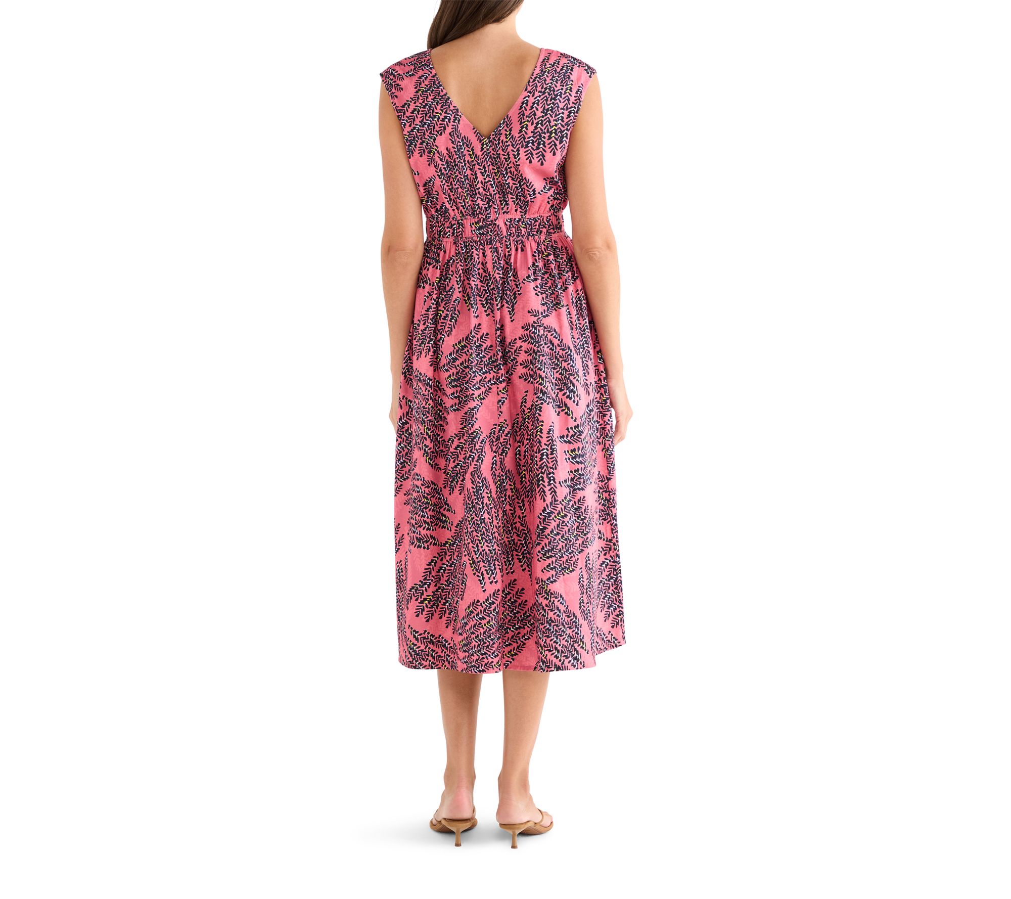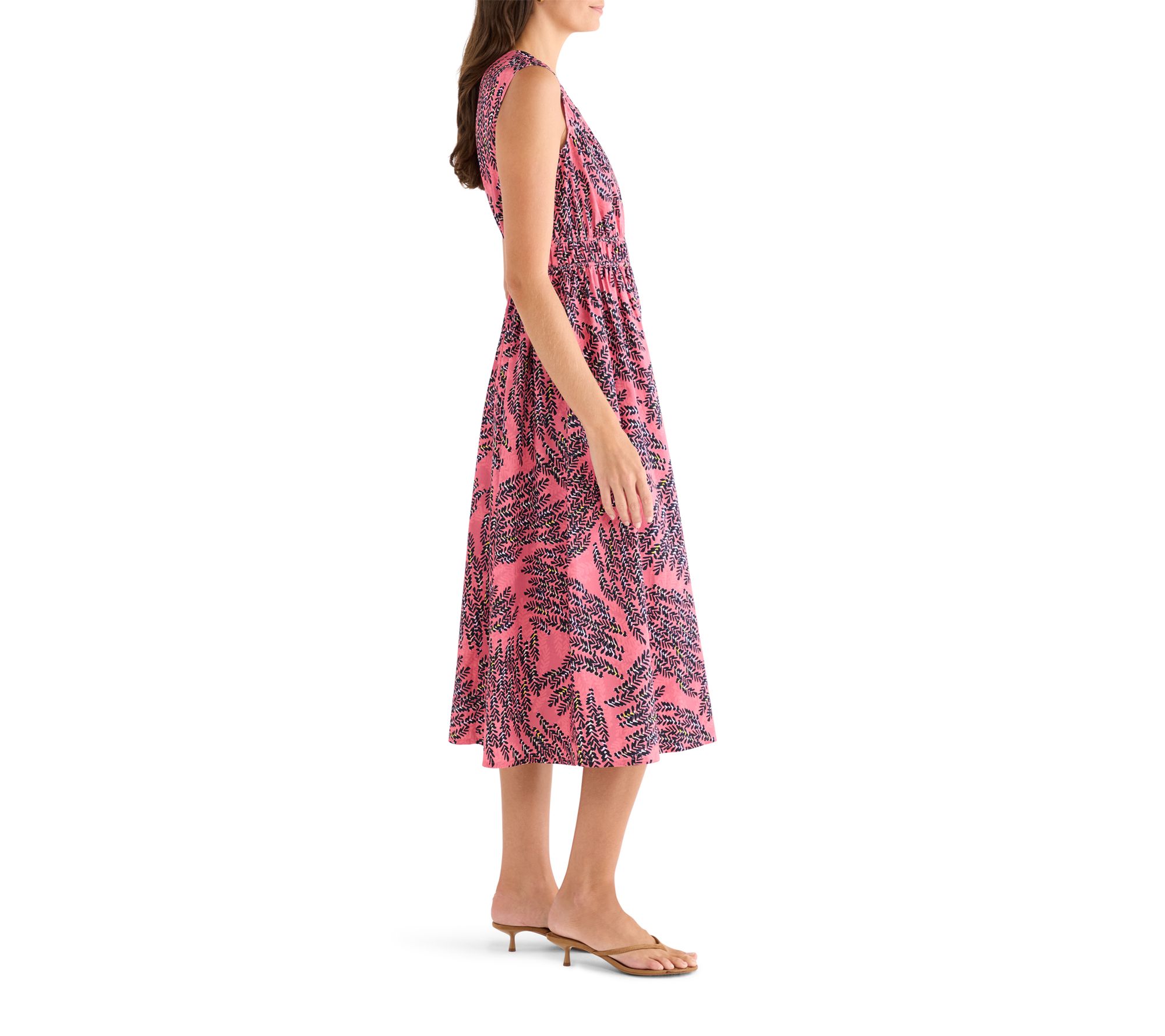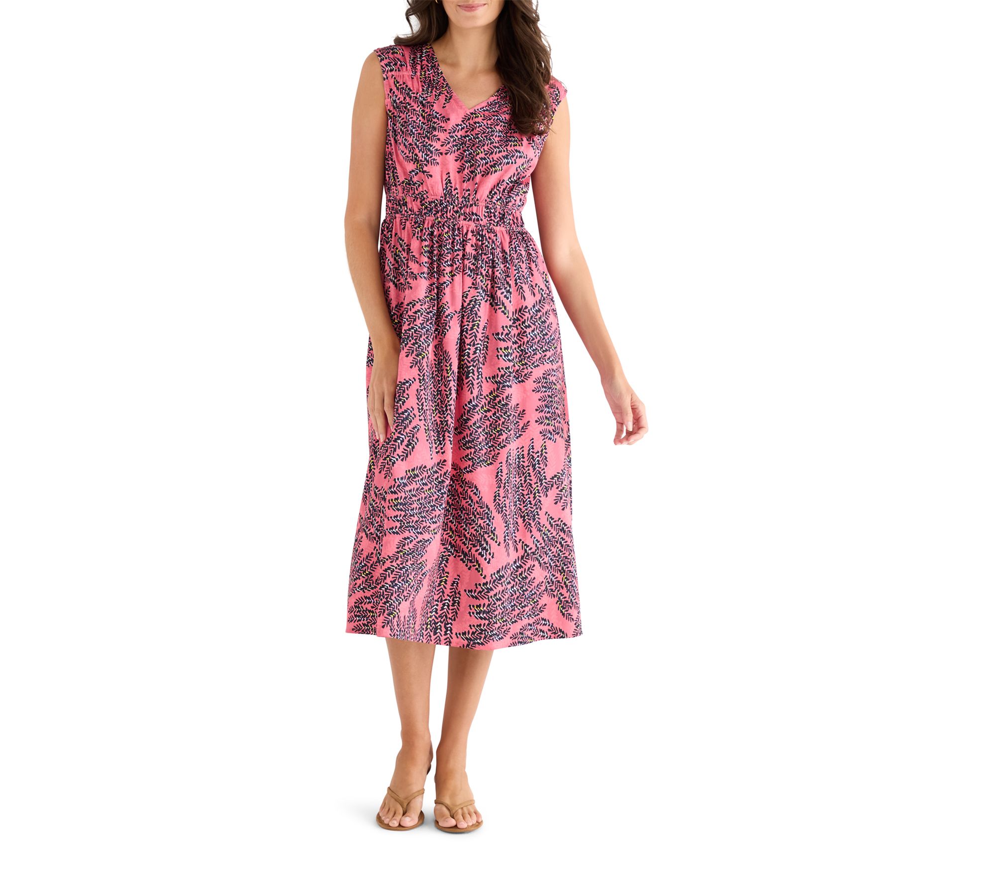 • Features: sleeveless, painterly print, stretch waist, shoulder shirring, midi length, A-line silhouette