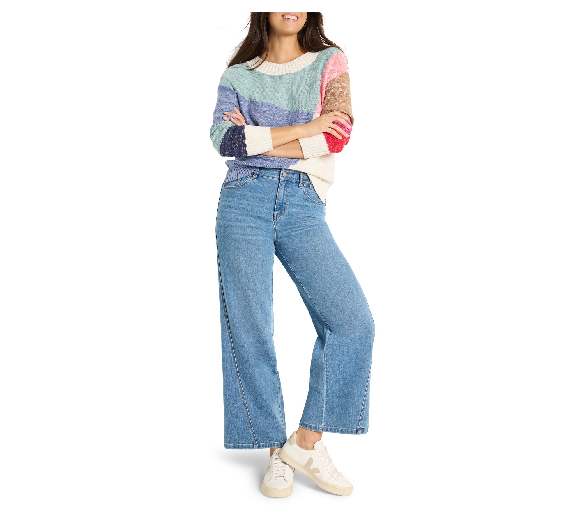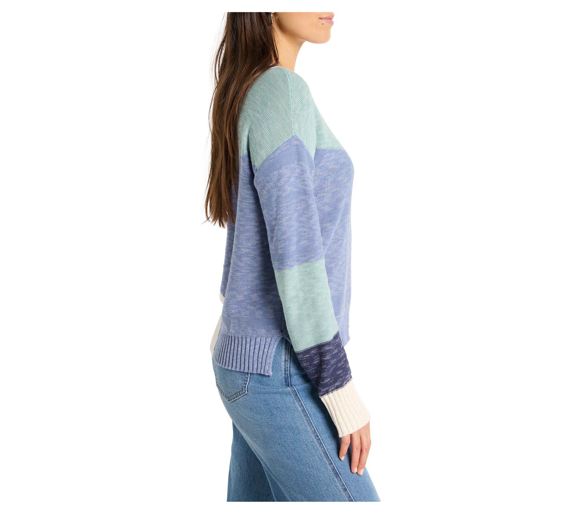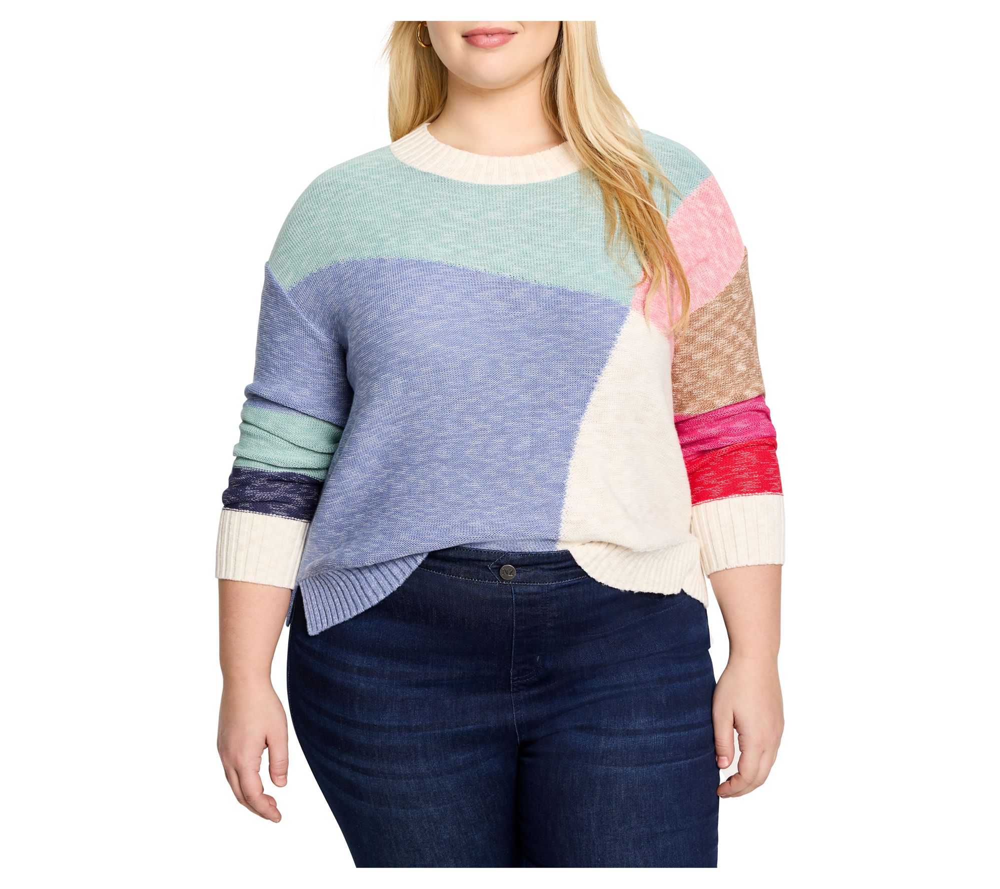 A colorful knit pick-me-up for any outfit. This fresh take on knitwear features crisp intarsia knit color blending and a lightweight cotton-slub texture that stays soft year after year. And there's more to love: details include a bold, ribbed neckline and subtle side slit shaping. From NIC+ZOE.
