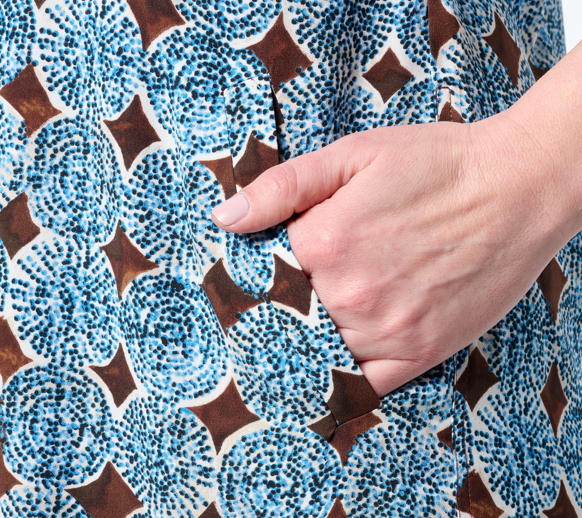Features: pull-over style, shirt collar, elbow-length sleeves, front welt pockets