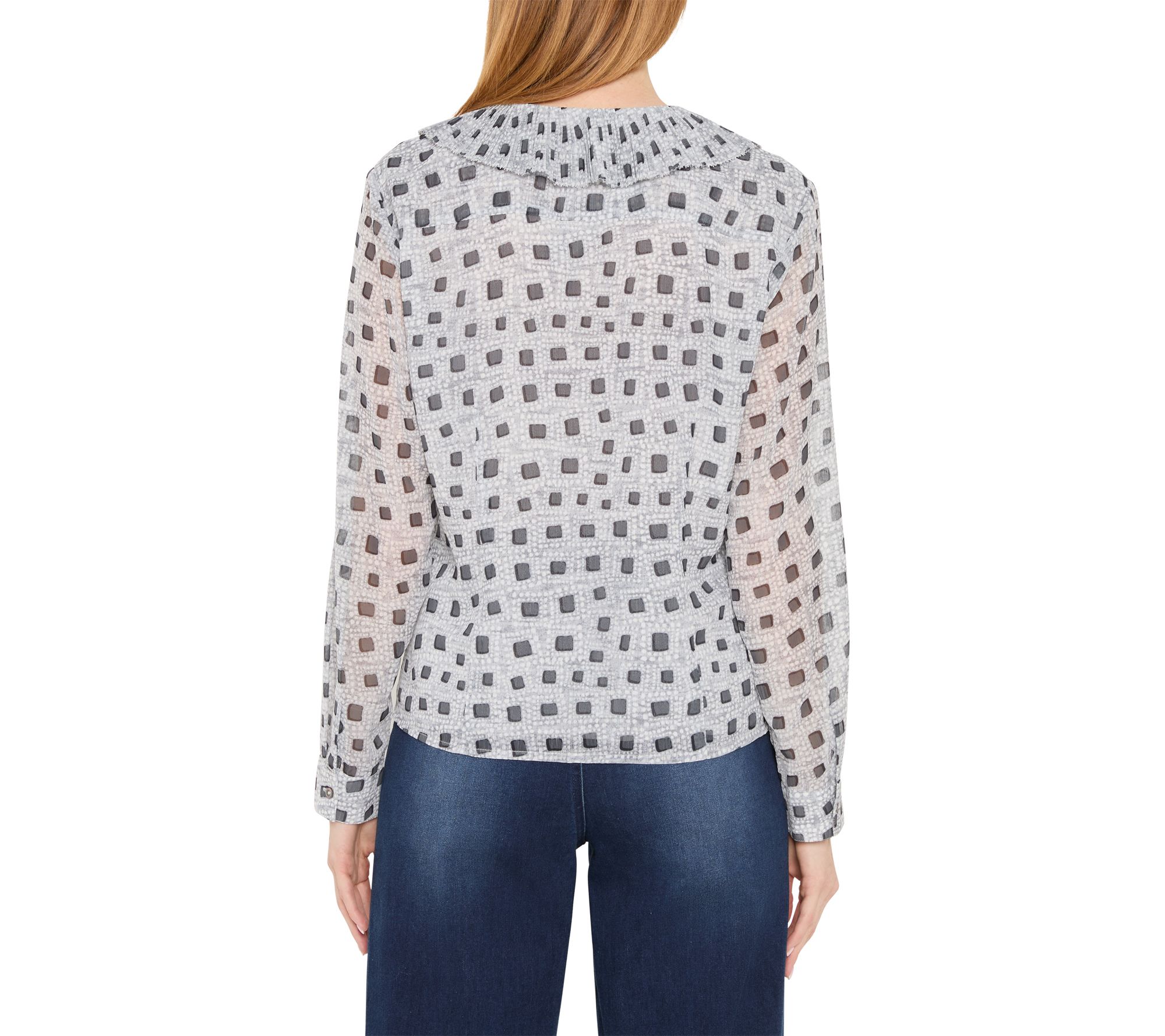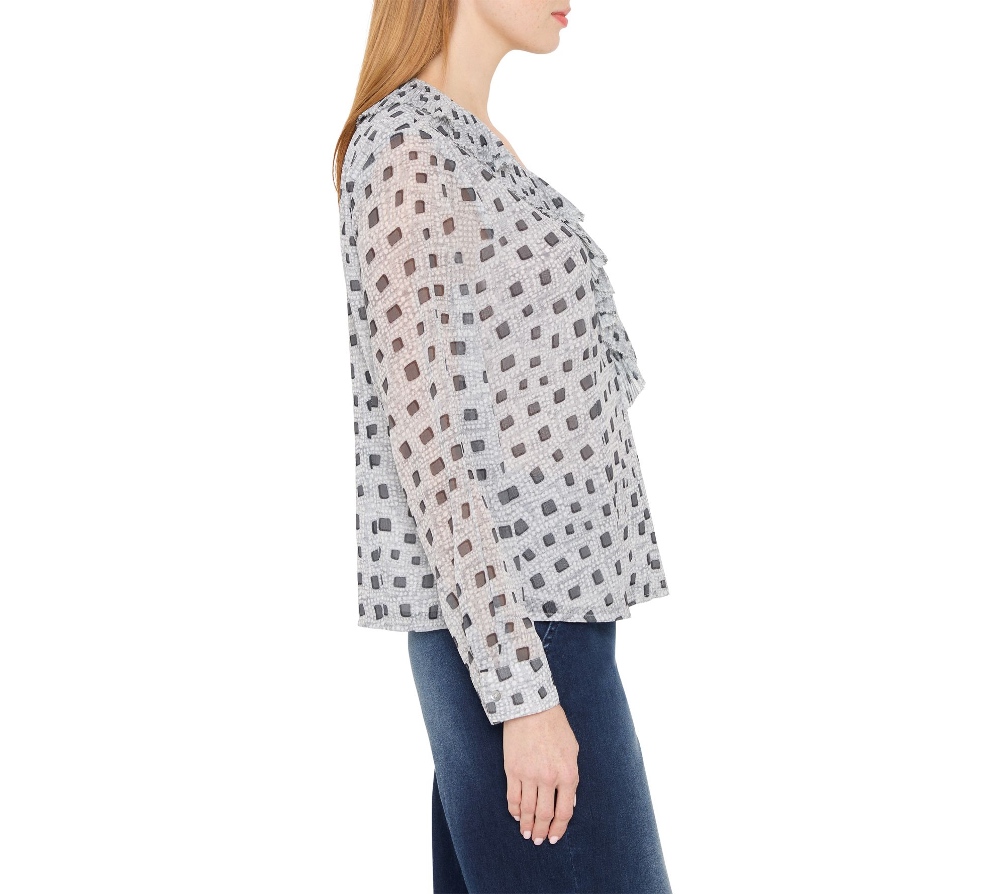 A geo-print blouse brings a playful twist to your fall and winter wardrobe, making it easy to style for workdays or weekend gatherings. Its airy chiffon fabric and asymmetrical ruffle detail add movement and a feminine touch, while the neutral grey color pairs effortlessly with your favorite pants or skirts. From NIC+ZOE.
