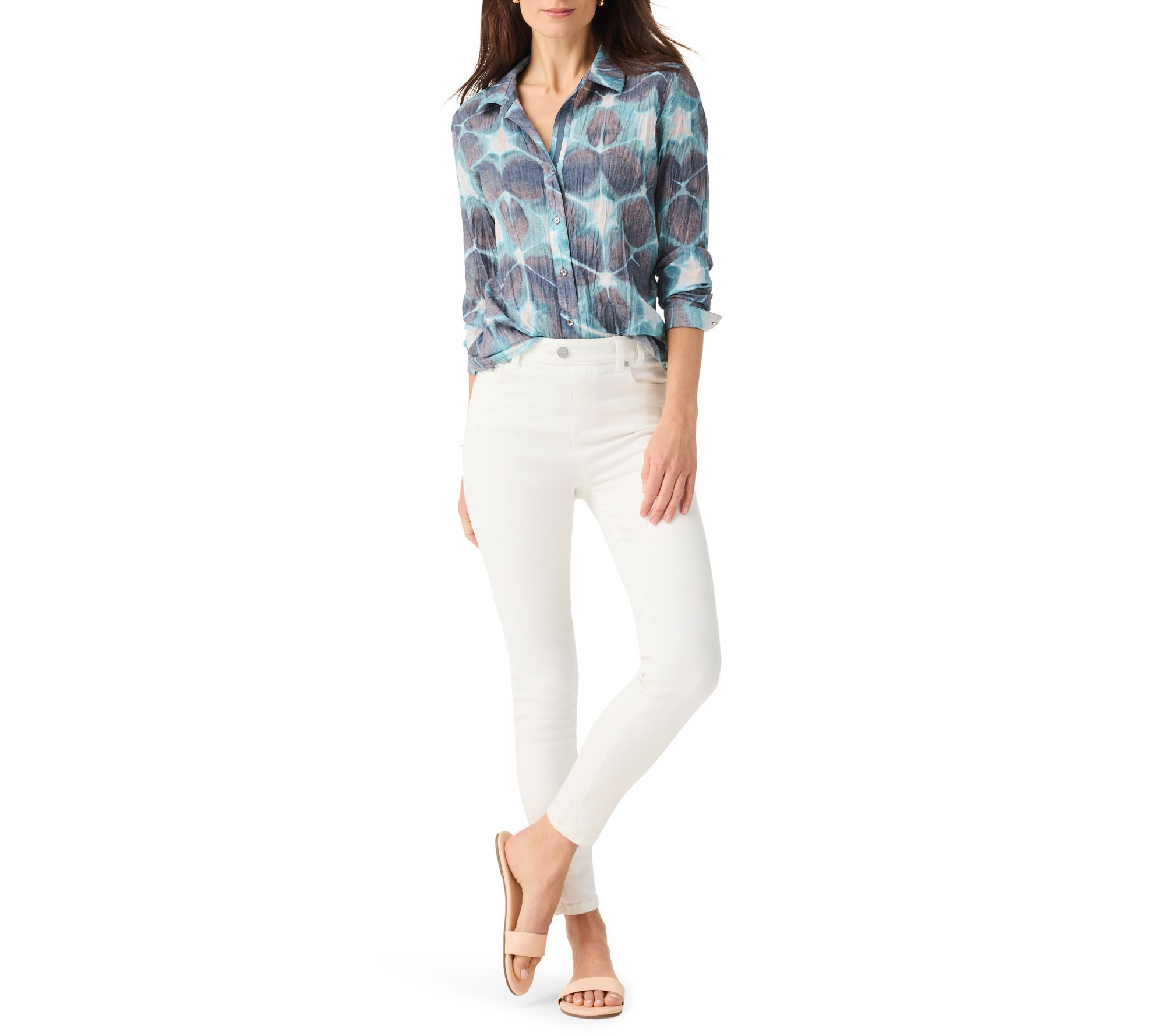 Looking for an easy way to make a style impact? The NIC+ZOE ethereal seas button-front crinkle cotton shirt has it all buttoned up. Inspired by ocean views, this colorful top features a simple, yet poppy print in aqua tones, perfect for both casual and polished outfits. From NIC+ZOE.