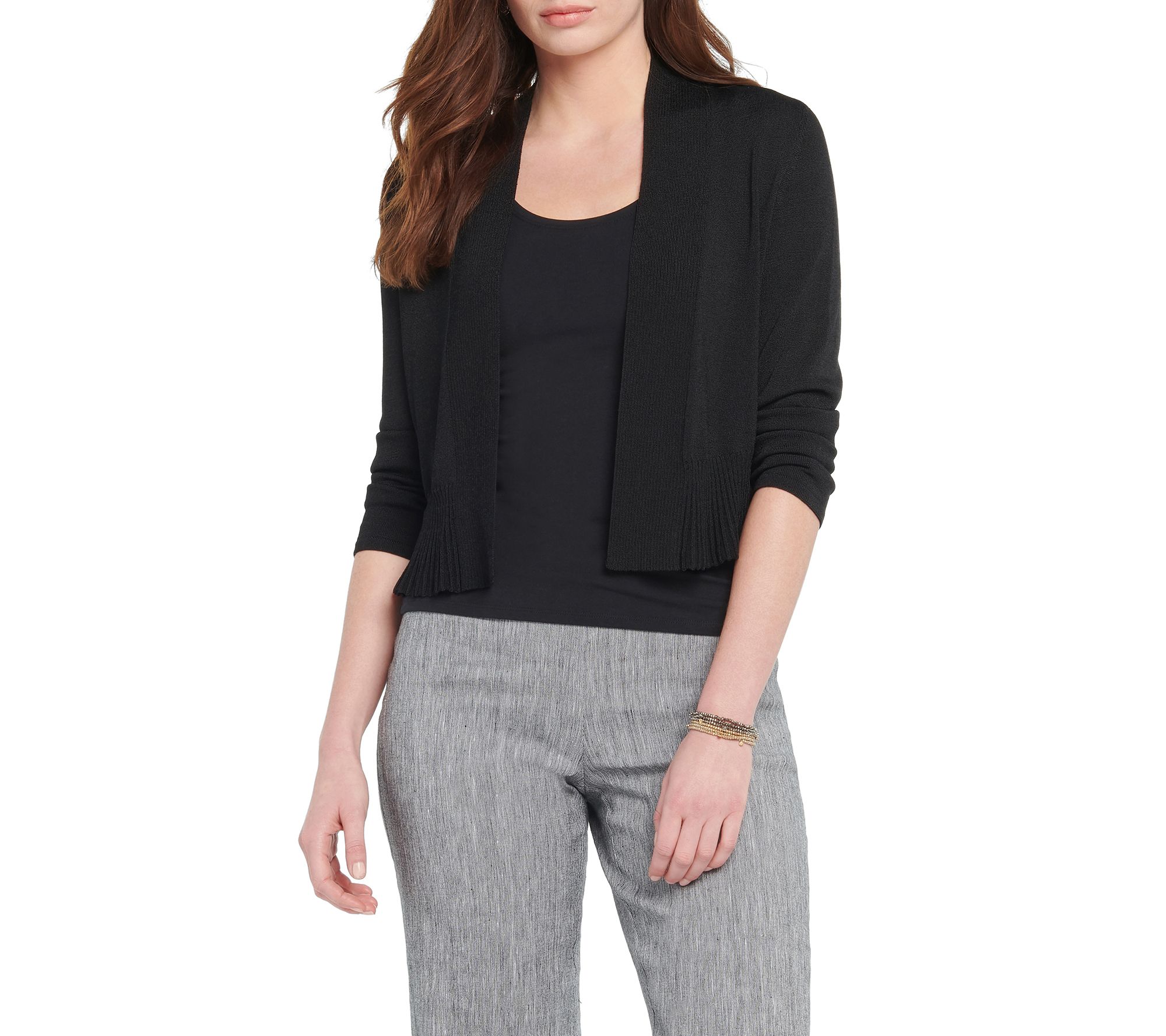 • Features: open front, 3/4-length sleeves, pleated ruffle hem