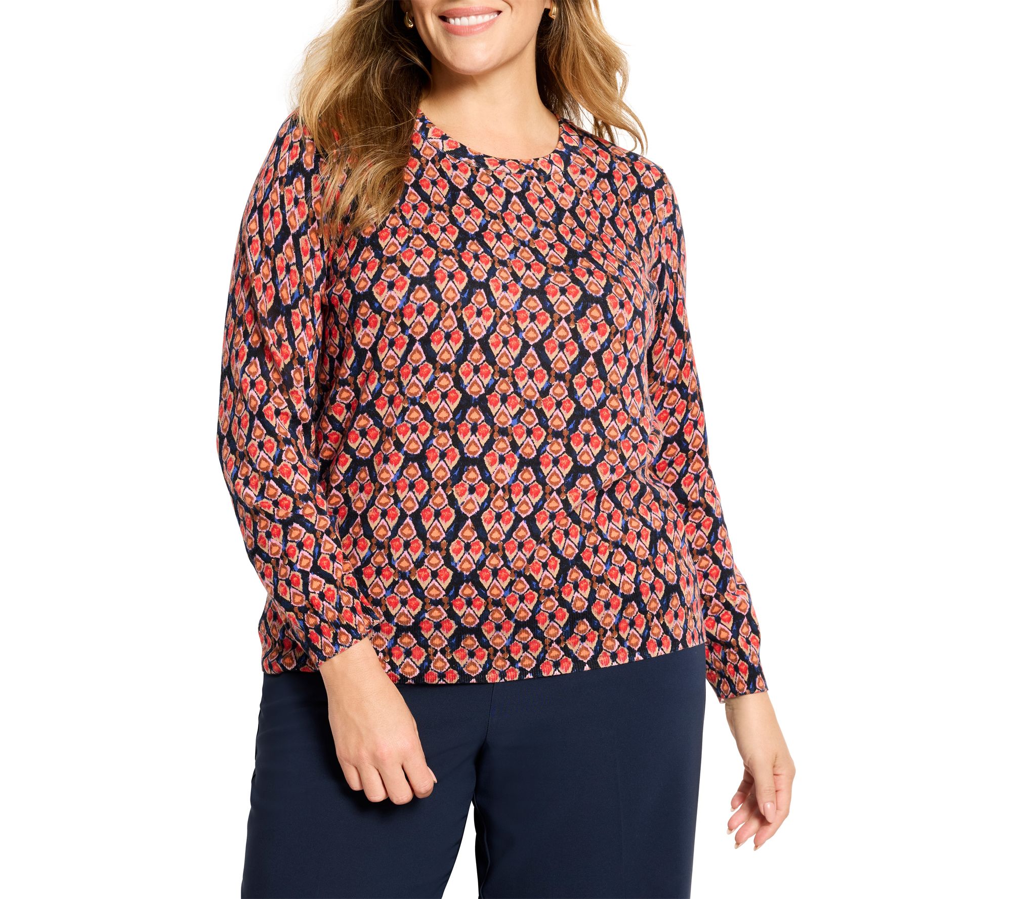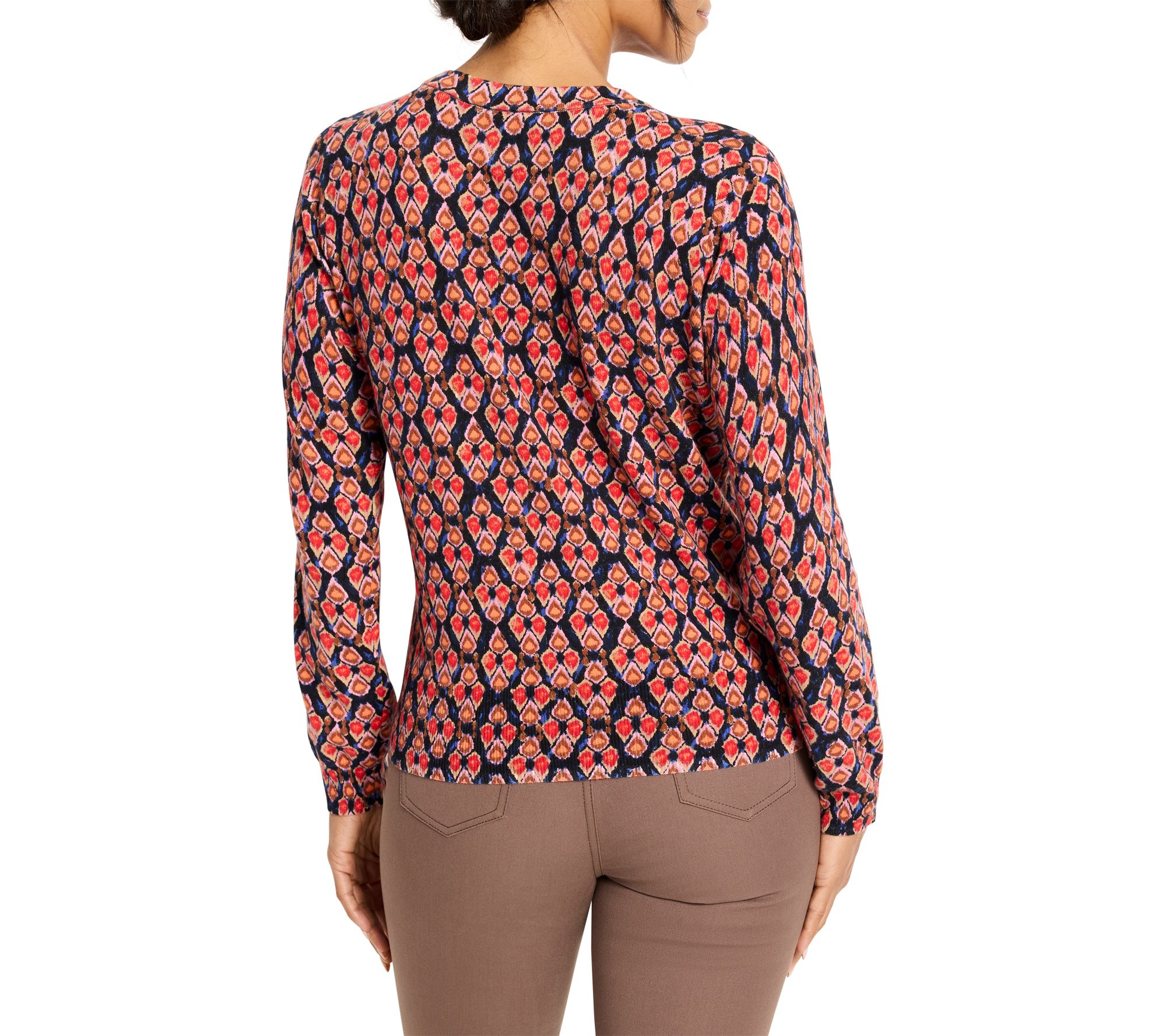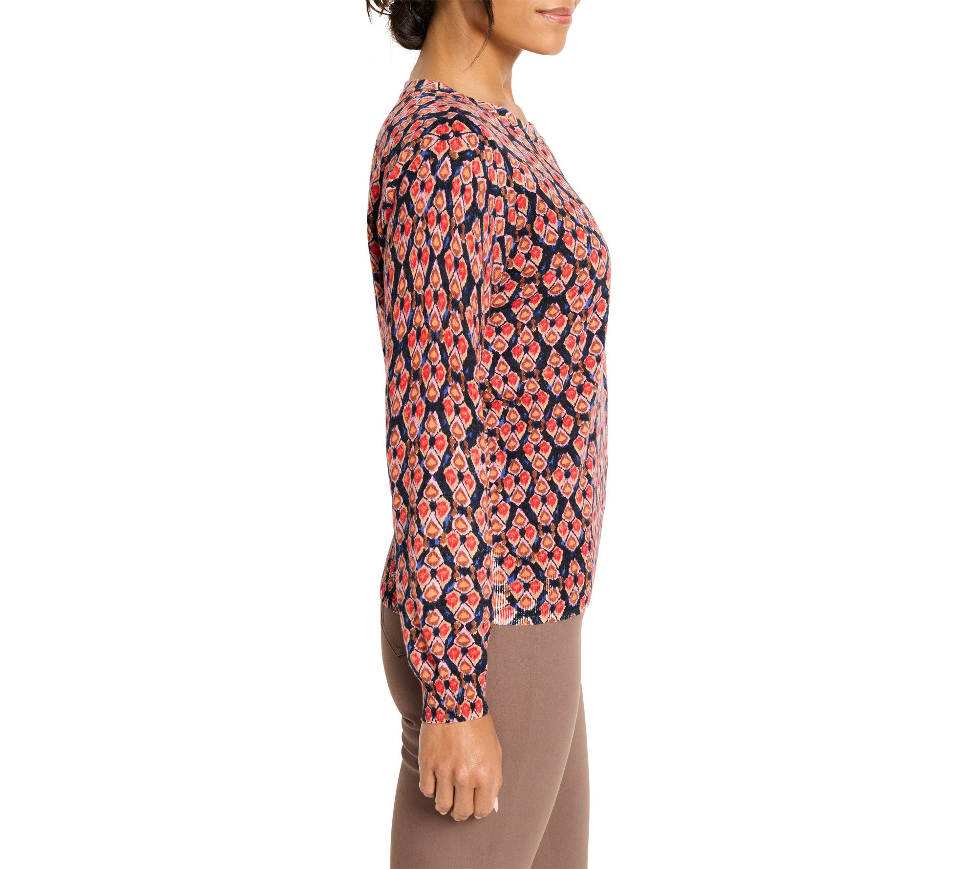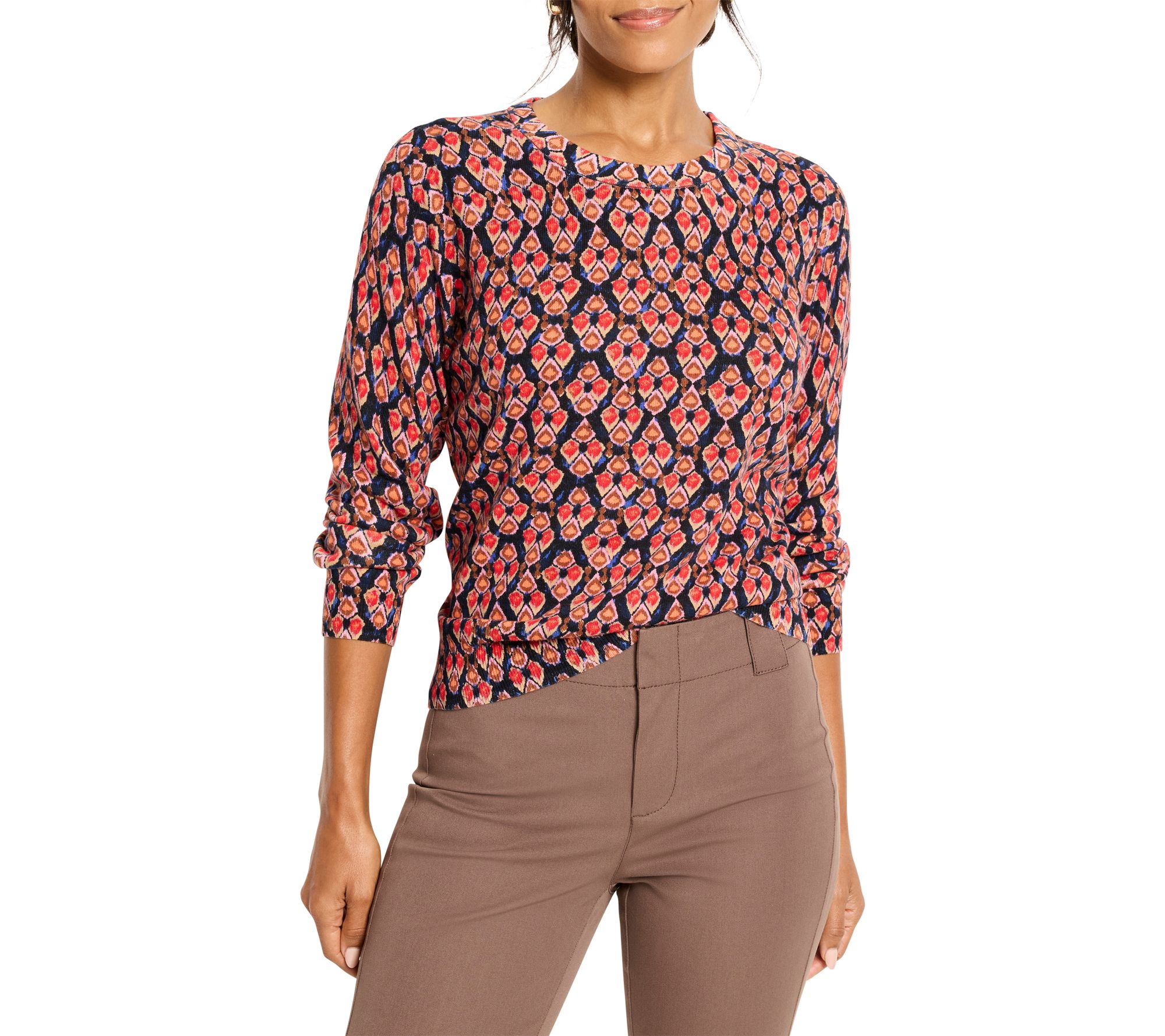 Whether you're heading out for a crisp morning stroll or relaxing with friends over coffee, this pure cotton sweater brings effortless style to your fall and winter wardrobe. Its eye-catching ikat-inspired print and fitted silhouette make it a versatile choice for pairing with everything from classic denim to tailored trousers. From NIC+ZOE.