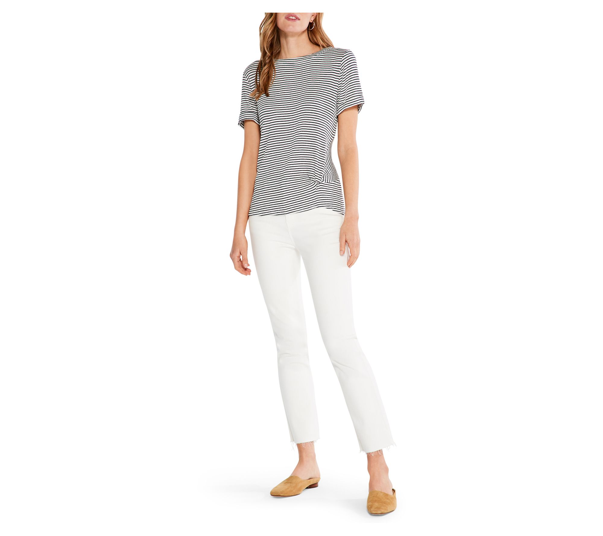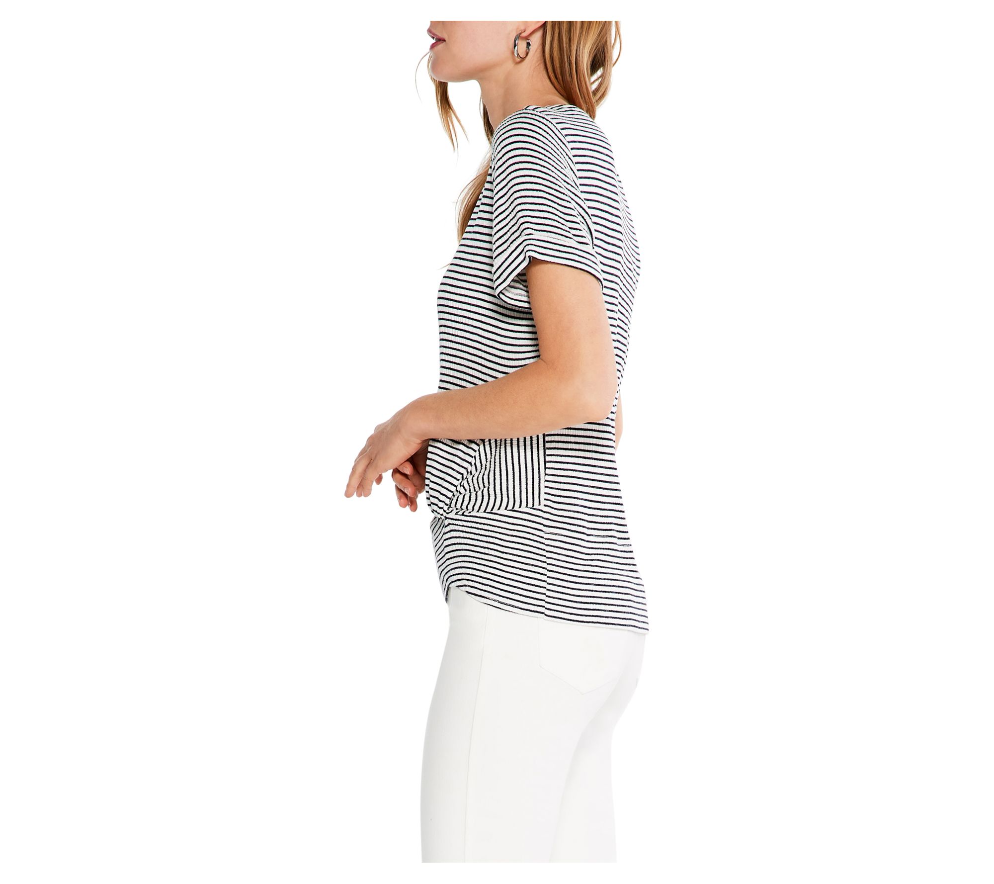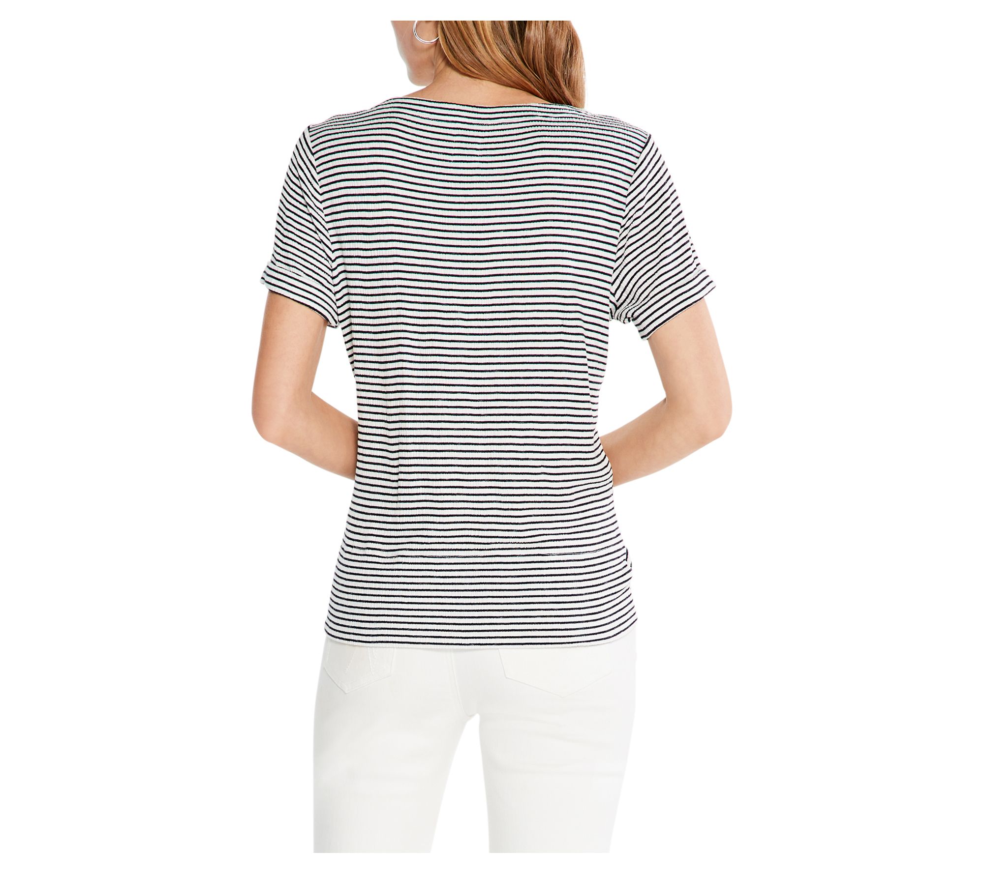 Tidy stripes with a distinctive texture lend preppy appeal to this flirty tee that pairs perfectly with your favorite skinny jeans for a stylish and comfy outfit. From Nic + Zoe.
