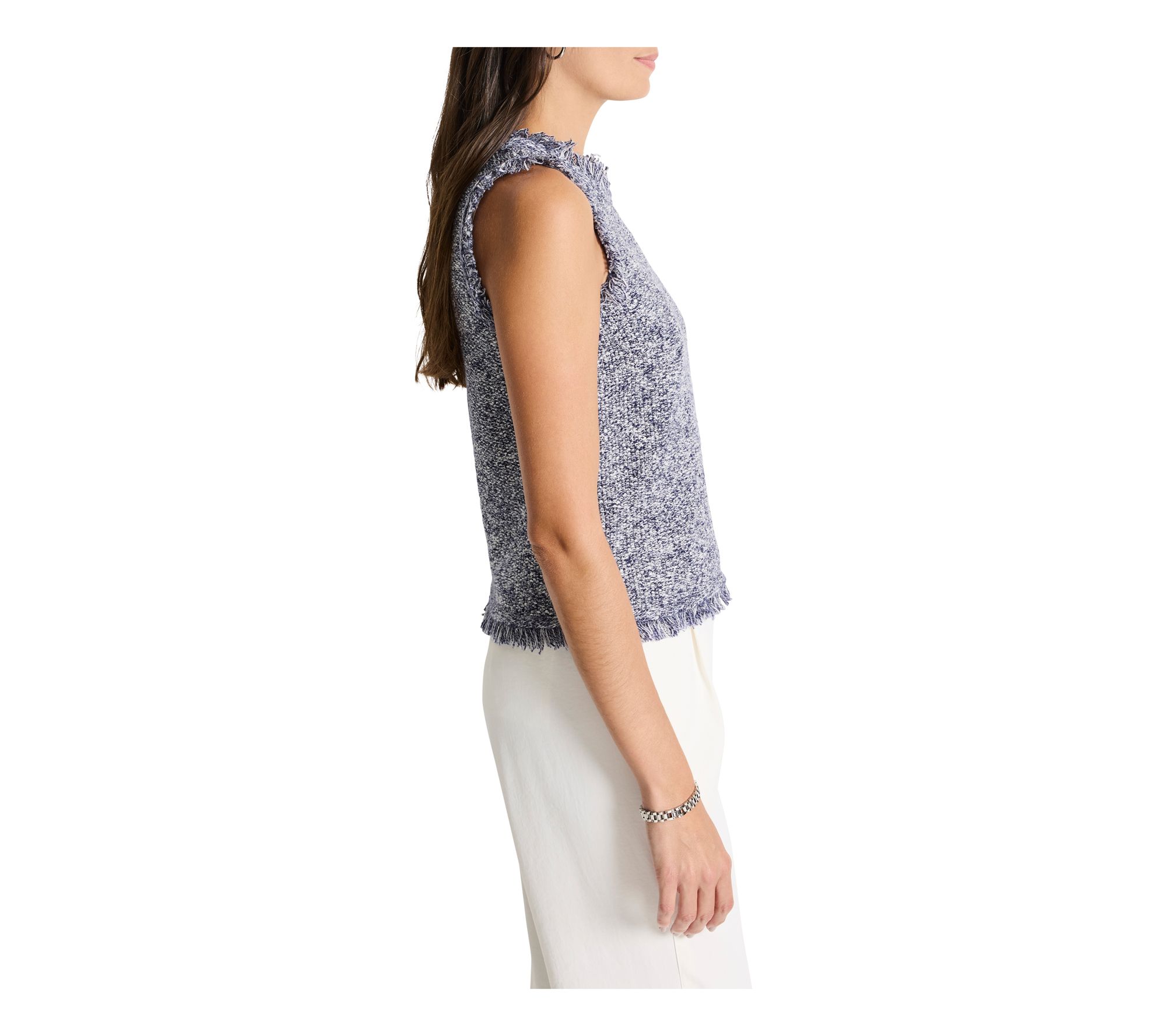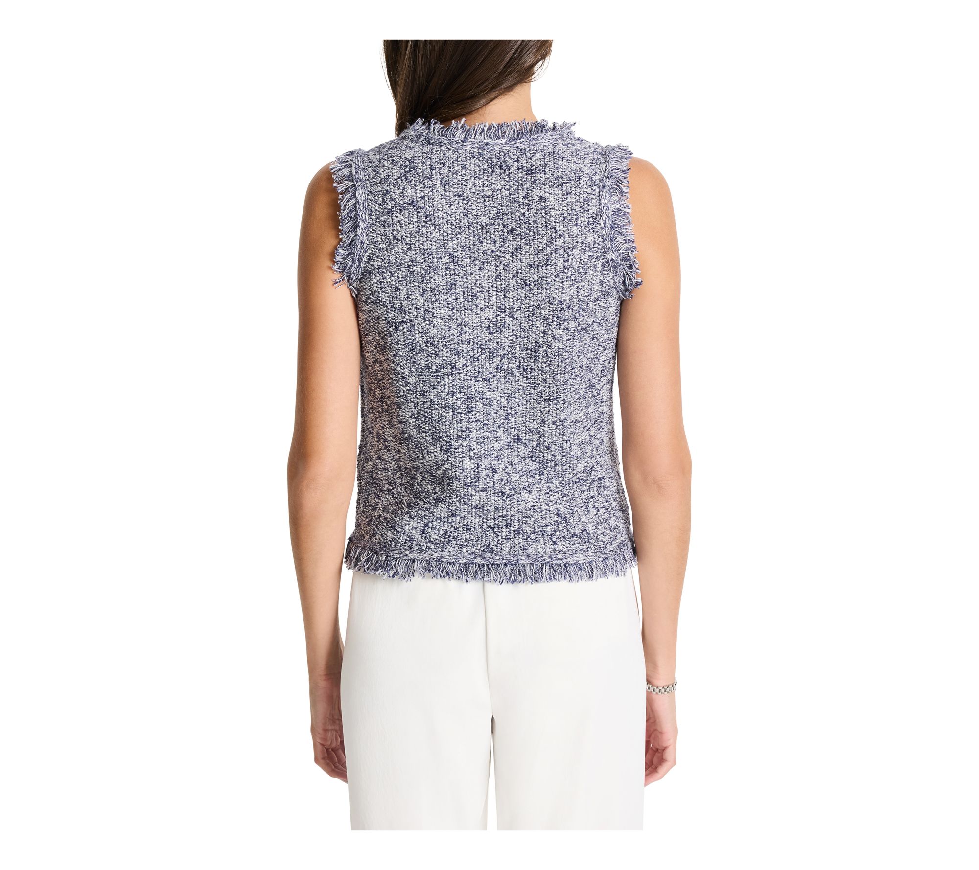 • Features: sleeveless, crew neckline, button-front design, fringe details at edges, part of the mixed knit set