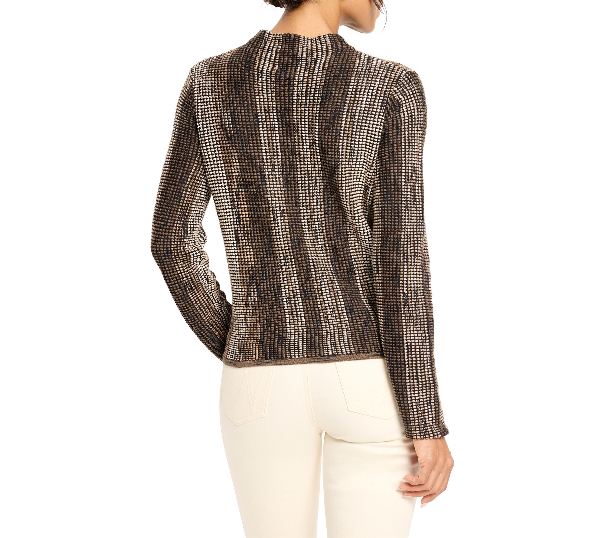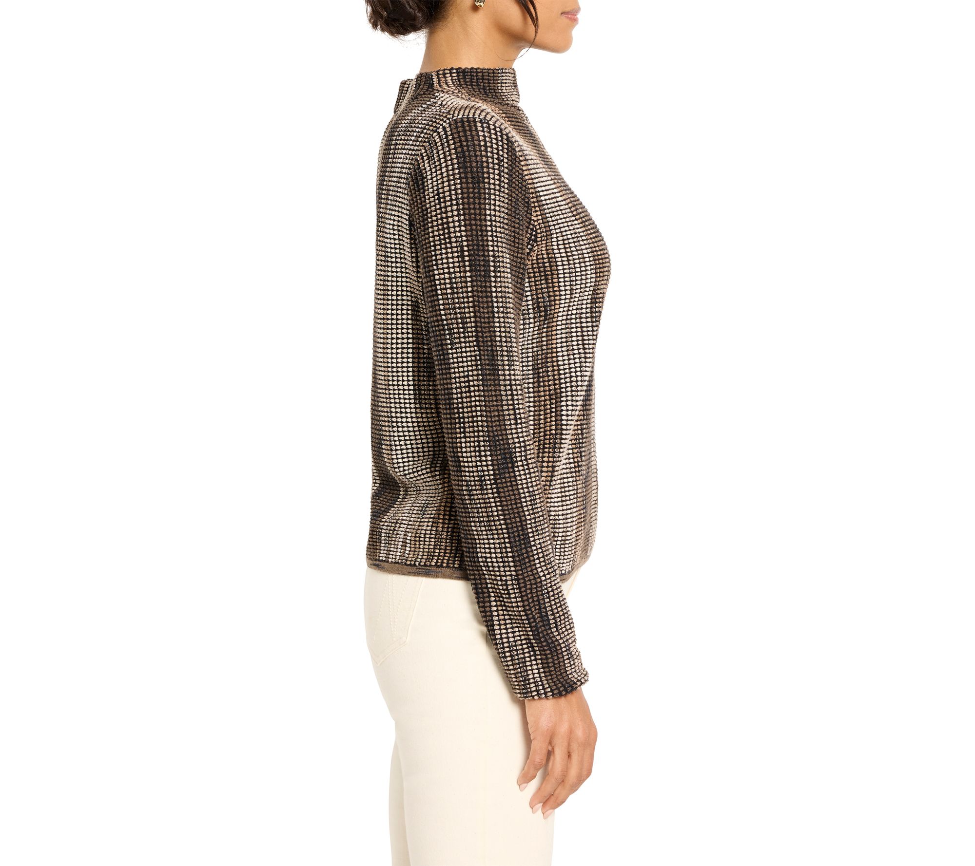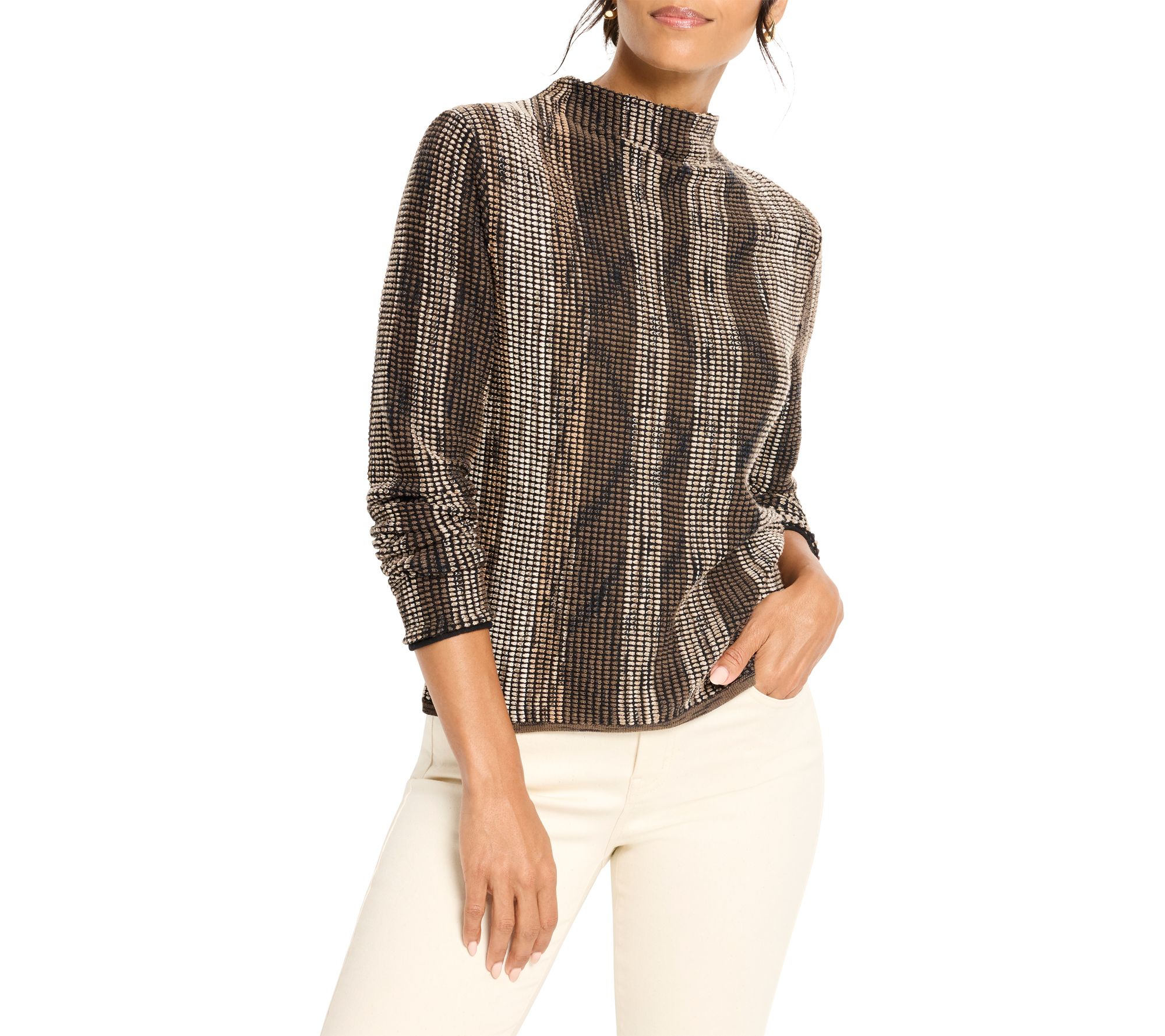 Whether you're heading to brunch or dressing up for a cozy evening, this sophisticated sweater brings a vibrant twist to your look with its ombre pixel knit and stunning melange of color. The mock neck and long sleeves keep you warm while the fully fashioned knit minimizes textile waste, making it a smart and stylish choice for fall and winter. From NIC+ZOE.