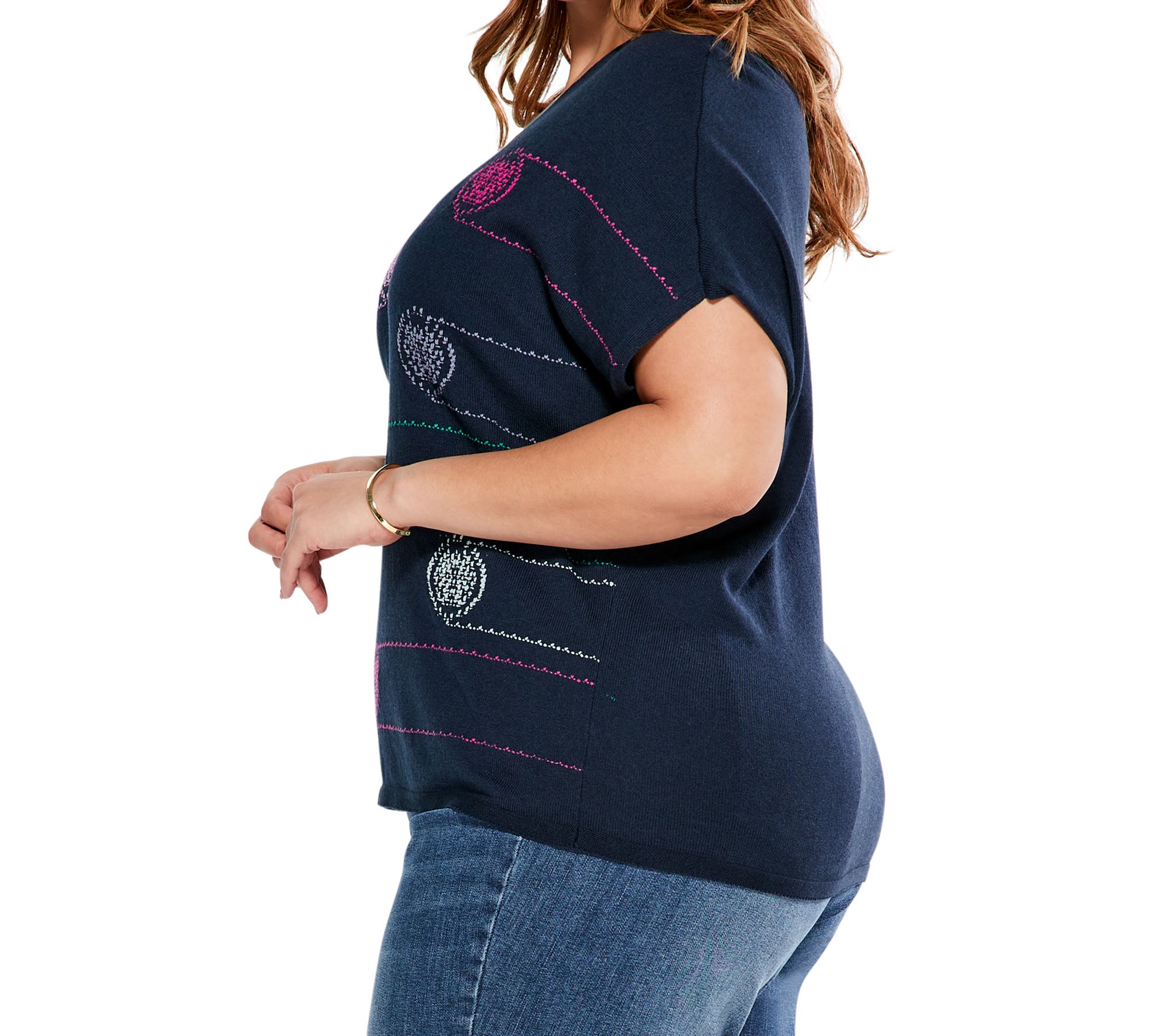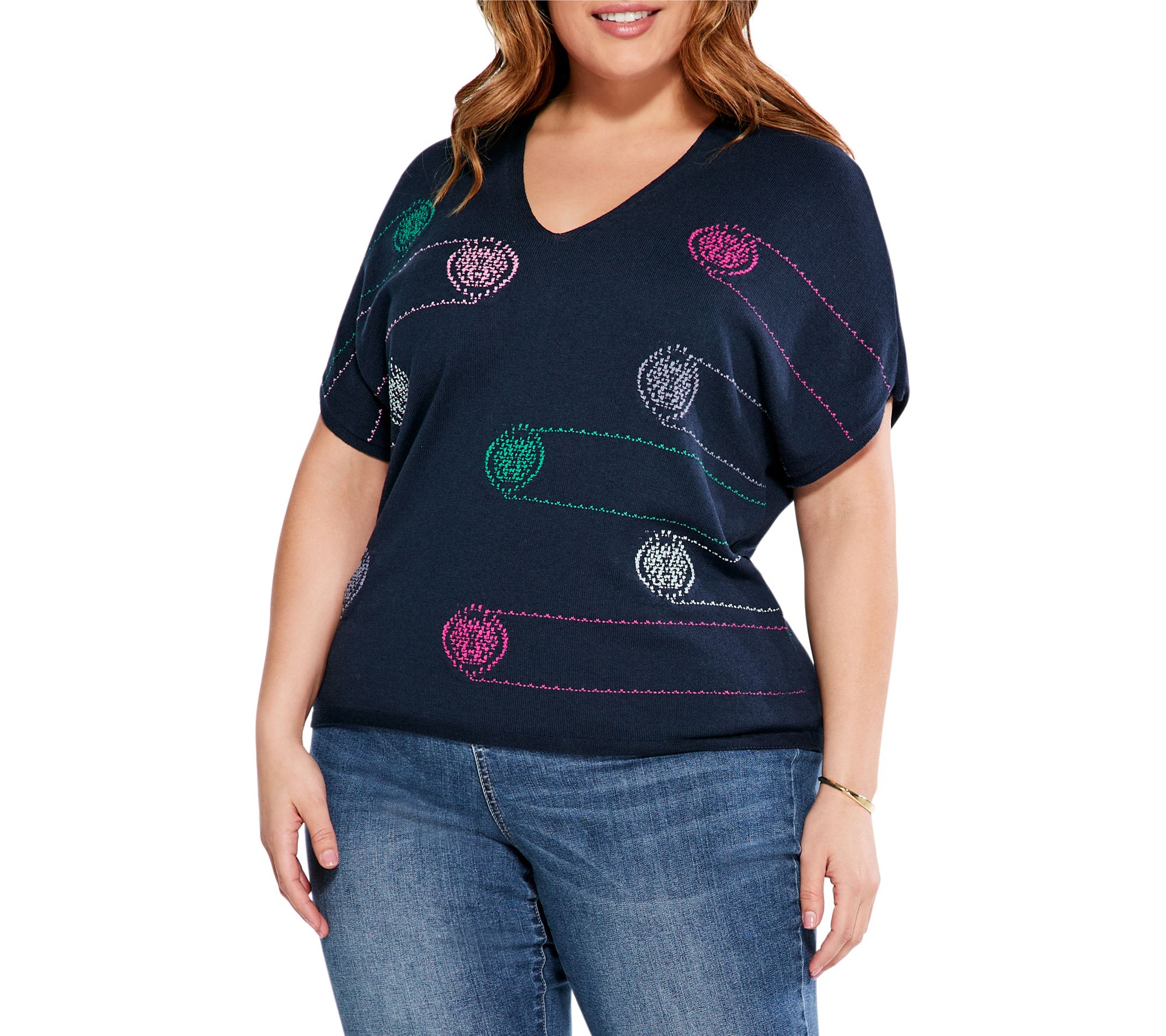 Give your cool-weather wardrobe a vivid update with this soft cotton-blend sweater decorated in colorful details. From Nic + Zoe.