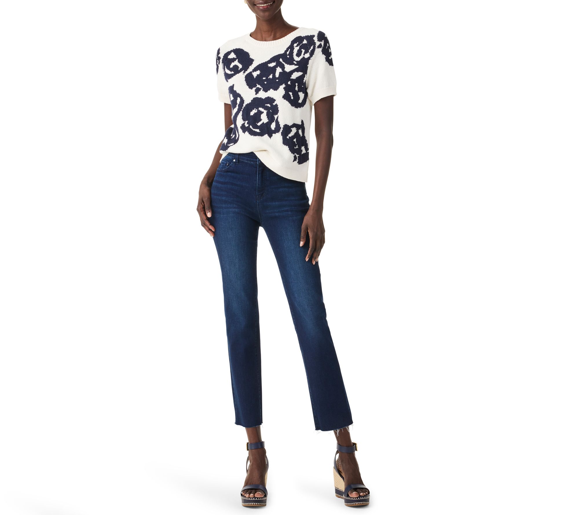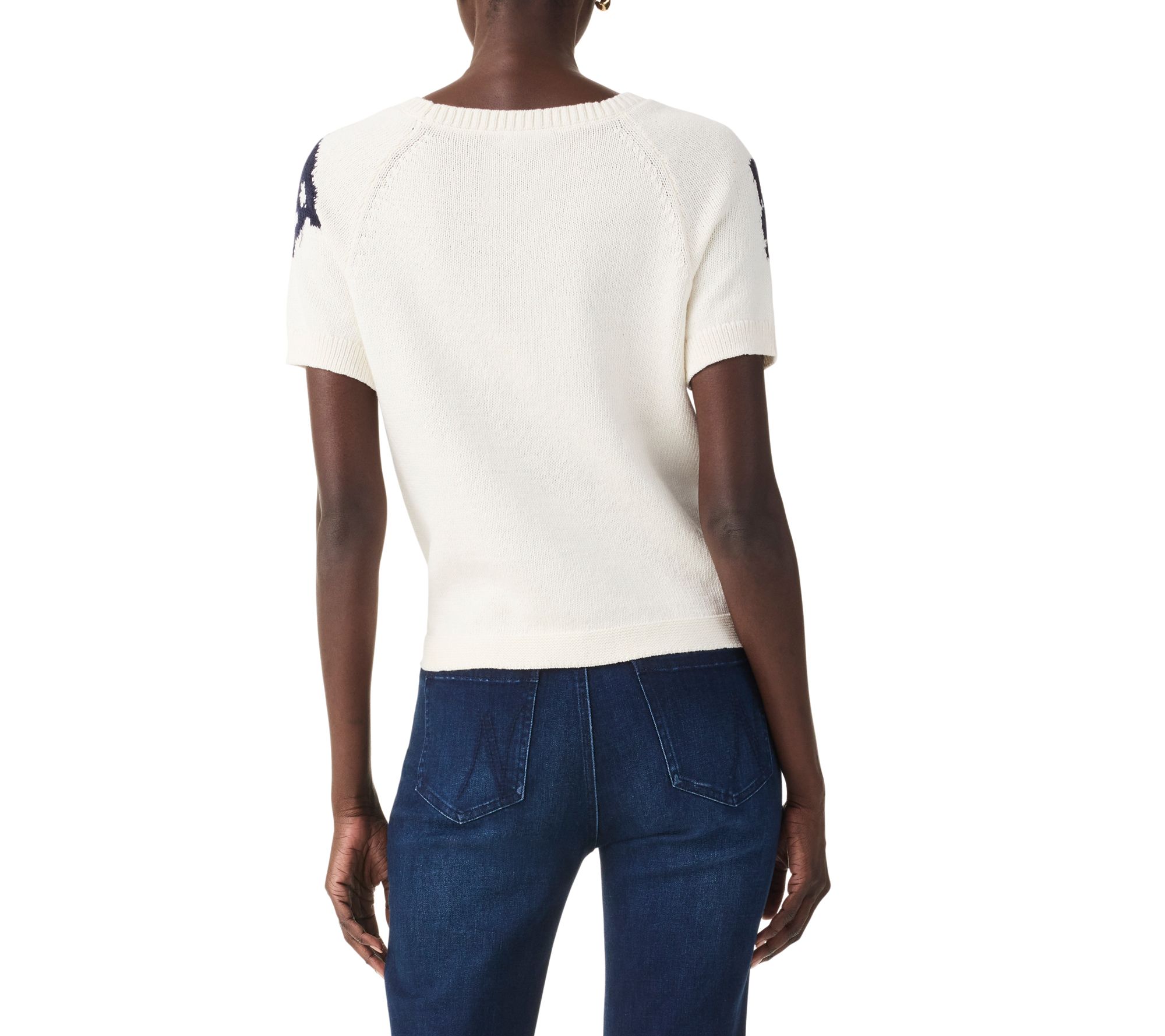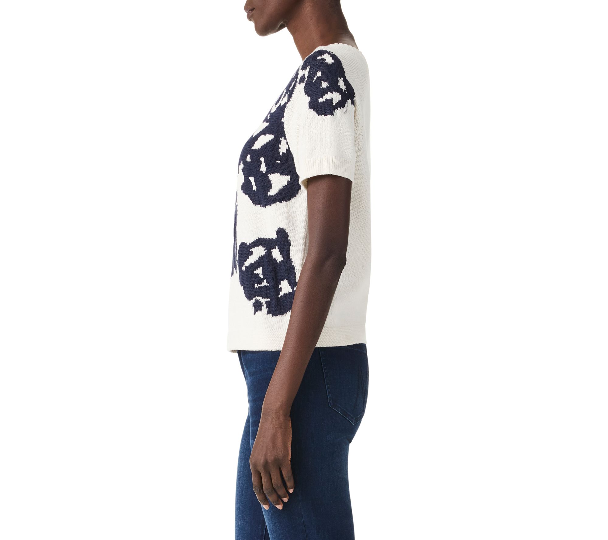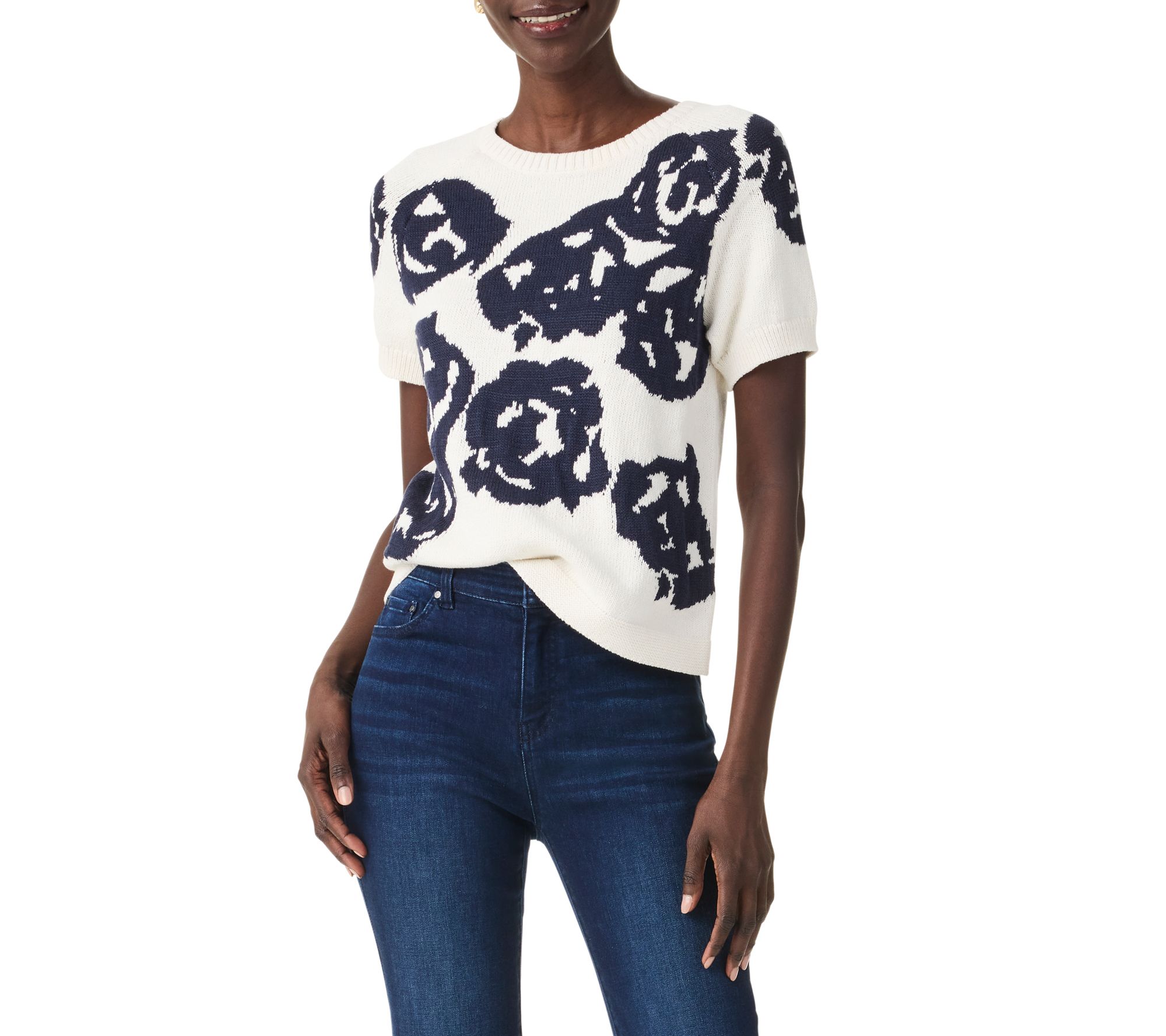 Elevate your spring and summer wardrobe with the NIC+ZOE rose bloom raglan short sleeve sweater. Featuring intarsia jacquard stitching and placed flowers in dark indigo on white, this knit piece effortlessly pairs with denim or dressier pants. From NIC+ZOE.