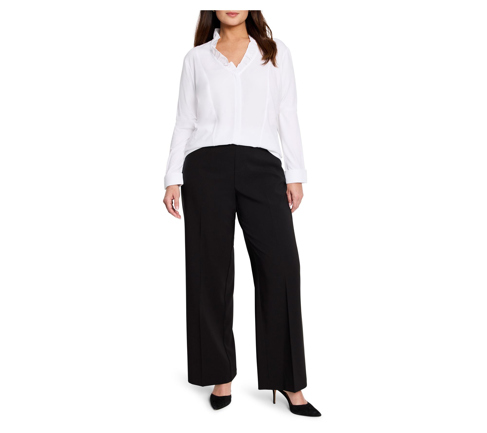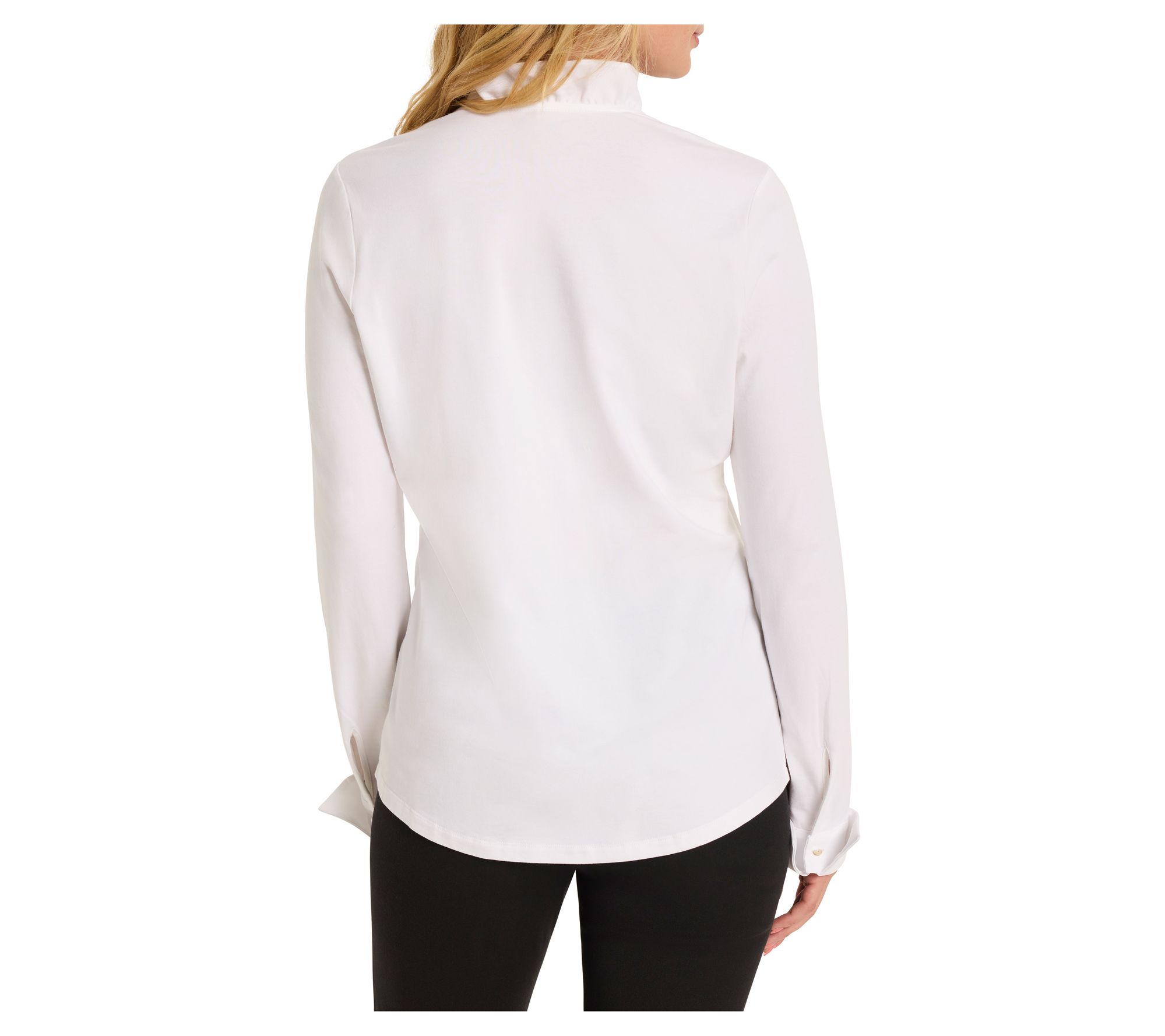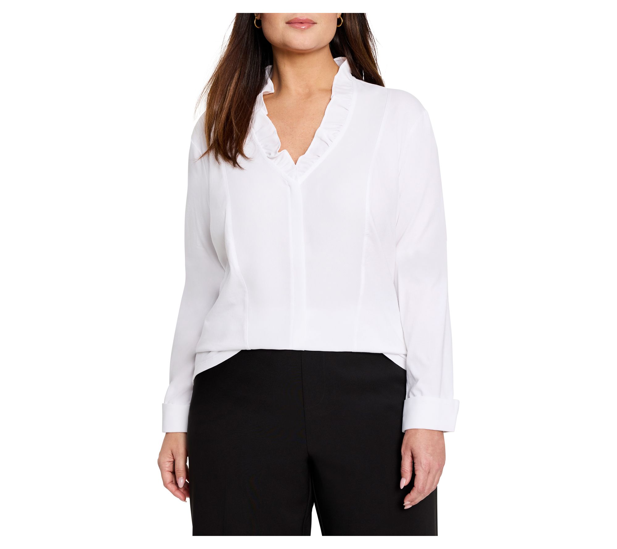 The Ruffled Around Shirt brings a touch of romance to everyday elegance. Crafted from super-soft cotton modal, it features a flattering V-neck with a delicate ruffle collar and long sleeves finished with self cuffs and button closures. From NIC+ZOE.