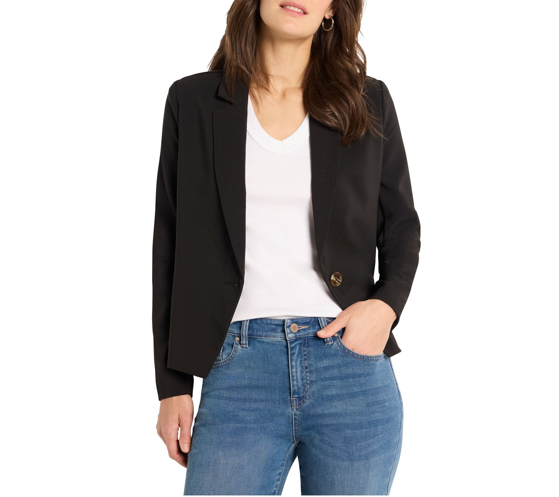 The blazer that blends effortless sophistication with versatile ease. Crafted in a midweight, stretchy, unlined fabric, it features a classic notch collar, button front, and button-cuffed sleeves. Sitting at the hip, this blazer pairs perfectly with matching pant separates for a polished look, ready to take you from the office to a night out. From NIC+ZOE.