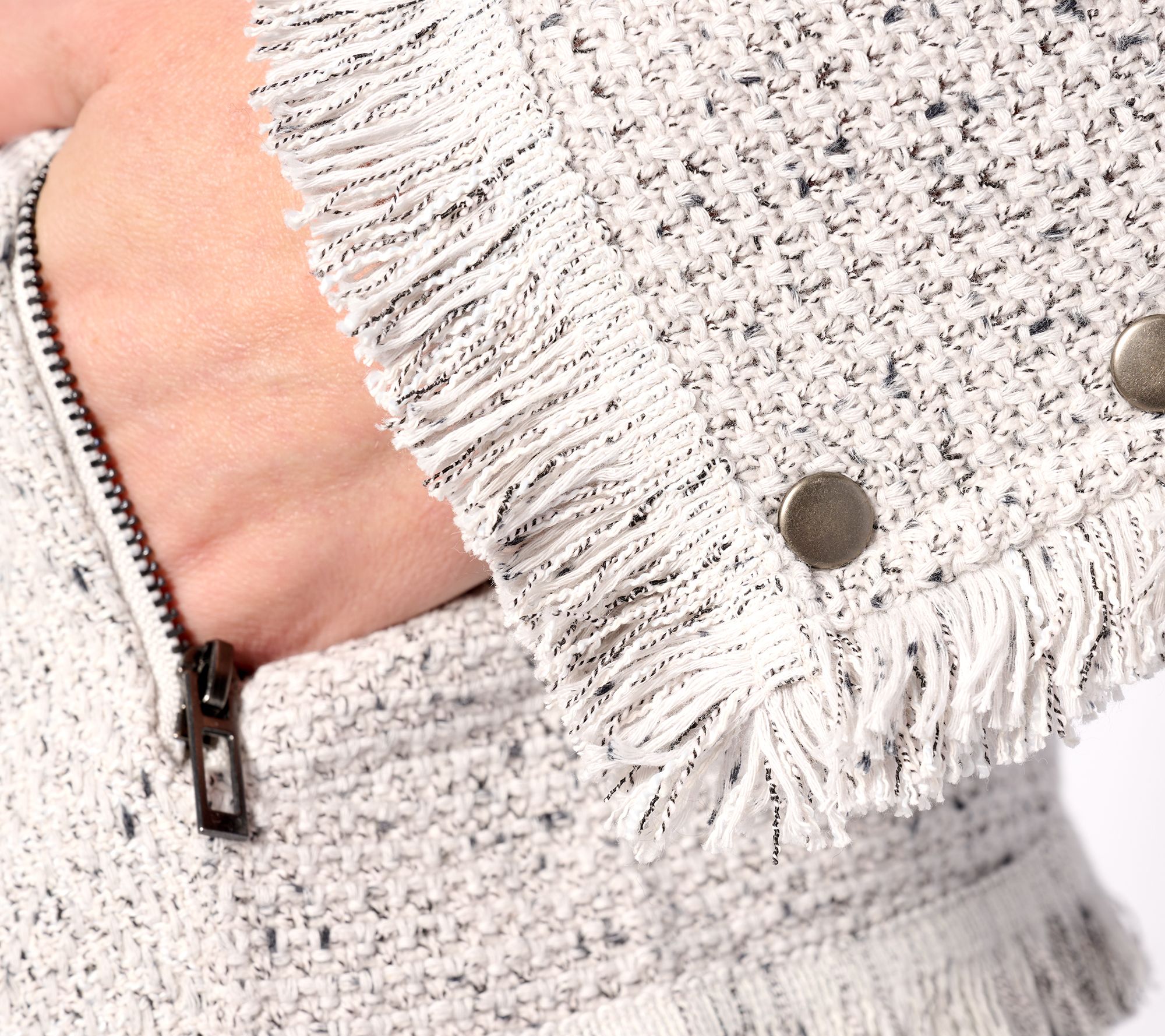 Look effortlessly chic in this knit jacket has that the look of classic tweed. Finished with a fringe trim, this topper will be your number one pick for the season. From Nic + Zoe.
