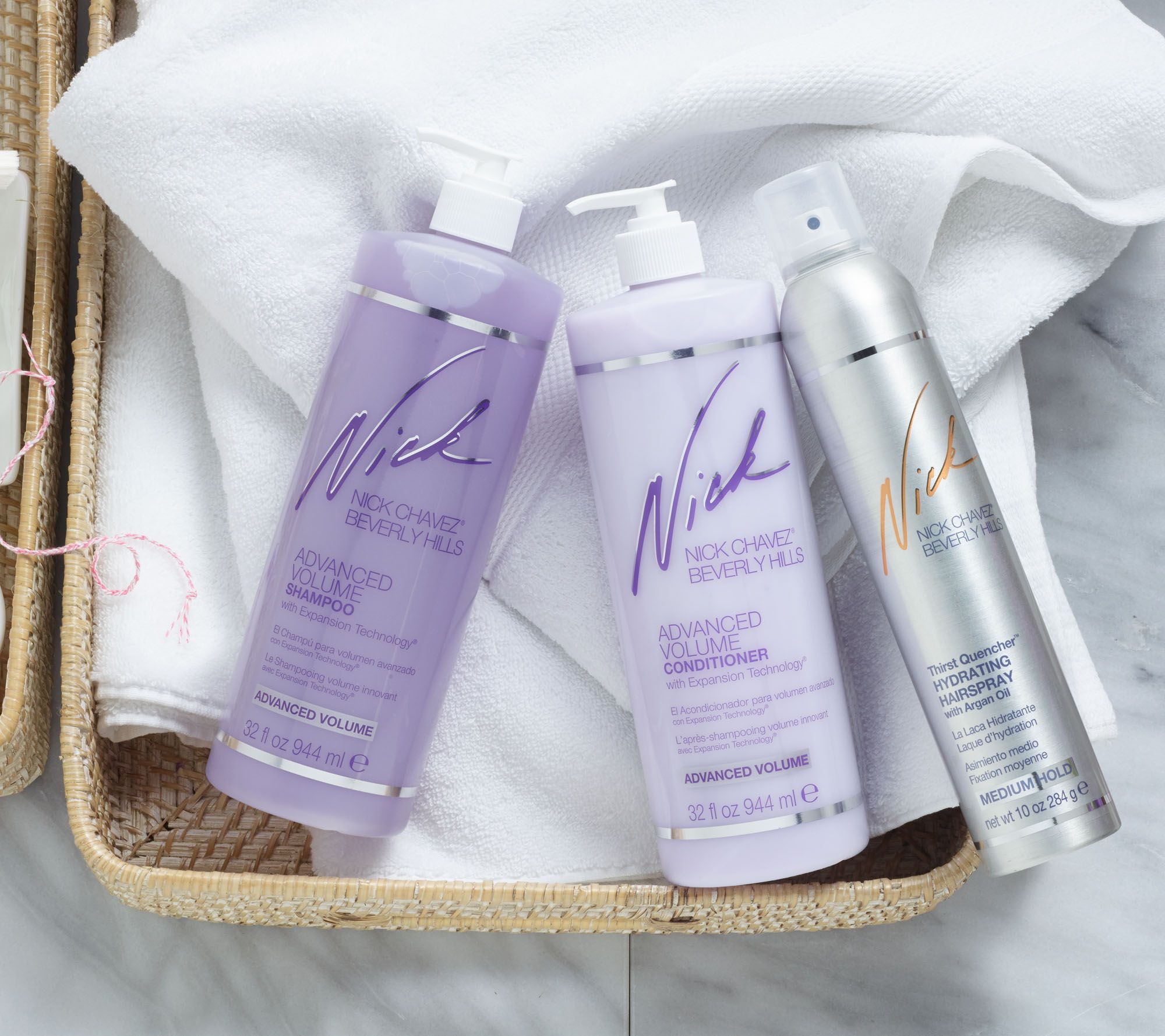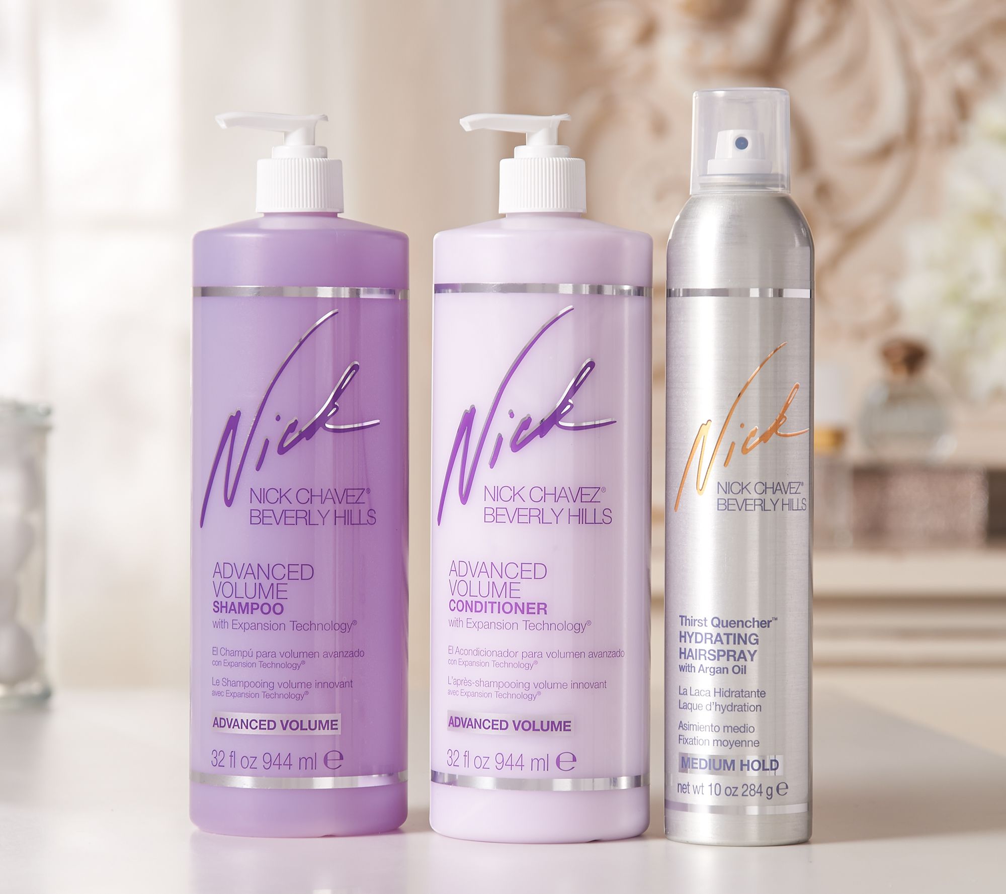 Cleanse, condition, and moisturize your hair while keeping it manageable with this set of three products from Nick Chavez. The super-size Advanced Volume Shampoo is a thoroughly modern formula designed to cleanse hair. Hair and scalp are nourished, providing the optimum environment for volume. This shampoo is formulated with an ingredient foundation called Expansion Technology, which features hyaluronic acid. It also contains keratin, soy protein, and acai berry.
