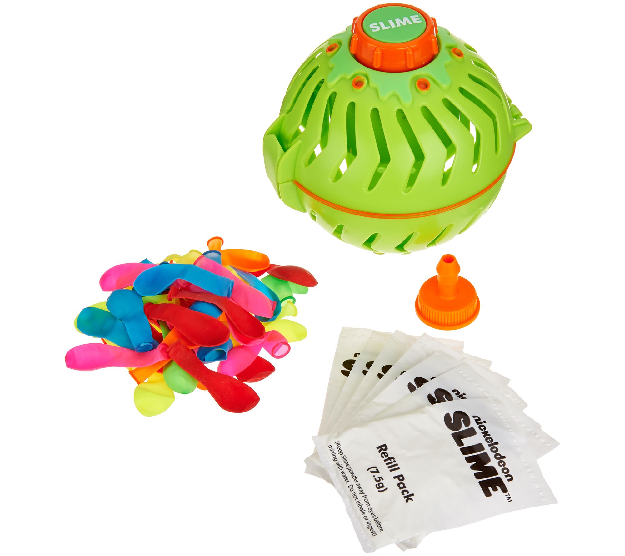 • Includes Automatic Slime Drencher with timer, seven packs of slime, 42 balloons, and balloon fill nozzle
