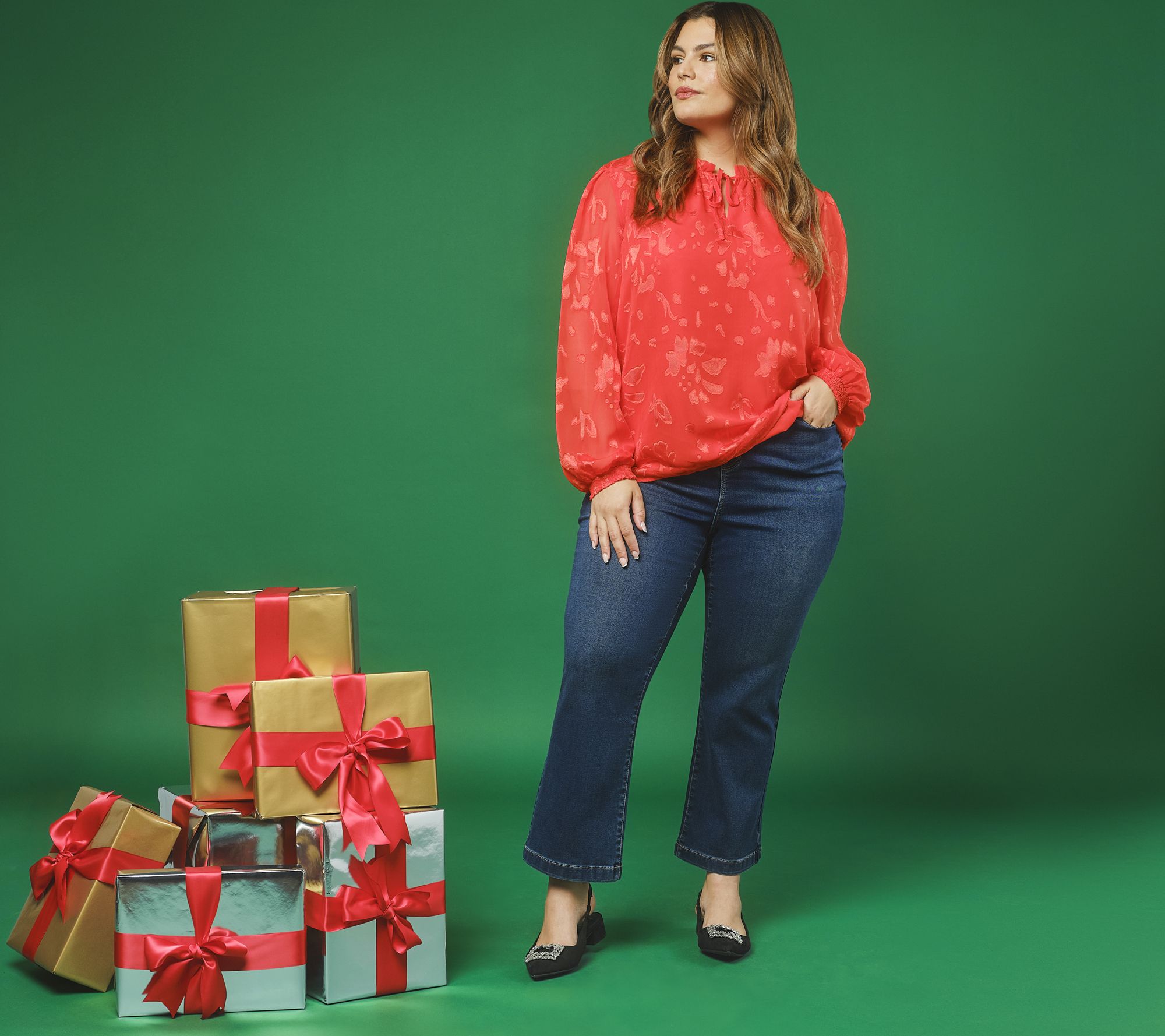 A delicate blend of airy chiffon and a knit tank lining, this blouse brings a graceful accent to busy days and dinners alike. The ruffled neckline and neck tie lend a romantic touch, while shirred long sleeves with smocked openings add soft texture. Enjoy relaxed comfort and a beautifully lined silhouette for easy, effortless wear. From nicole by Nicole Miller.