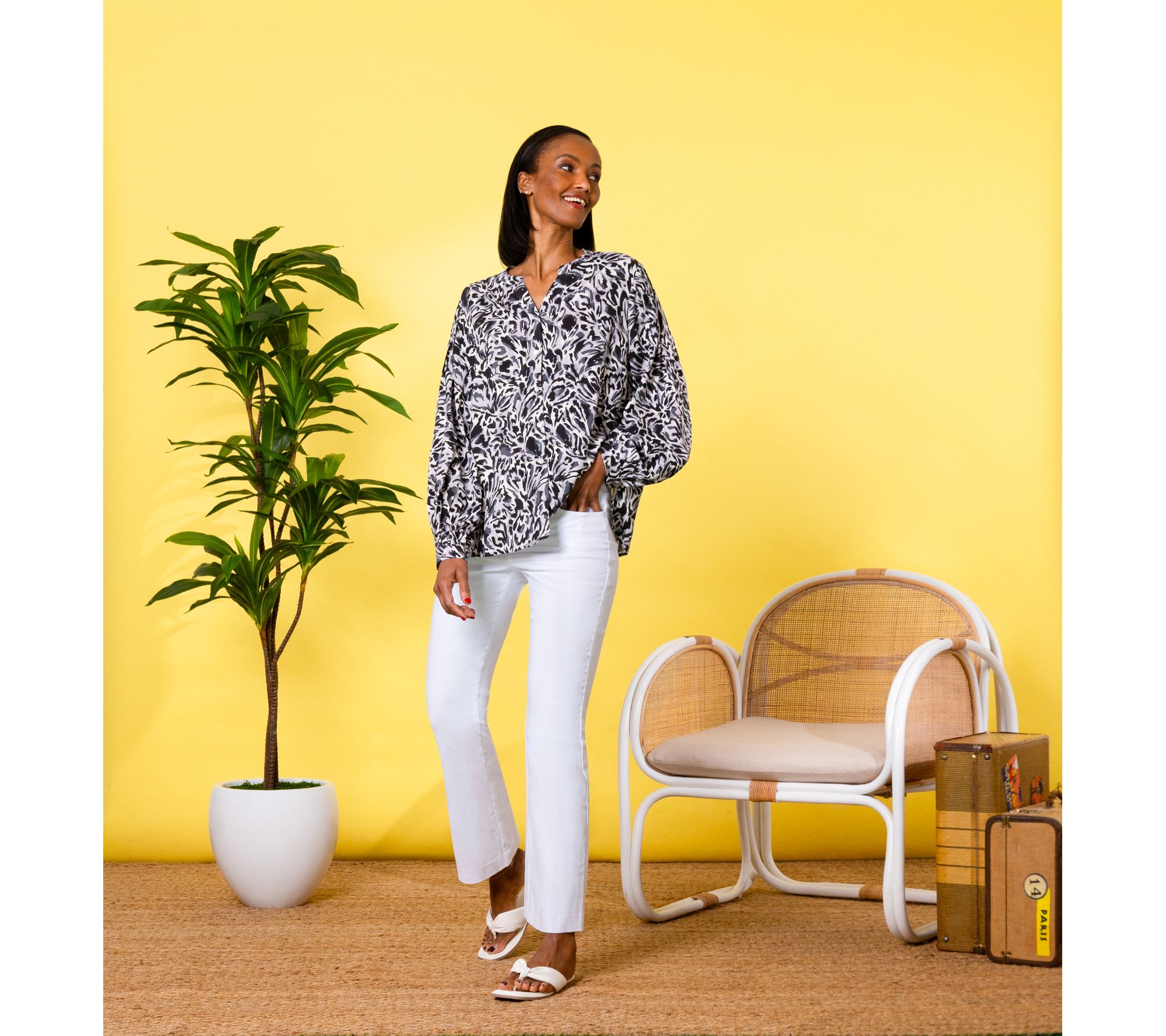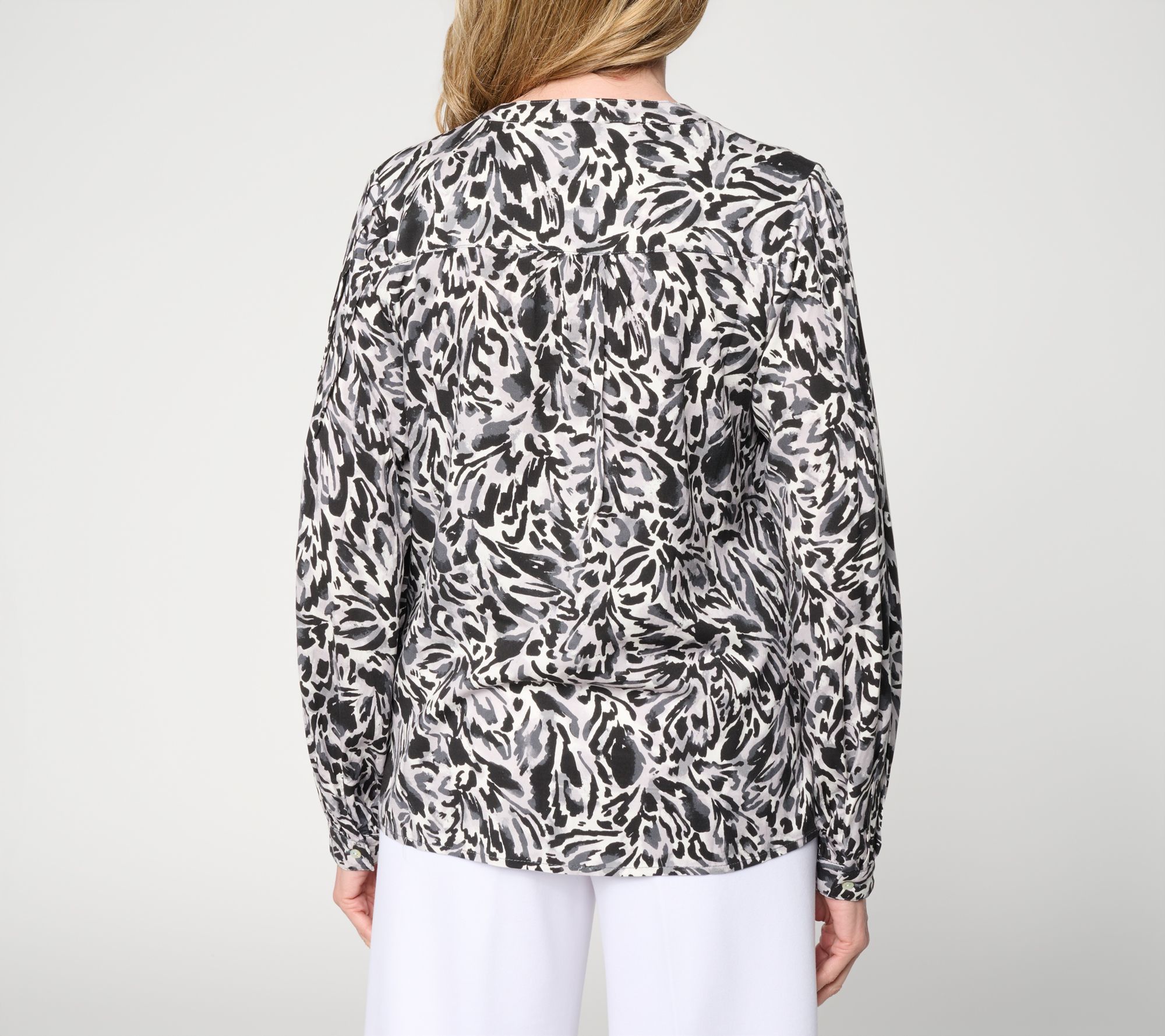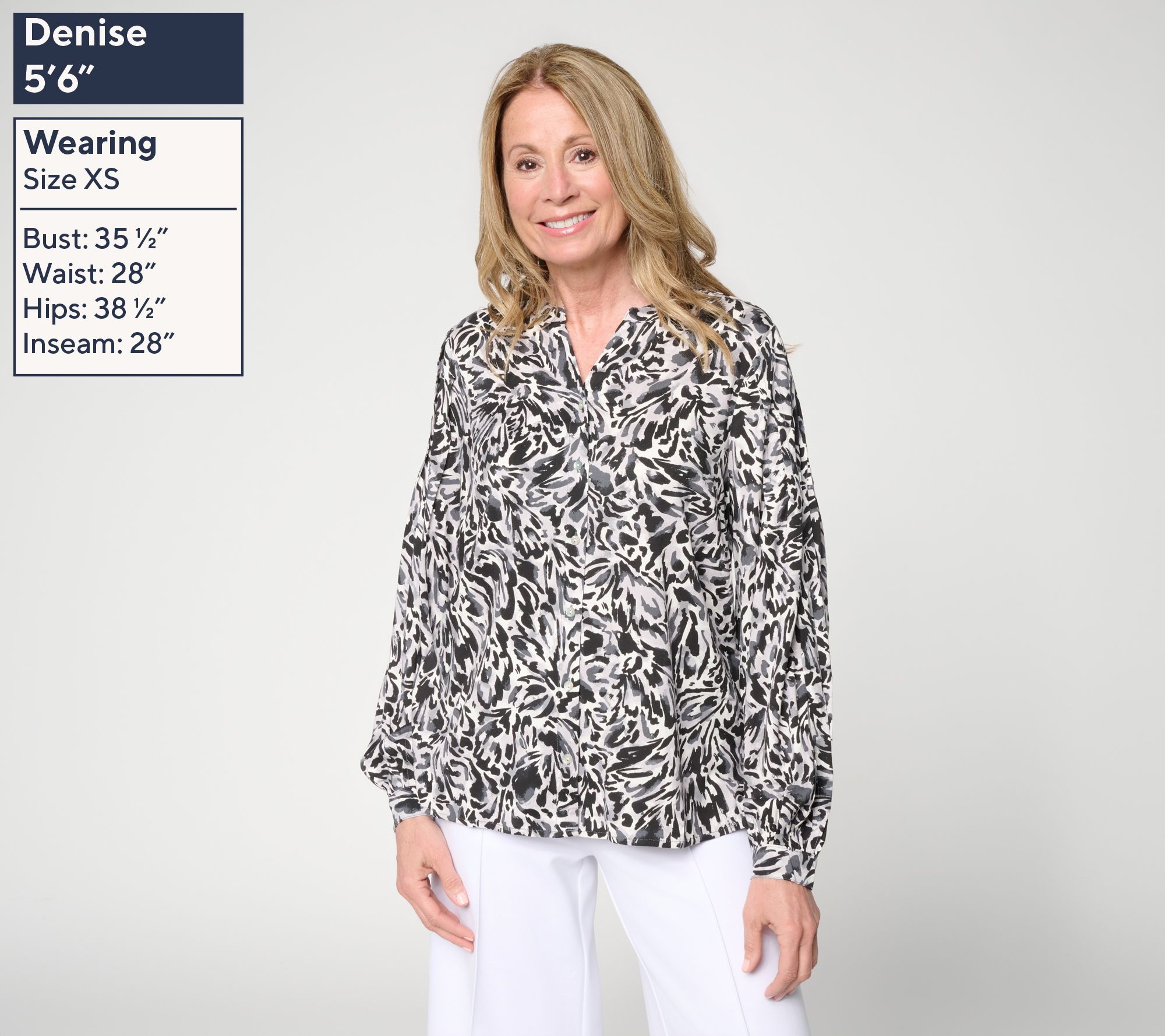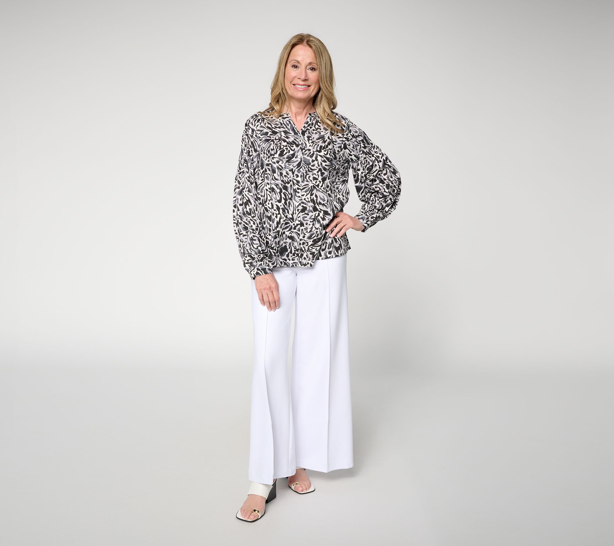 Whether paired with trousers for weekday meetings or worn with denim for downtown shopping, this stretch challis blouse lends sophistication with pleated blouson sleeves and a classic button front. Gentle gathering at the back yoke and bust darts deliver a comfortable shape that feels polished yet easygoing. From nicole by Nicole Miller.