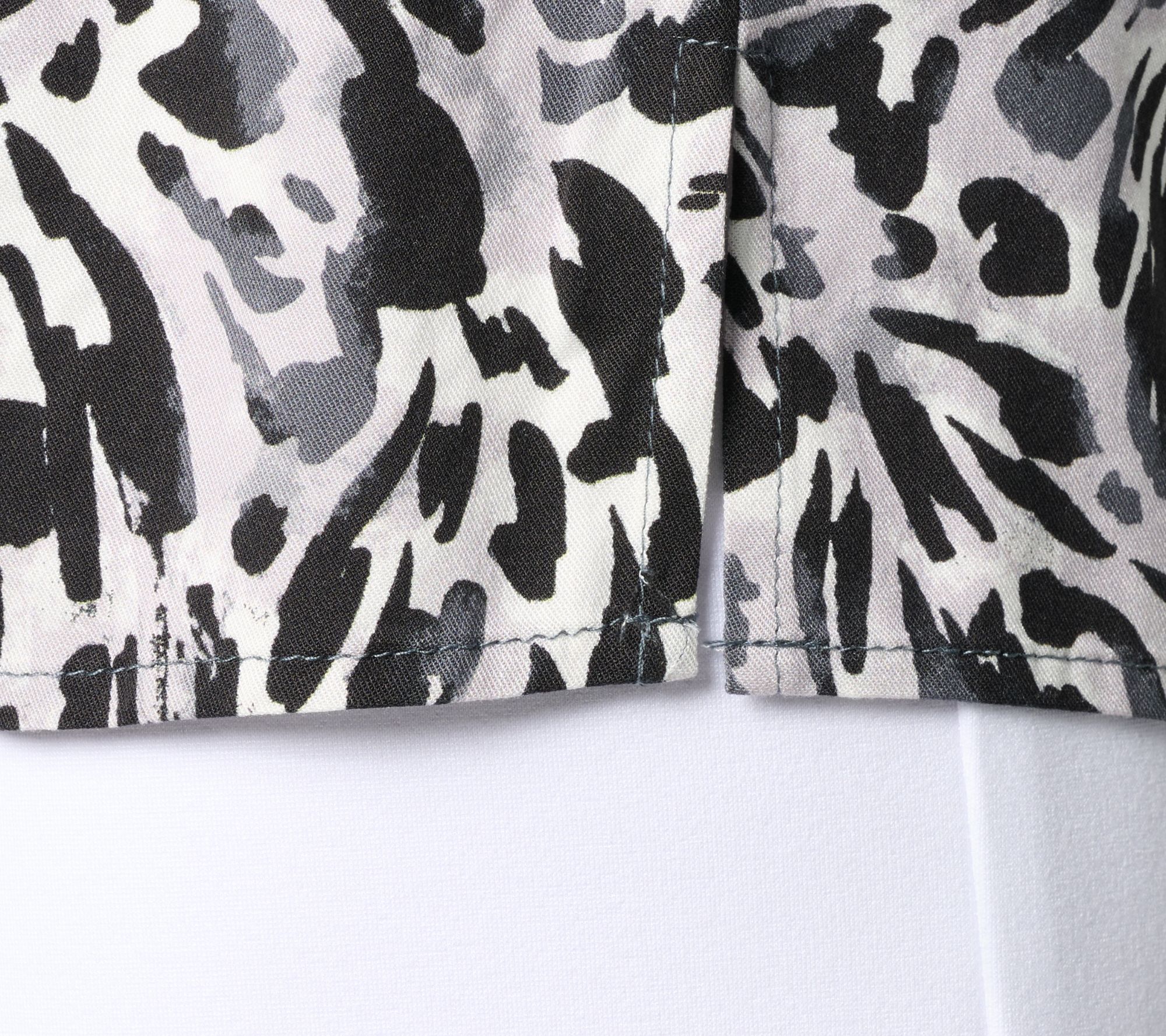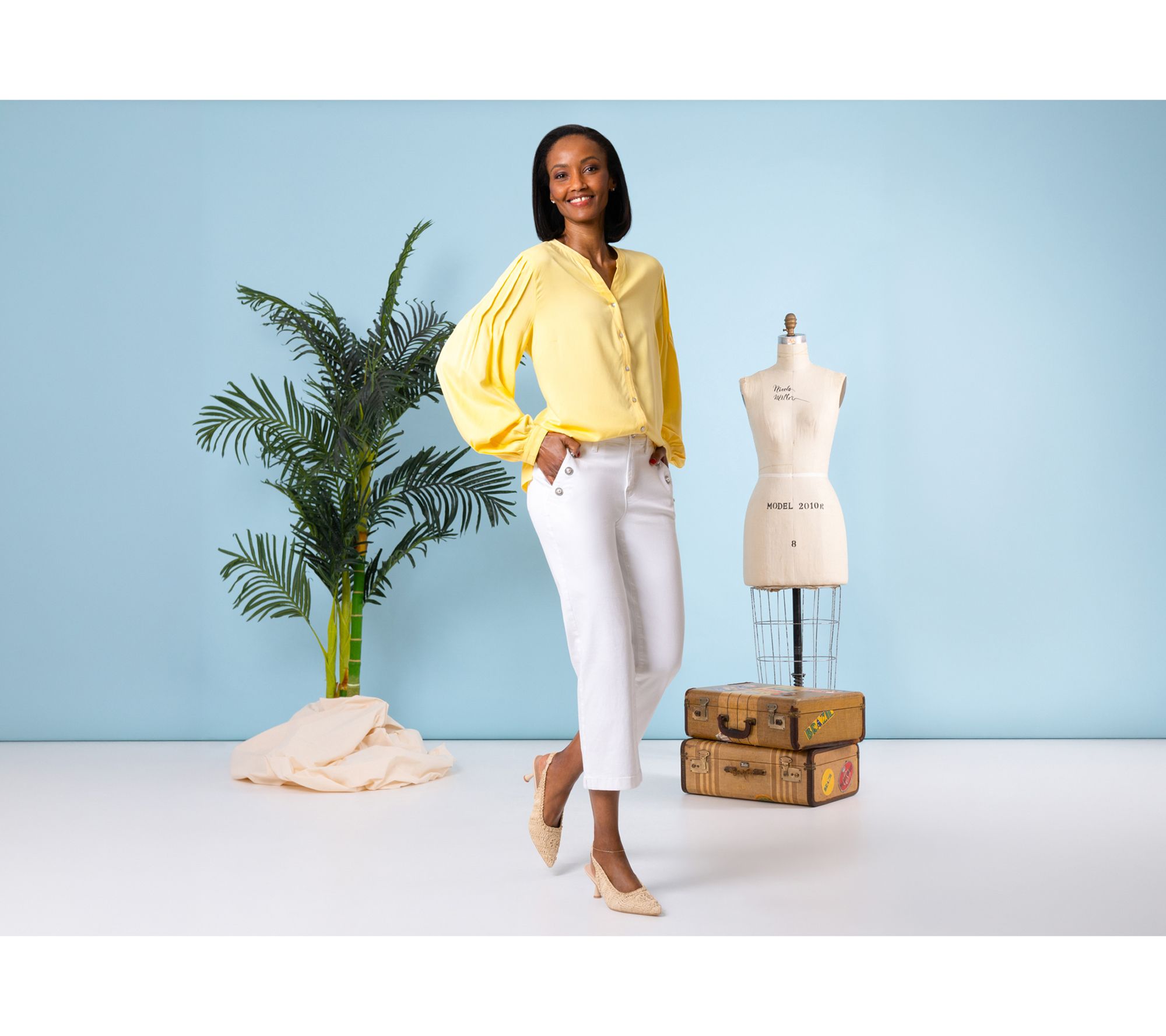 Features: V-neck, button-front, long blouson sleeves with pleat detail, back yoke with center back gathering, bust darts