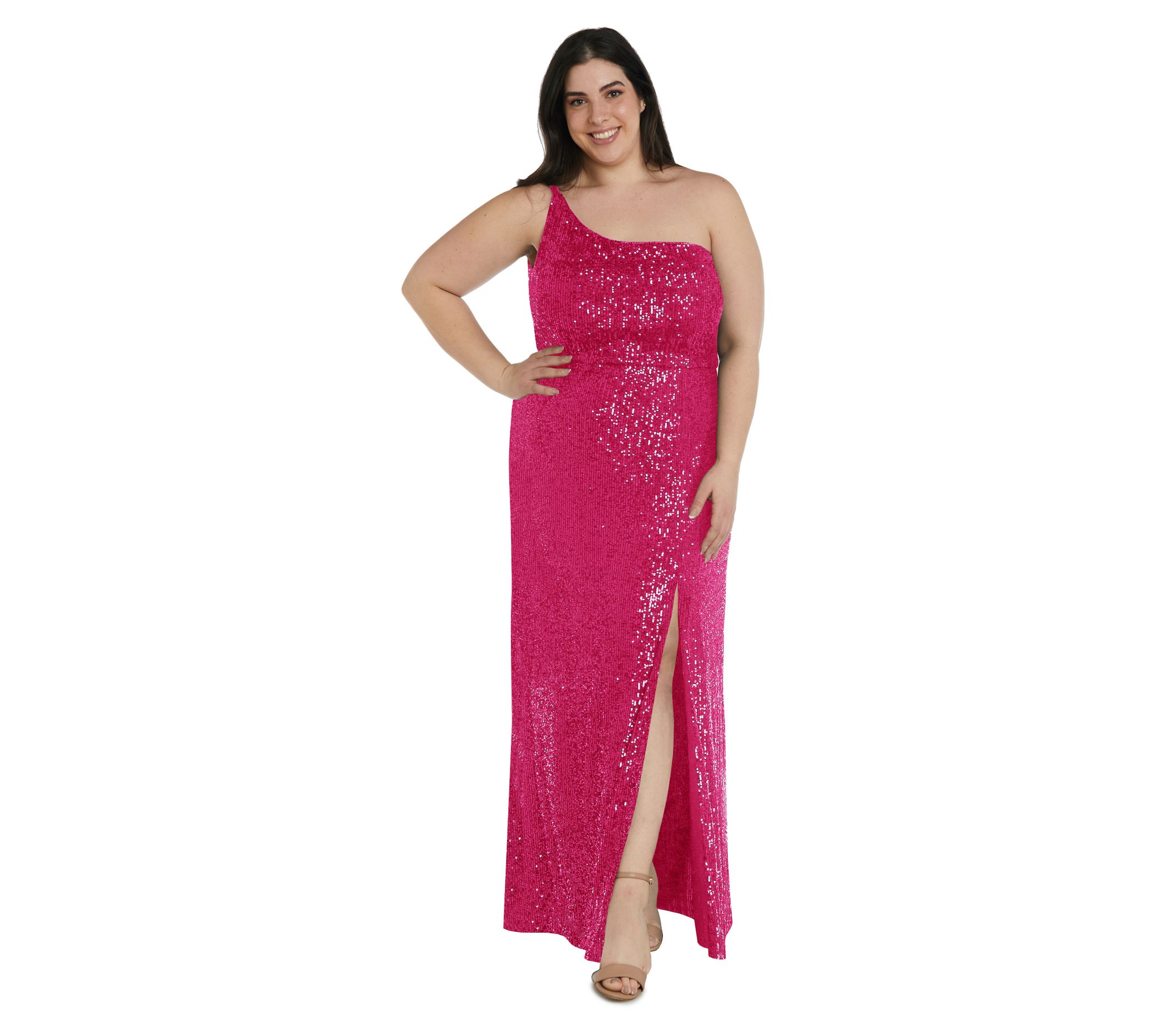 For life's more formal occasions, slip into this one-shoulder sequin dress and sizzle as you make your entrance. Complete the look with a nude heel and stun the night away. From Nightway.