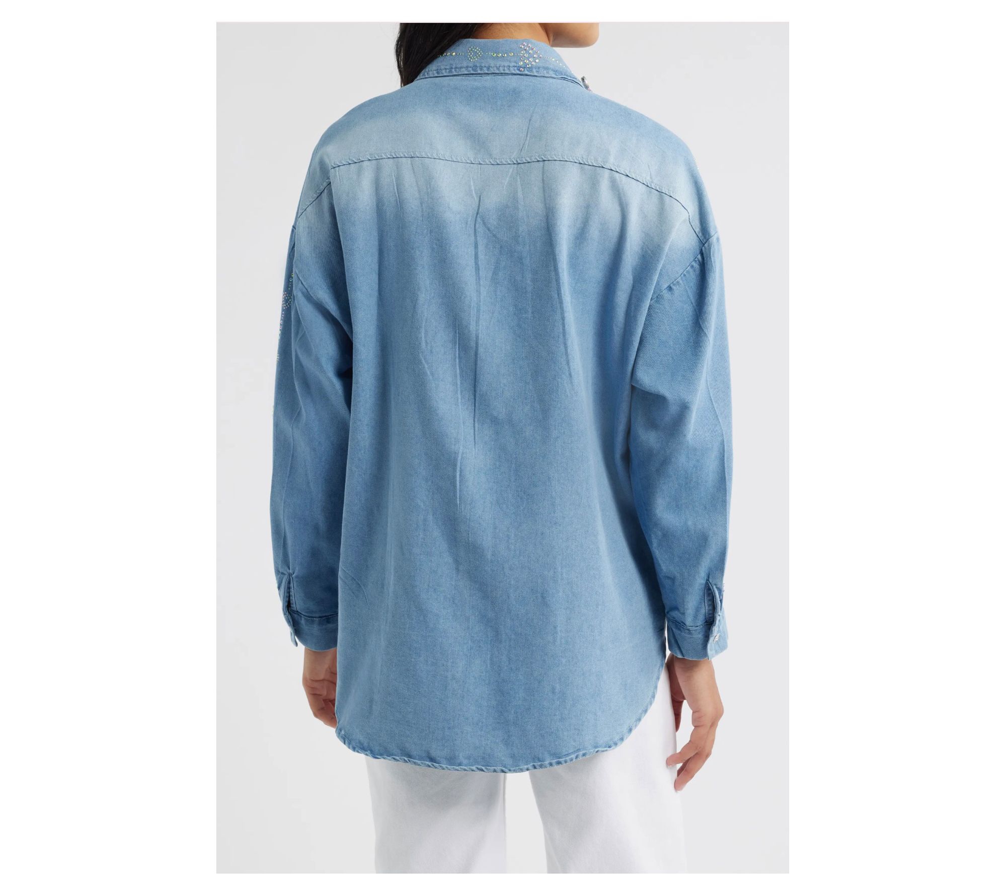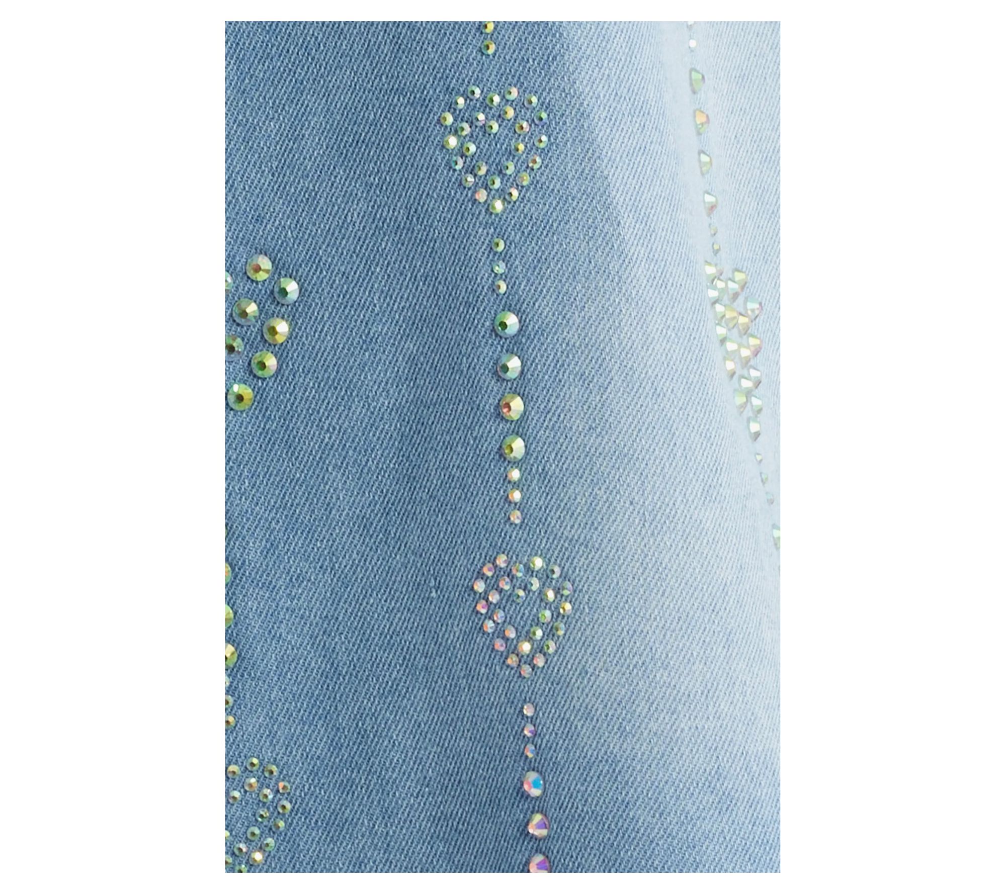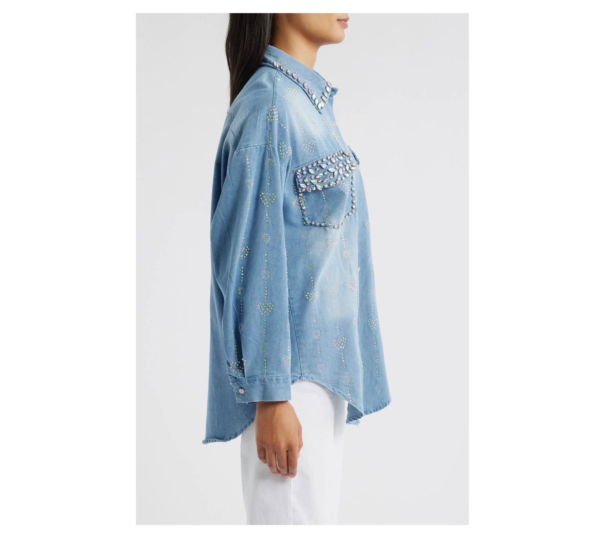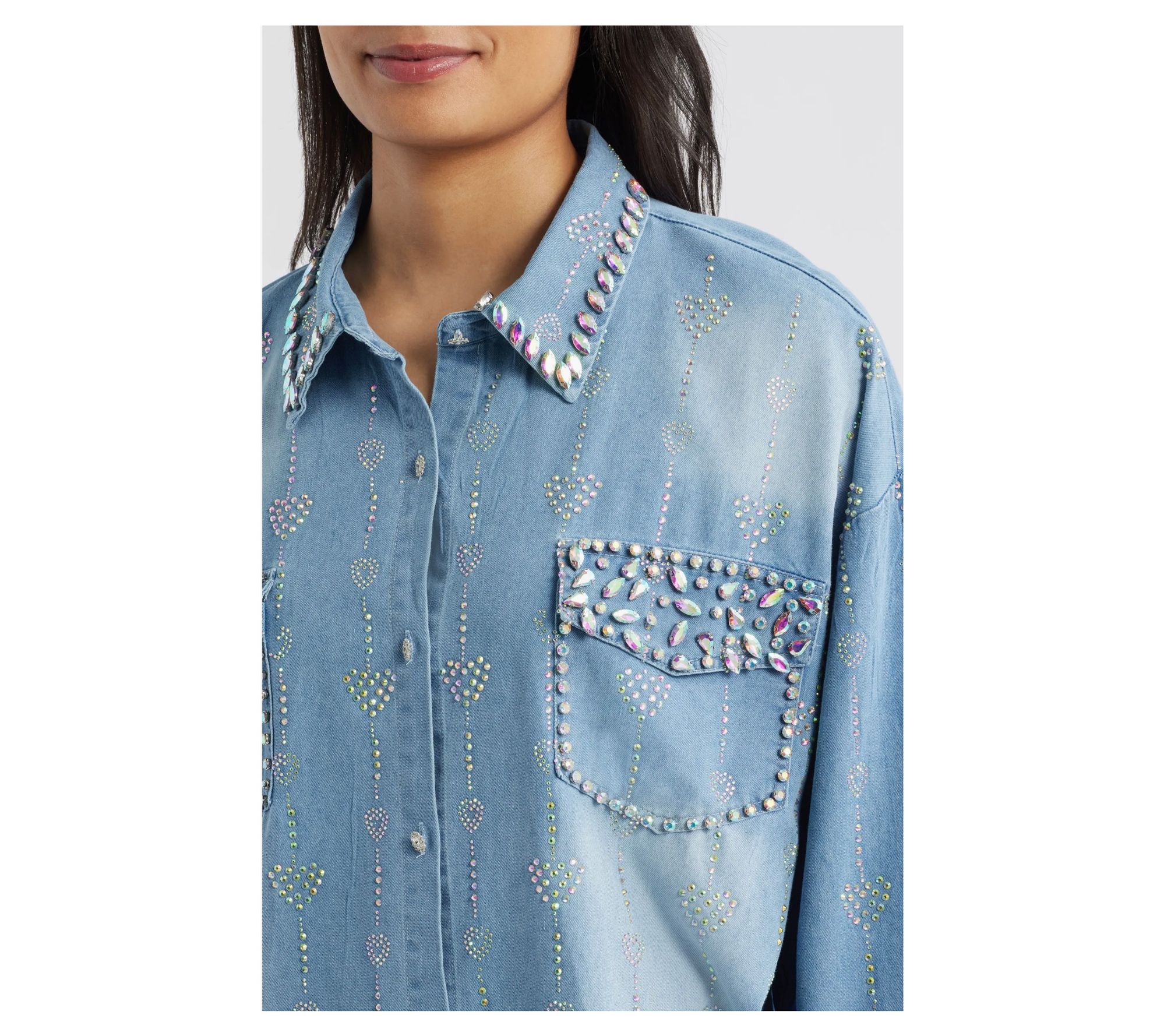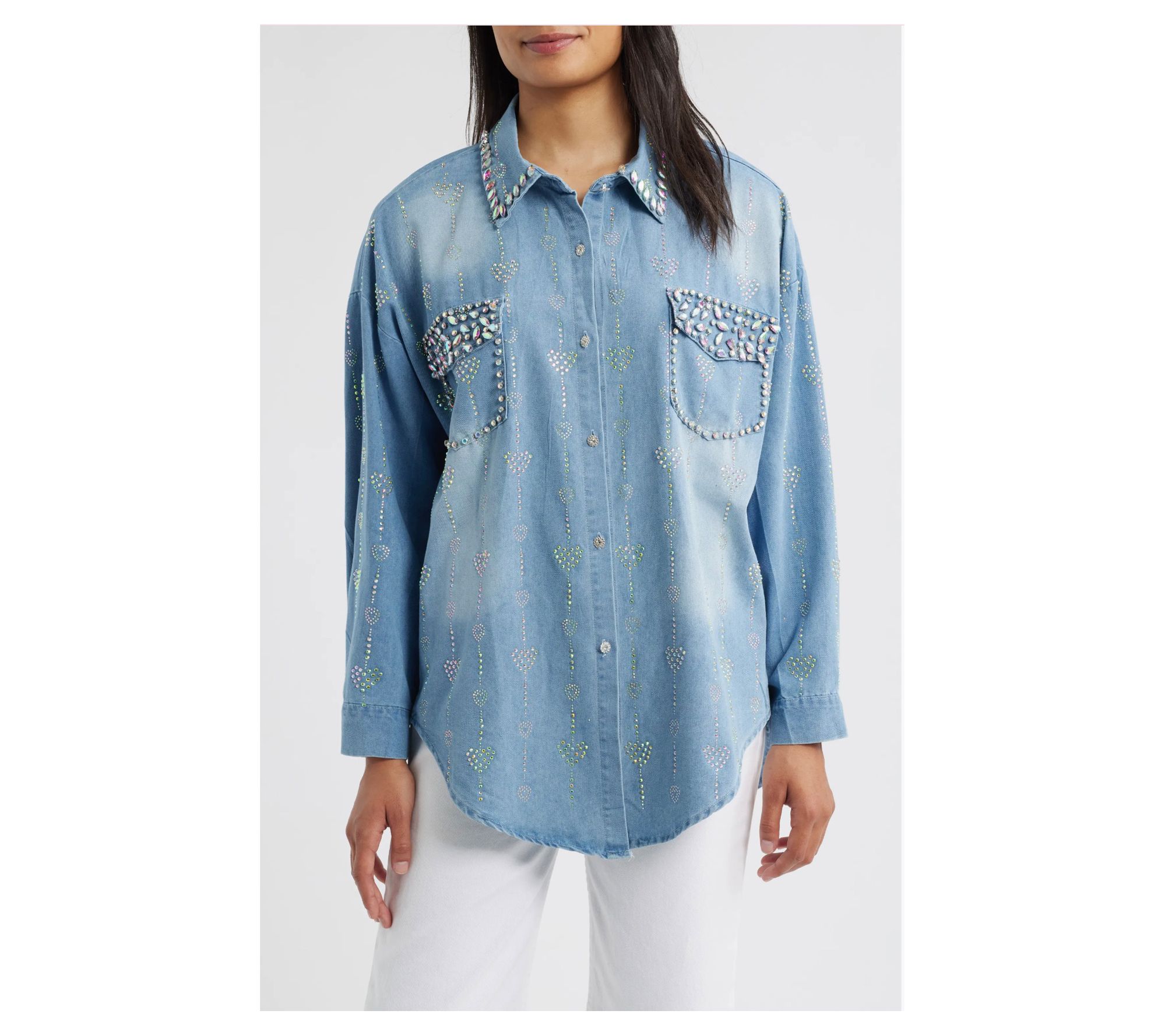 • Features: heart pattern, button-front closure, notch collar, long sleeves with button cuffs, chest flap patch pockets, rhinestone embellishments