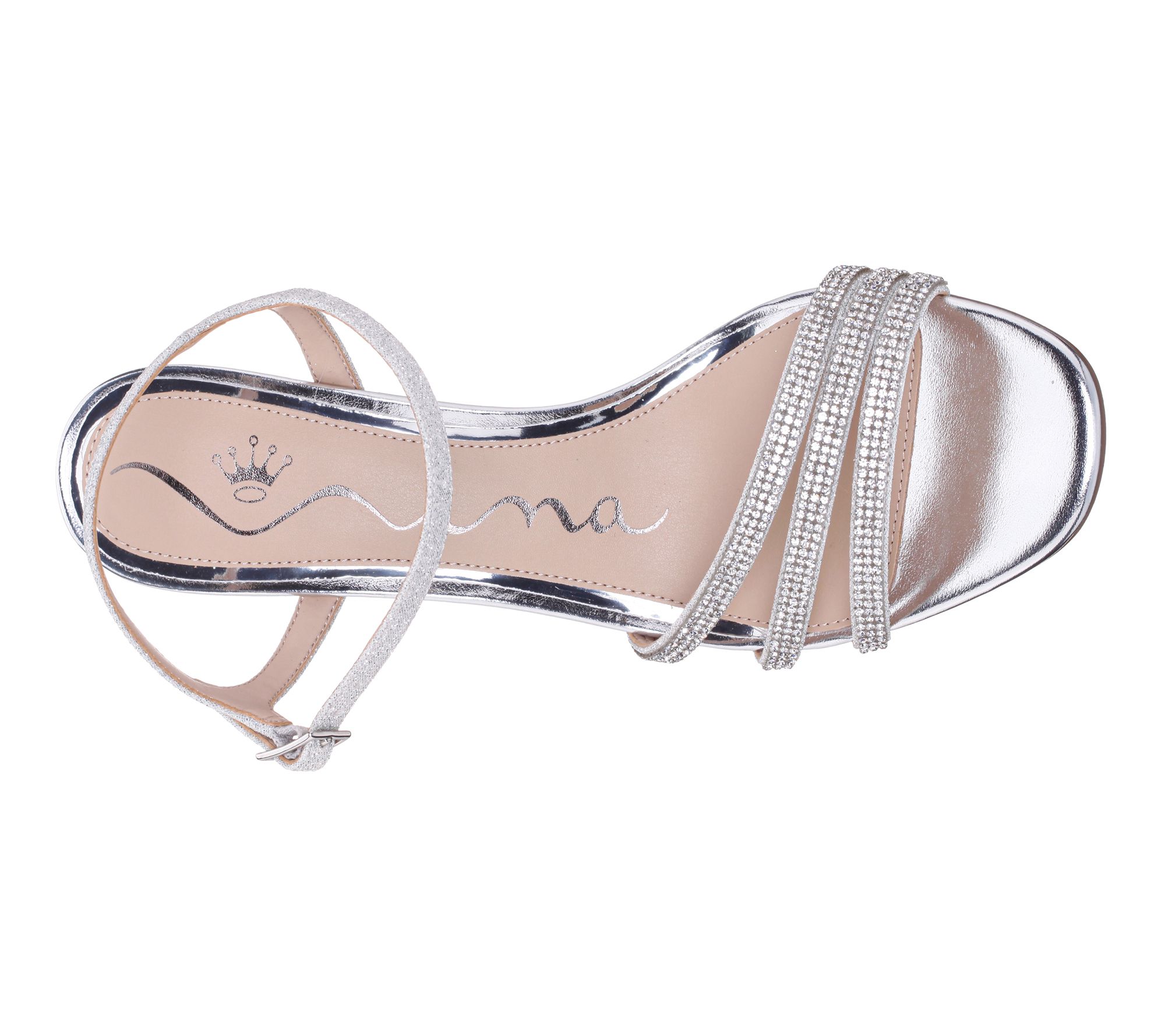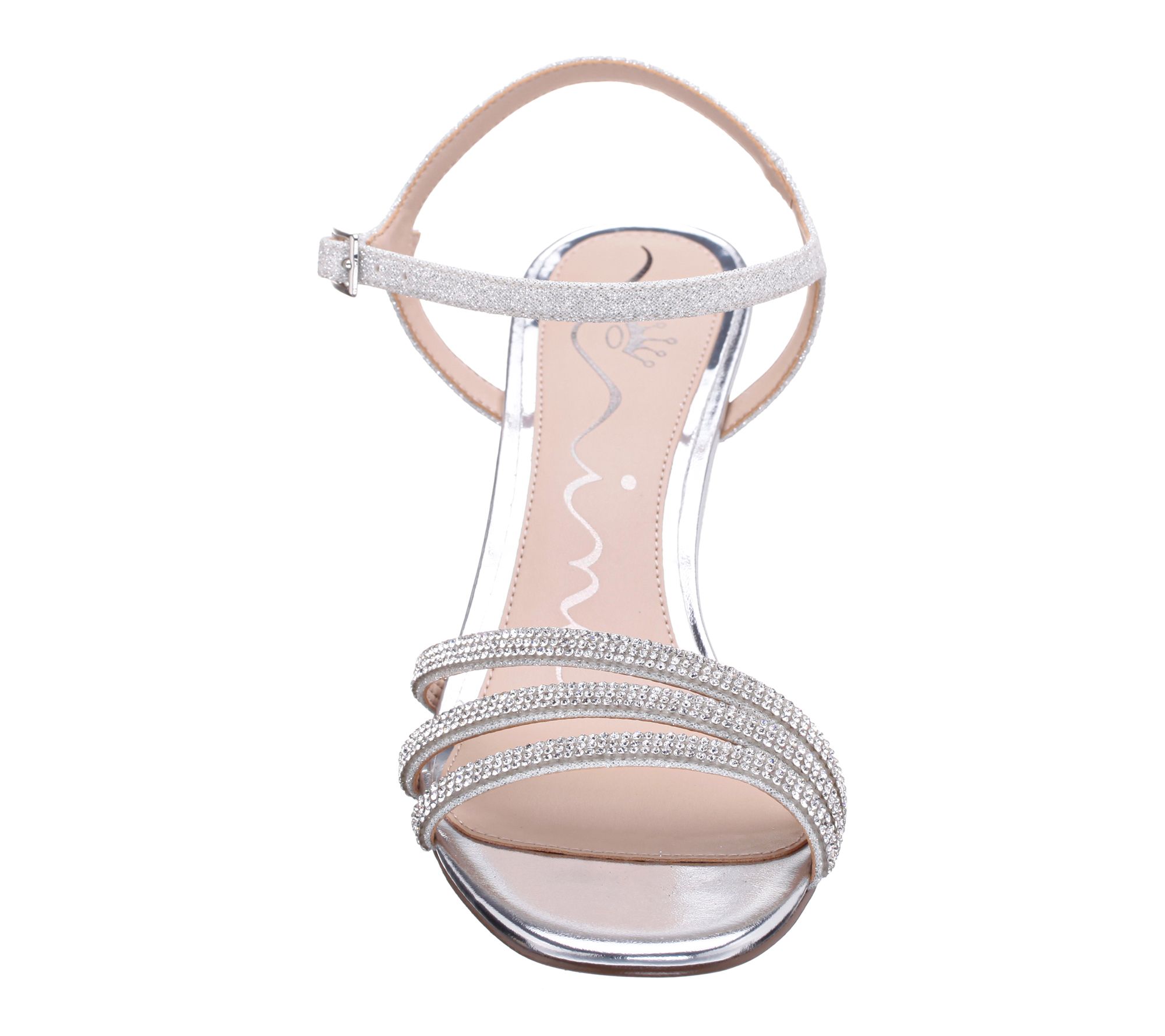 • Buckle closure; open rounded toe; trio of crystal-embellished straps; covered heel; textured metallic upper