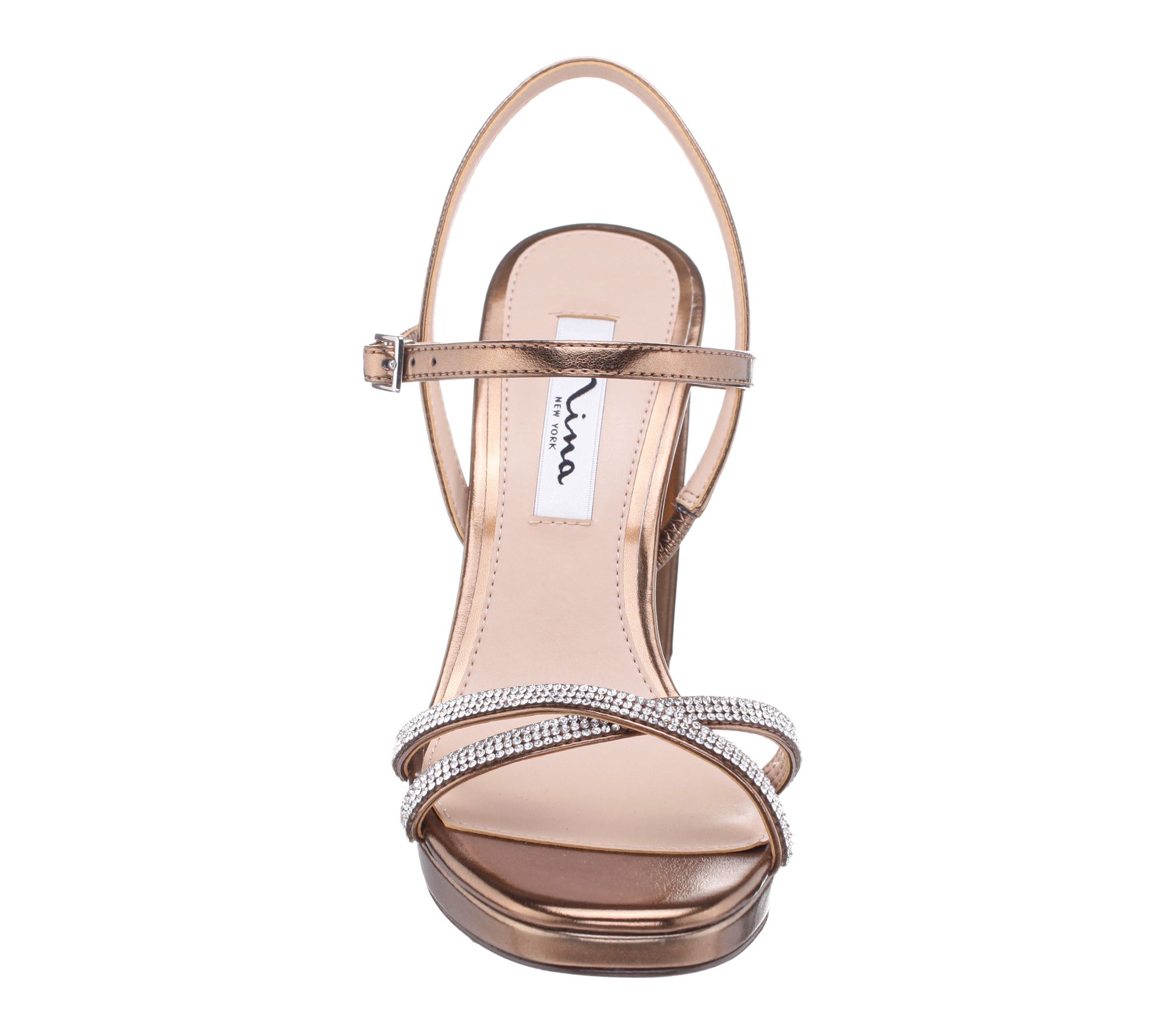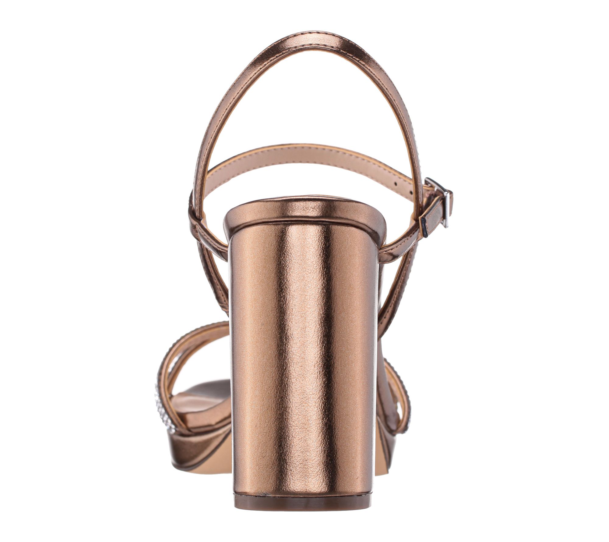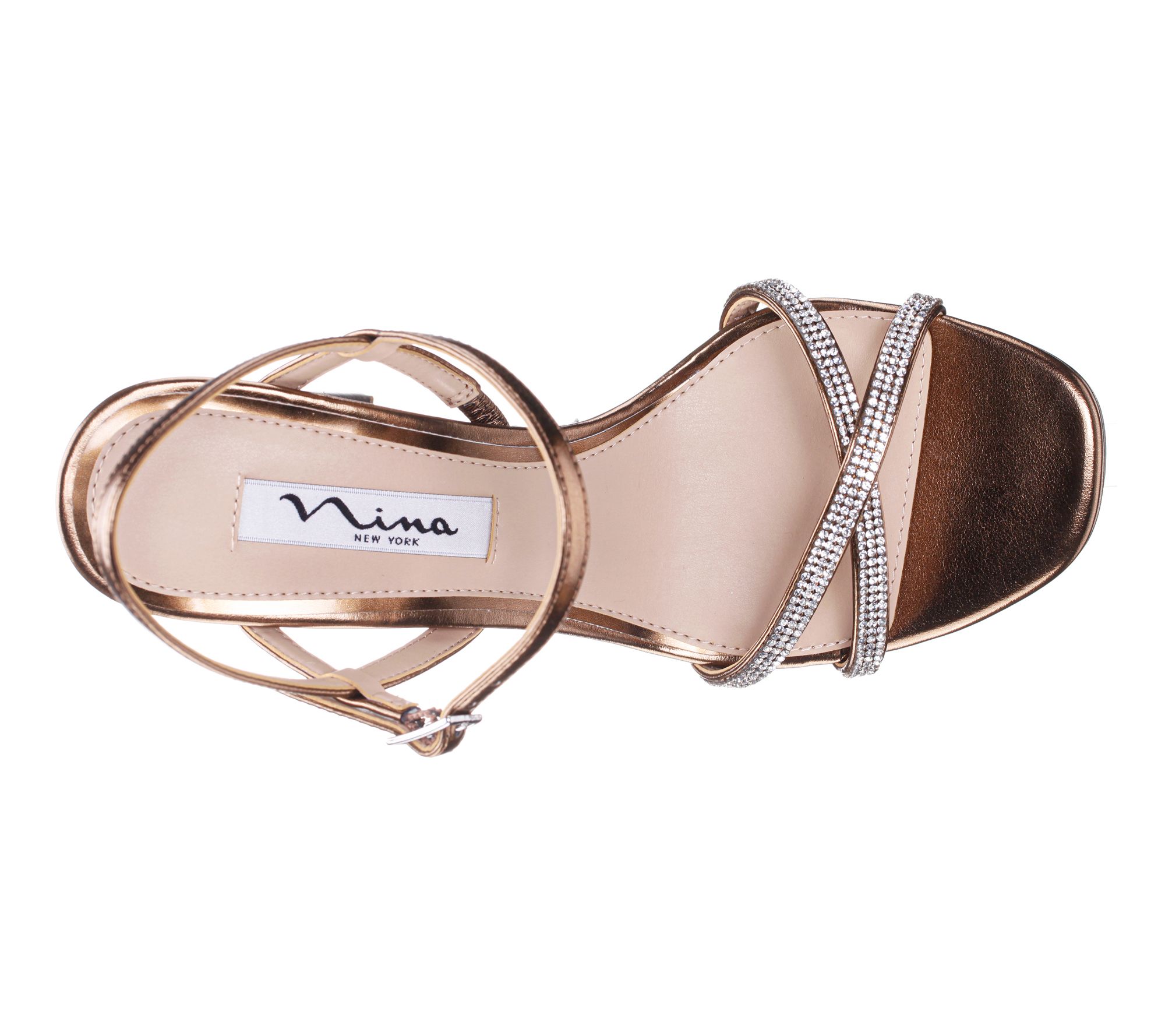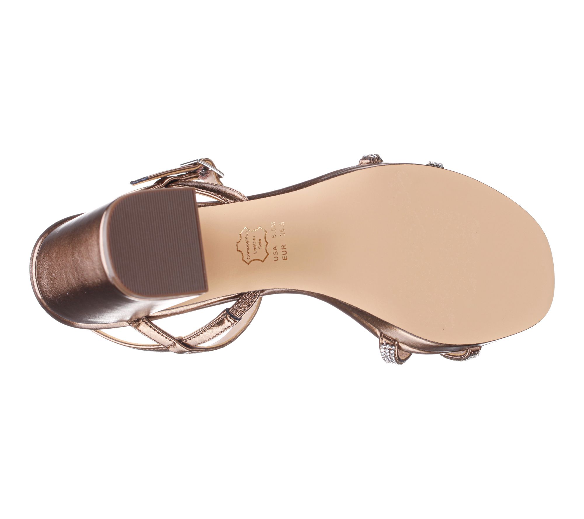 Buckle closure; rounded toe; criss-crossed toe straps accented with bling