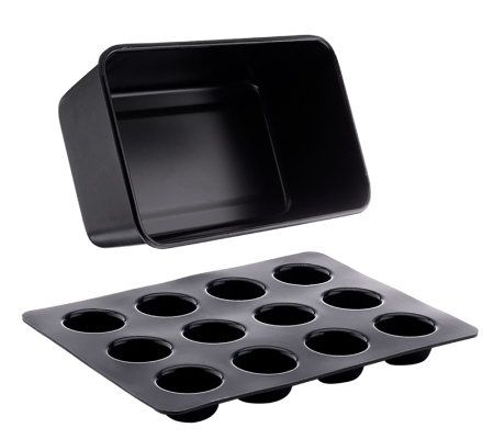 3-in-1 cooking system includes 6-quart cooking pot, dome lid, roasting rack, multipurpose baking pan, mini muffin pan, loaf pan, silicone oven mitts, and cookbook with over 150 recipes