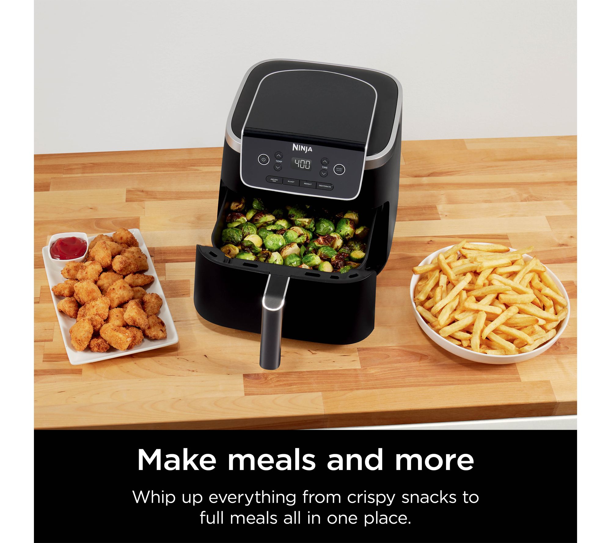 Enjoy crispy, golden snacks and meals any night of the week with this 4-in-1 air fryer, designed to deliver delicious results with up to 400F of superheated air. Cook up to 4 lbs of fries or 5 lbs of chicken wings using little to no oil, all while saving space on your countertop and breezing through cleanup thanks to its nonstick basket and crisper plate. From Ninja.