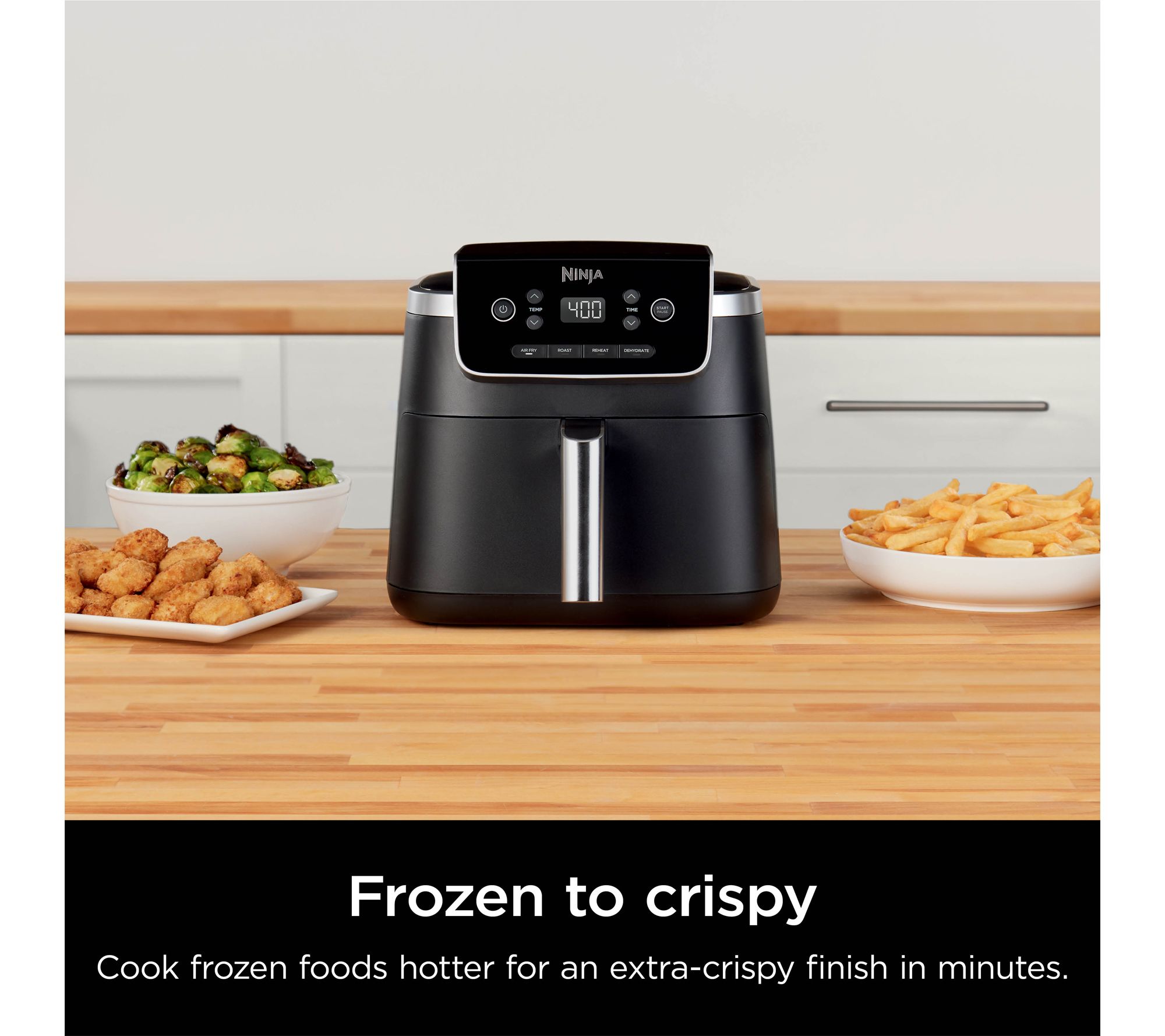 Cooks frozen foods to crispy perfection in minutes