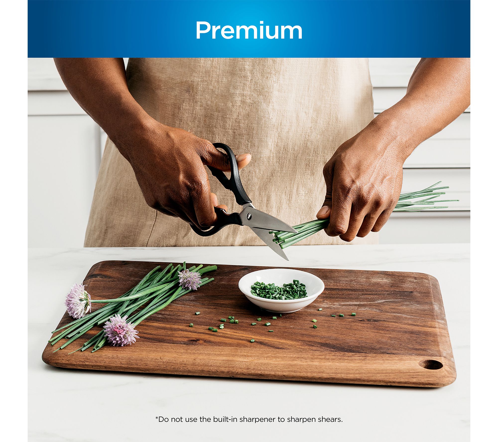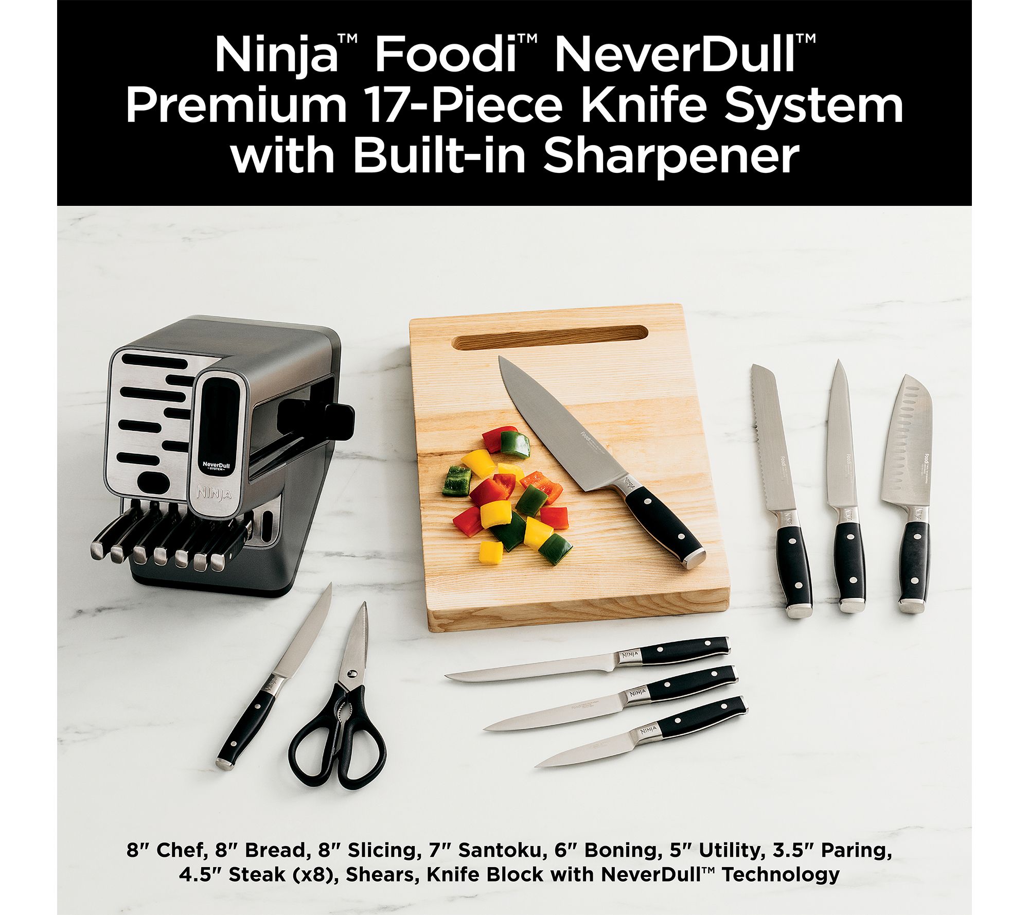 Includes 8" chef knife, 8" bread knife, 7" santoku knife, 8" slicing knife, 6" boning knife, 5" utility knife, 3.5" paring knife, eight steak knives, shears, and knife block with NeverDull Technology