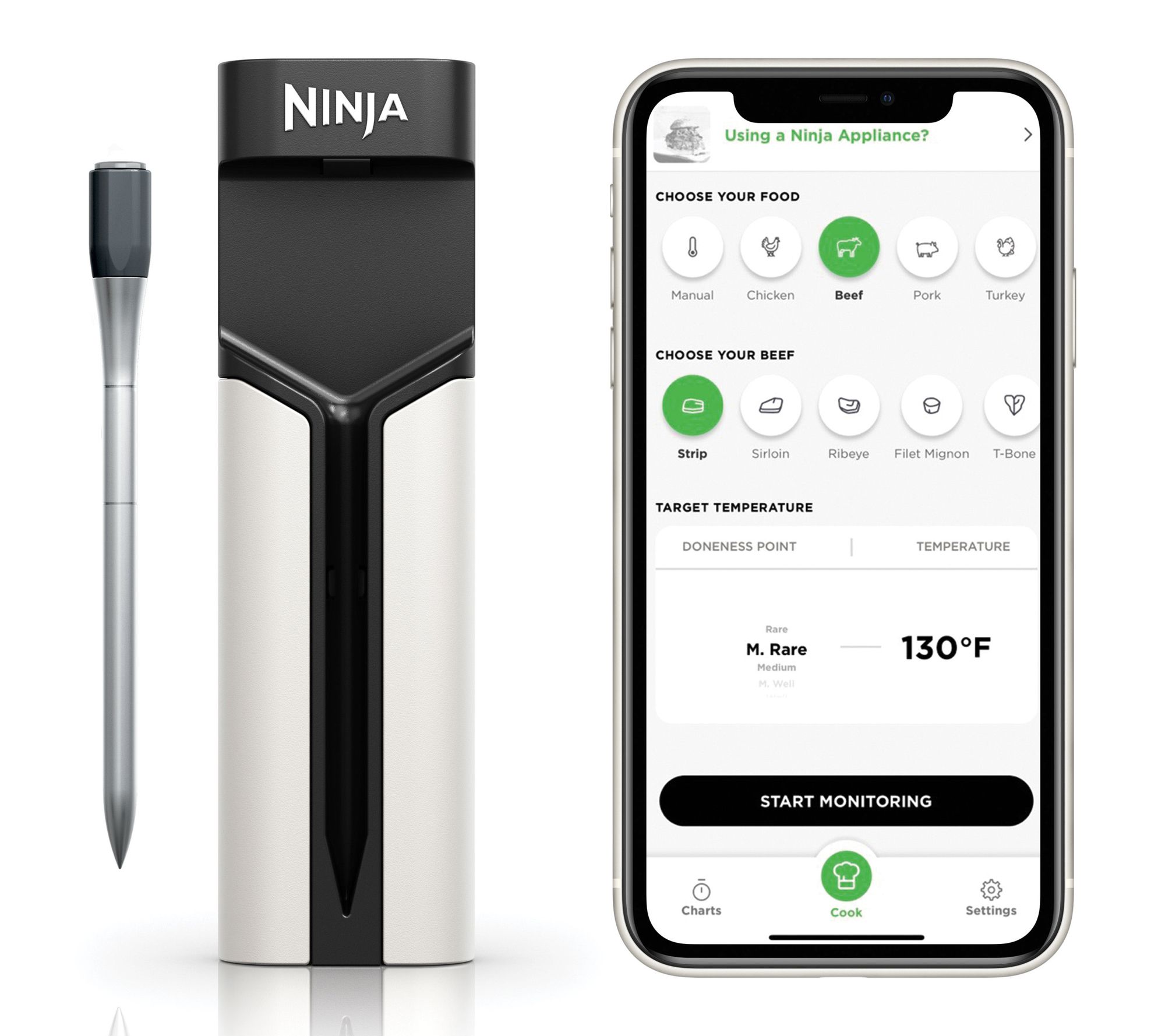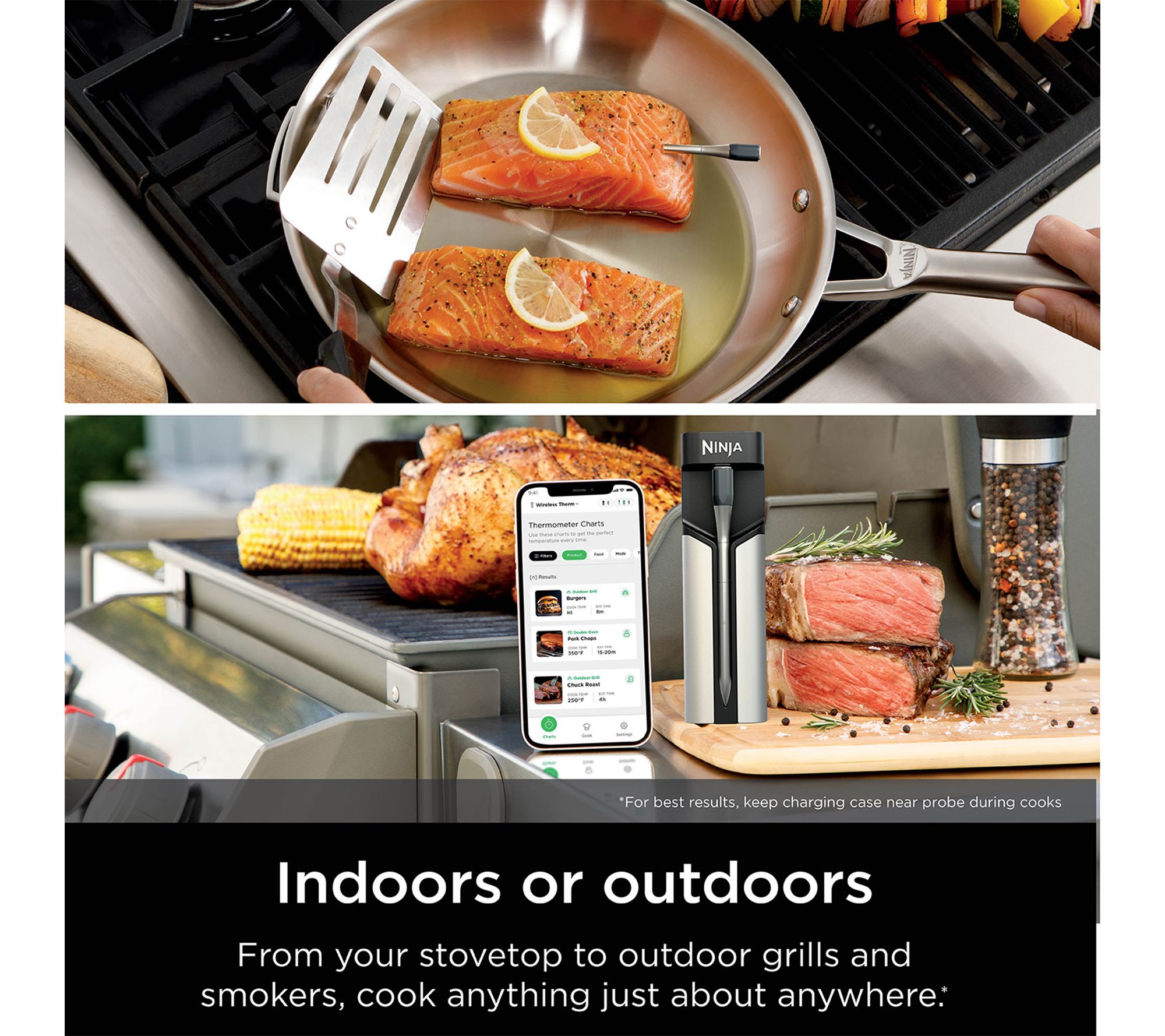 No need to babysit your barbecue. Whether grilling under the stars or roasting in your kitchen, the Ninja ProChef Wireless Thermometer keeps you in control of every cook. With app connectivity and real-time cooking updates, you can prepare expert-level meals and multitask with confidence. The thermometer's flareup-resistant stainless steel design handles high heat, while the sleek charging case stays conveniently at your side. From Ninja.