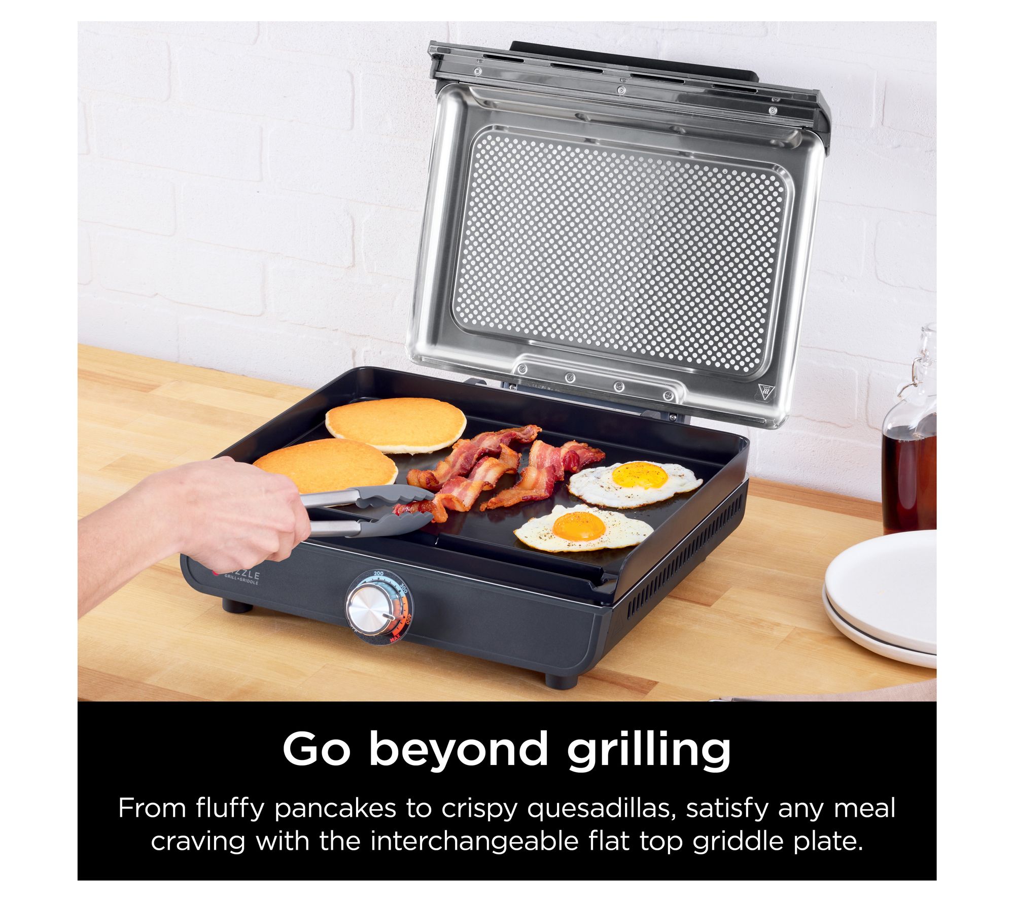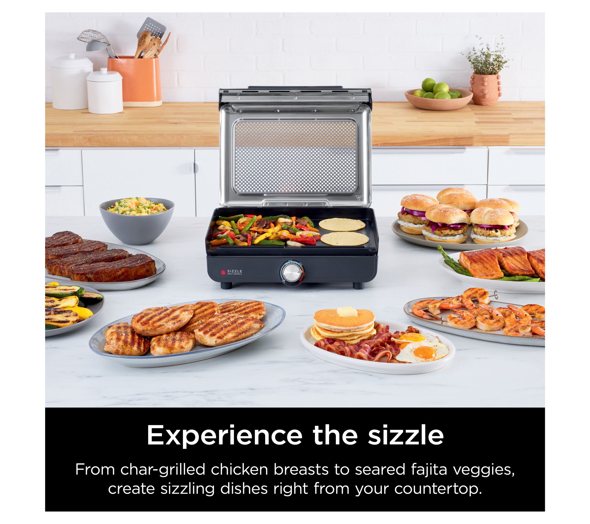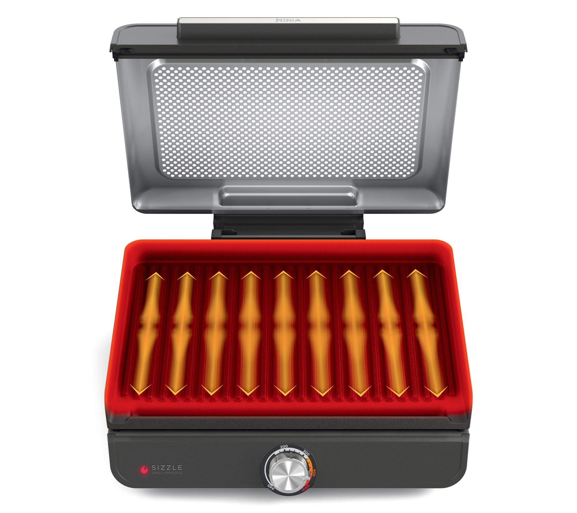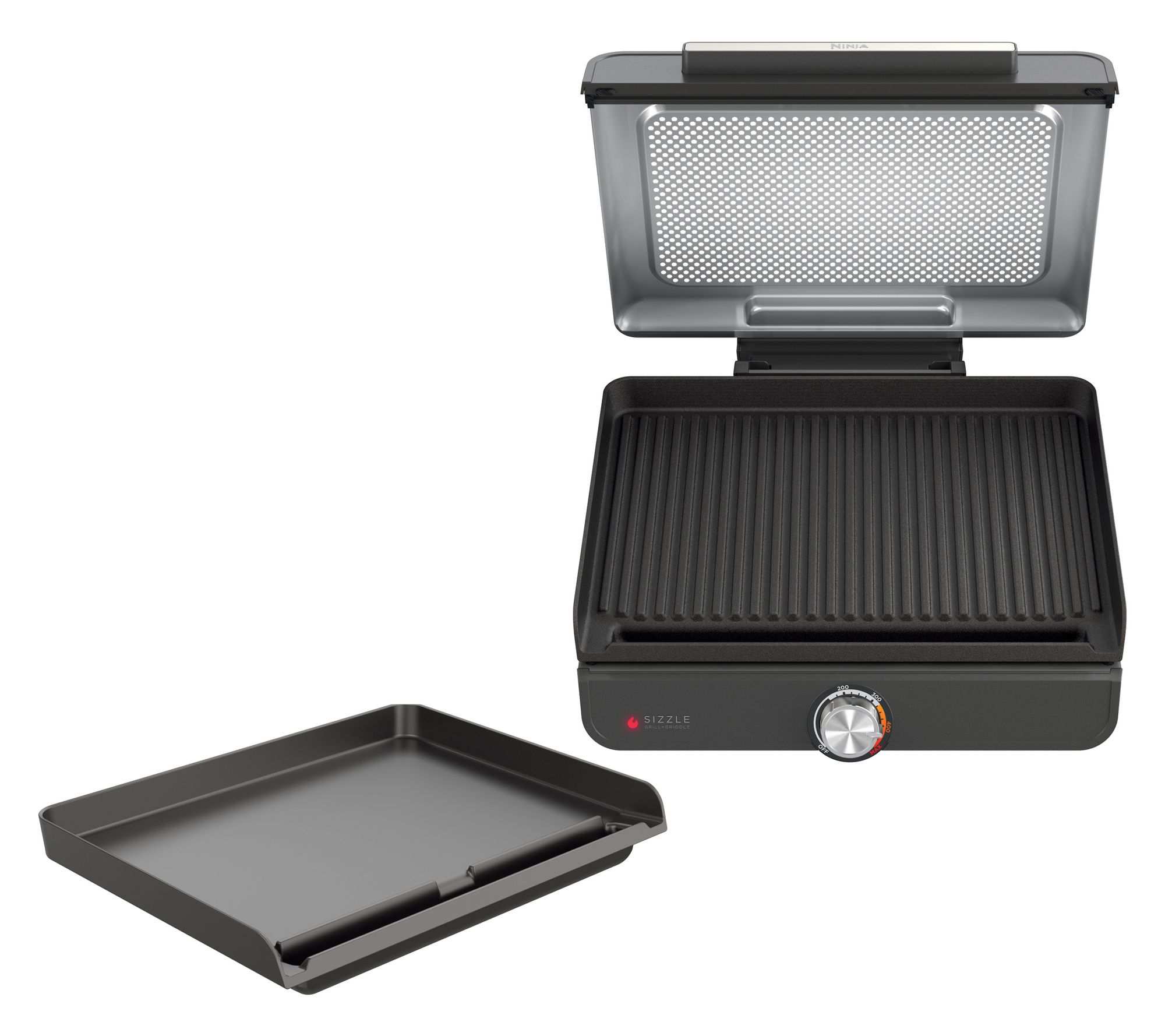 Includes Ninja Sizzle indoor grill & griddle, 14" nonstick grill plate, 14" nonstick flat-top griddle plate, and quick start guide with 10 recipes