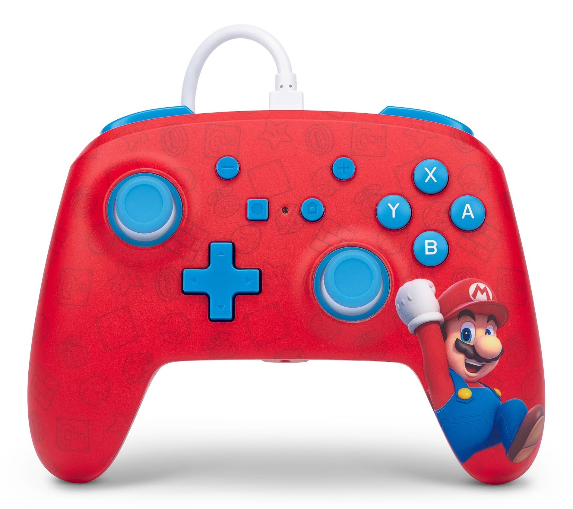Includes Switch console, Switch dock, Joy-Con L controller in blue, Joy-Con R controller in red, two wrist straps, Joy-Con grip, HDMI cable, AC power cord, PowerA wired controller, PowerA case, HORI filter; Mario + Rabbids Kingdom Battle game; and voucher