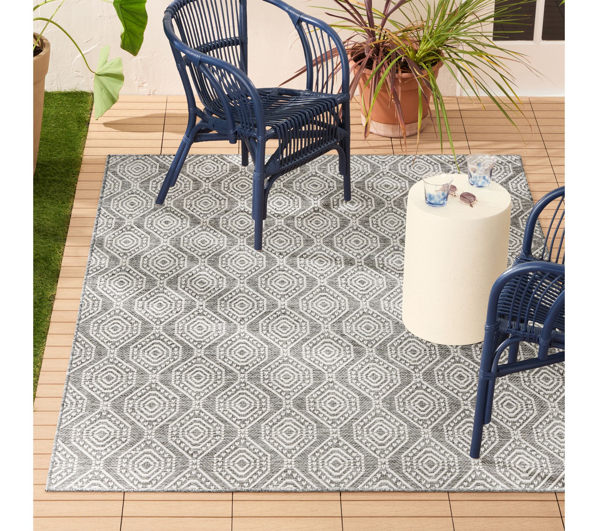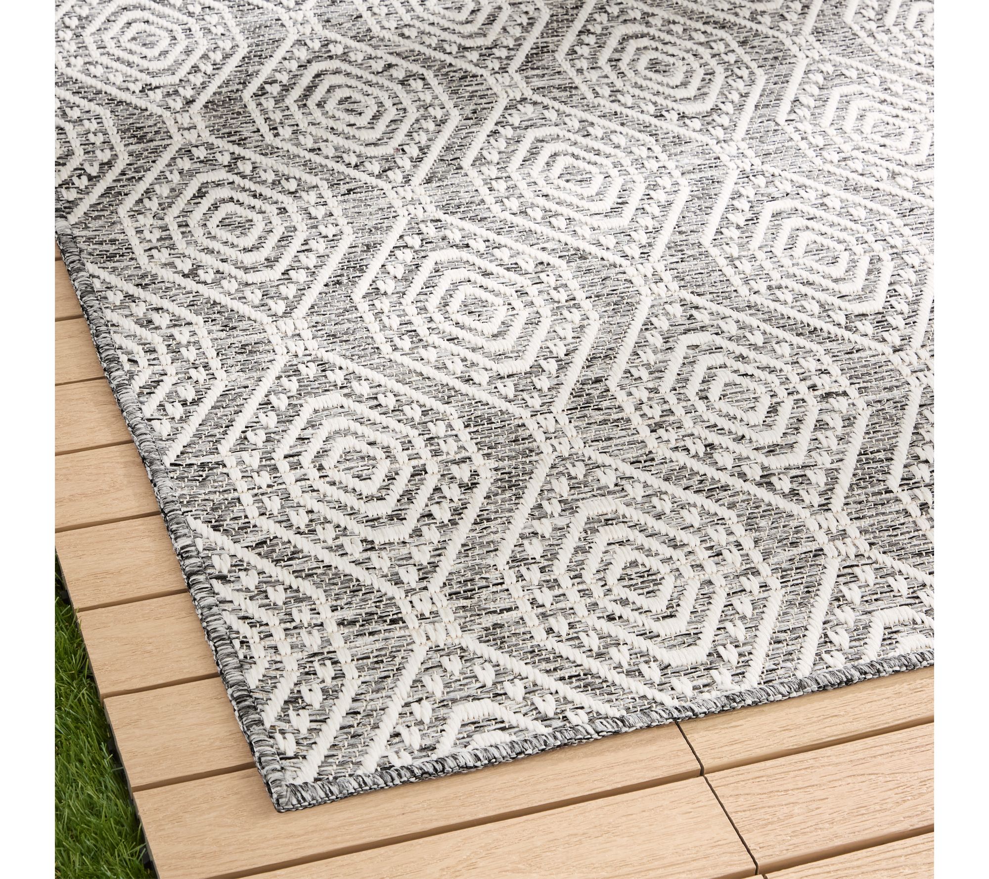Bring a fresh burst of style to your patio or living room with this indoor/outdoor rug -- its striking ogee pattern and low-pile texture create an inviting look that's easy to clean and maintain. Designed to handle high-traffic areas, this durable polypropylene rug stands up beautifully to busy family gatherings, outdoor entertaining, or everyday dining. From Nicole Miller New York.