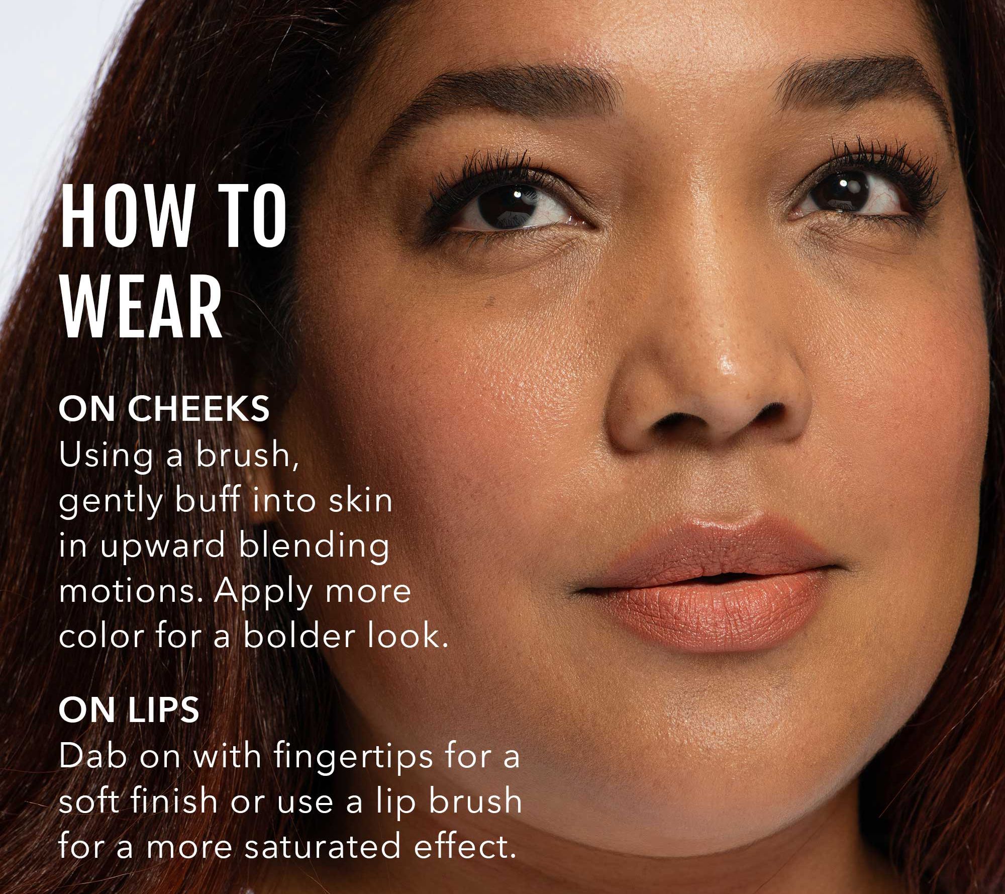 For lips, dab on with fingertips for a soft, subtle finish or apply with a lip brush (not included) for a precise and more saturated effect.