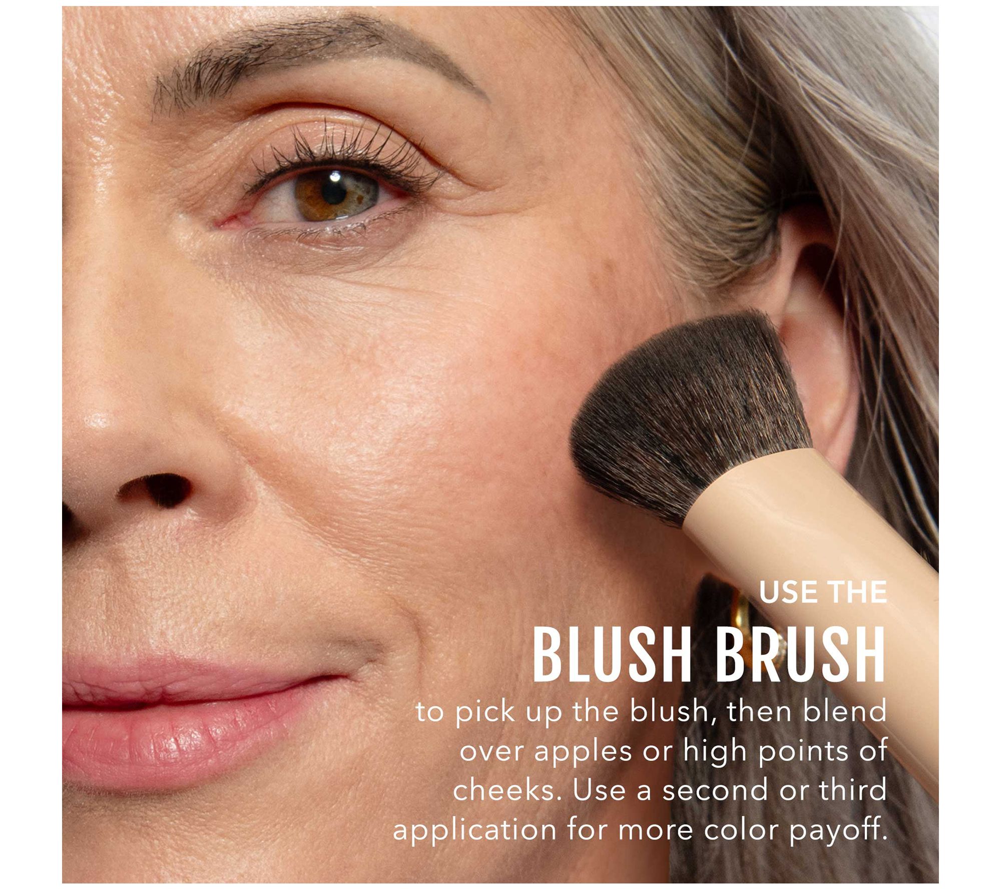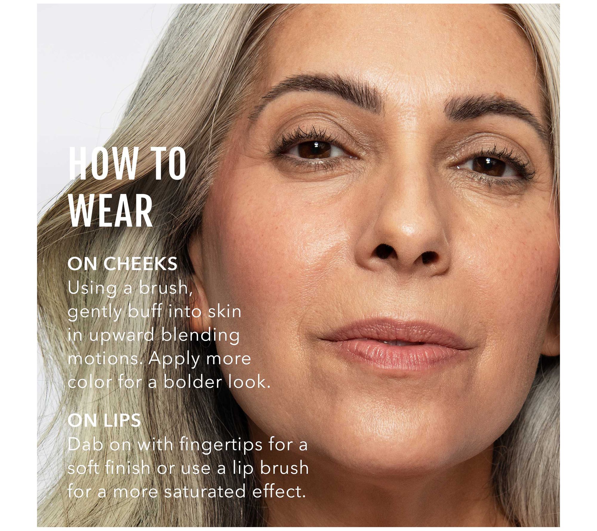 Apply with blush brush by swiping it across the pan. Gently buff into the skin in upward blending motions. Apply one brush stroke for a fair flush, two brush strokes for medium payoff, and three for a full color effect. For lips, dab on with fingertips for a soft, subtle finish or apply with a lip brush (not included) for a precise and more saturated effect.