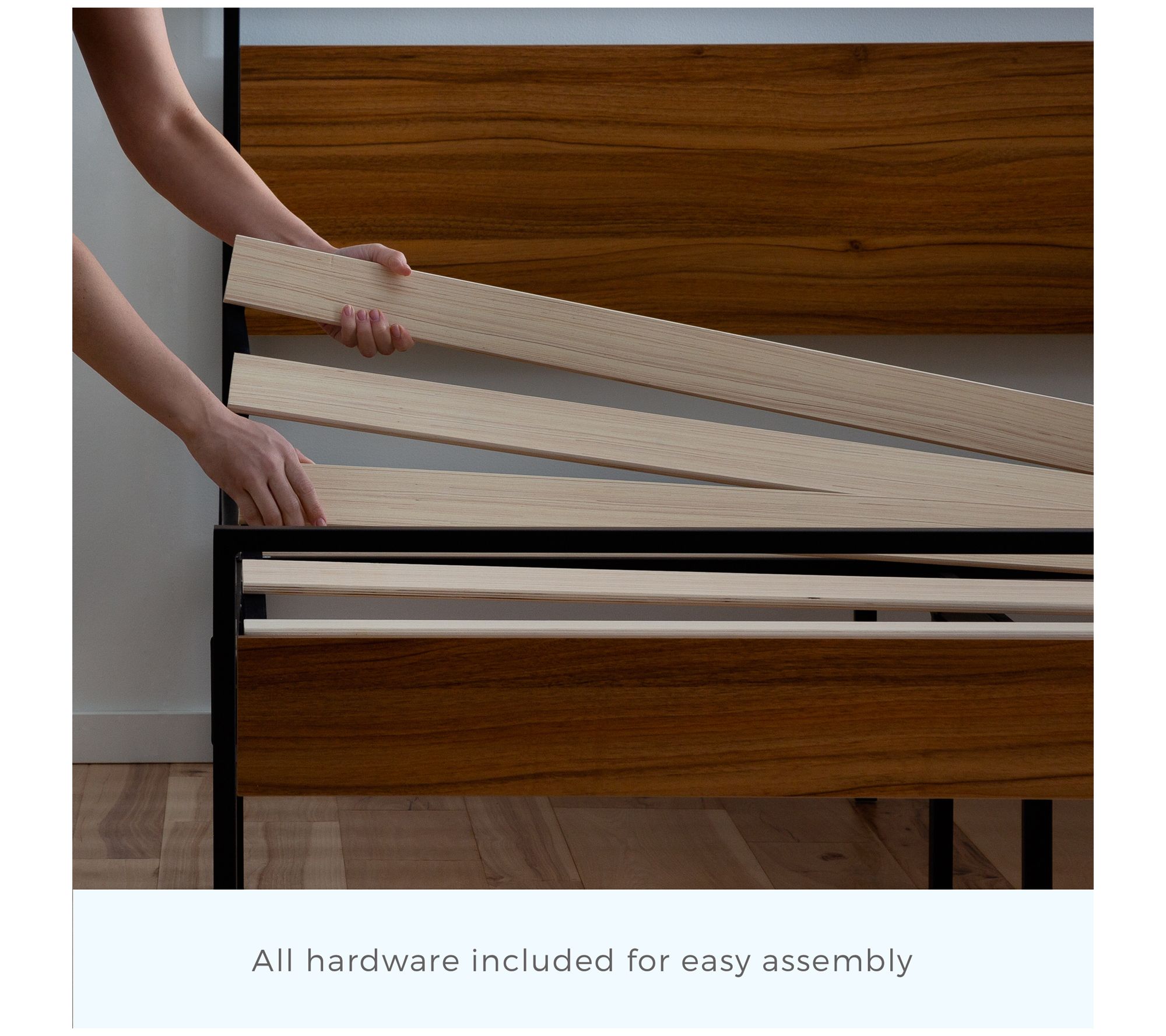Includes metal frame, wood headboard and footboard, 14-piece slat roll with center support bar, additional legs, and assembly hardware; additional items (shown) not included