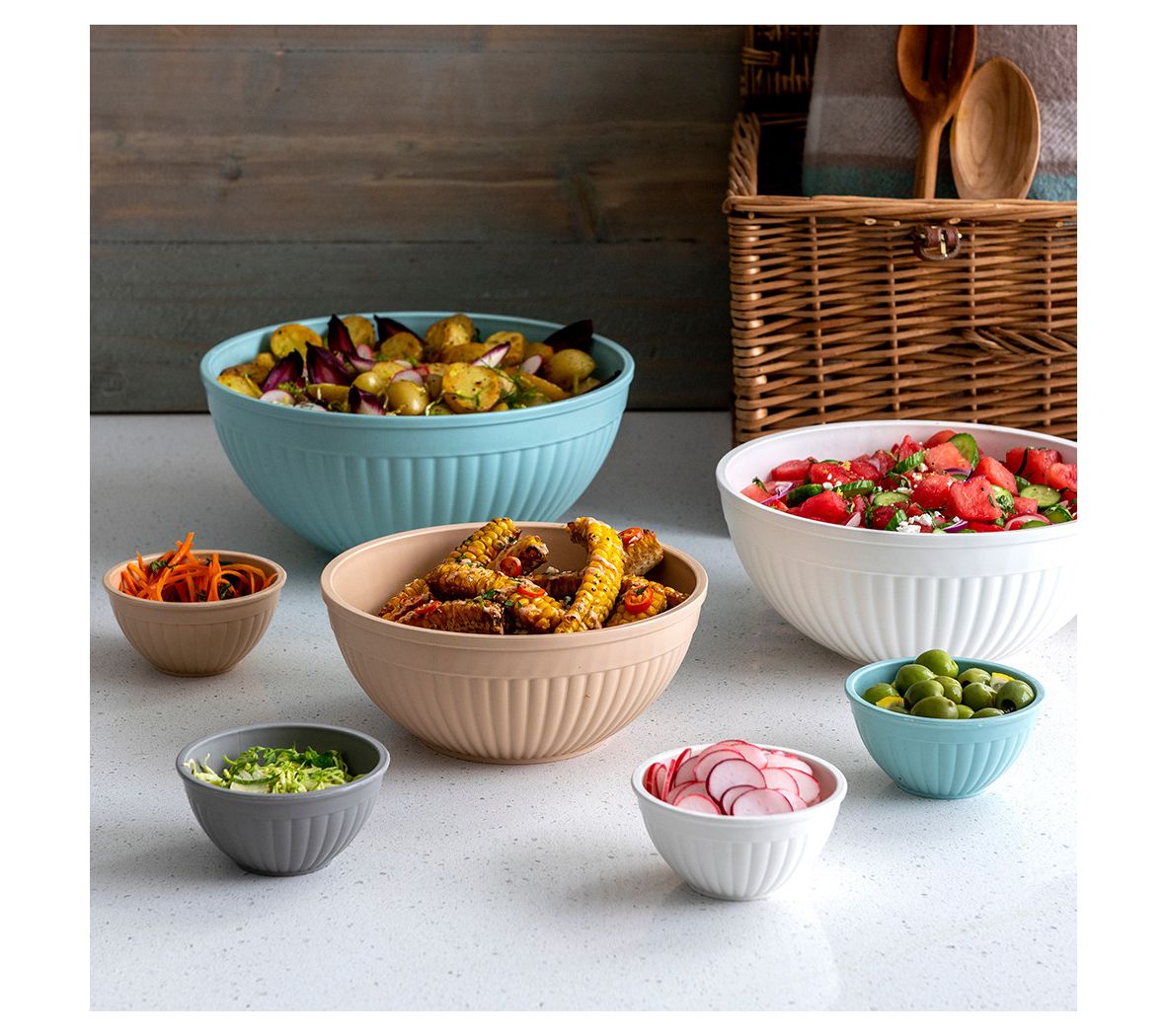 From prepping salads to whipping up quick snacks, this 10-piece bowl and lid set brings versatility and modern style to your kitchen. Enjoy everything from mixing batters to serving dips with bowls designed for easy handling and straightforward cleanup, plus handy mini bowls that keep toppings or ingredients organized. From Nordic Ware.