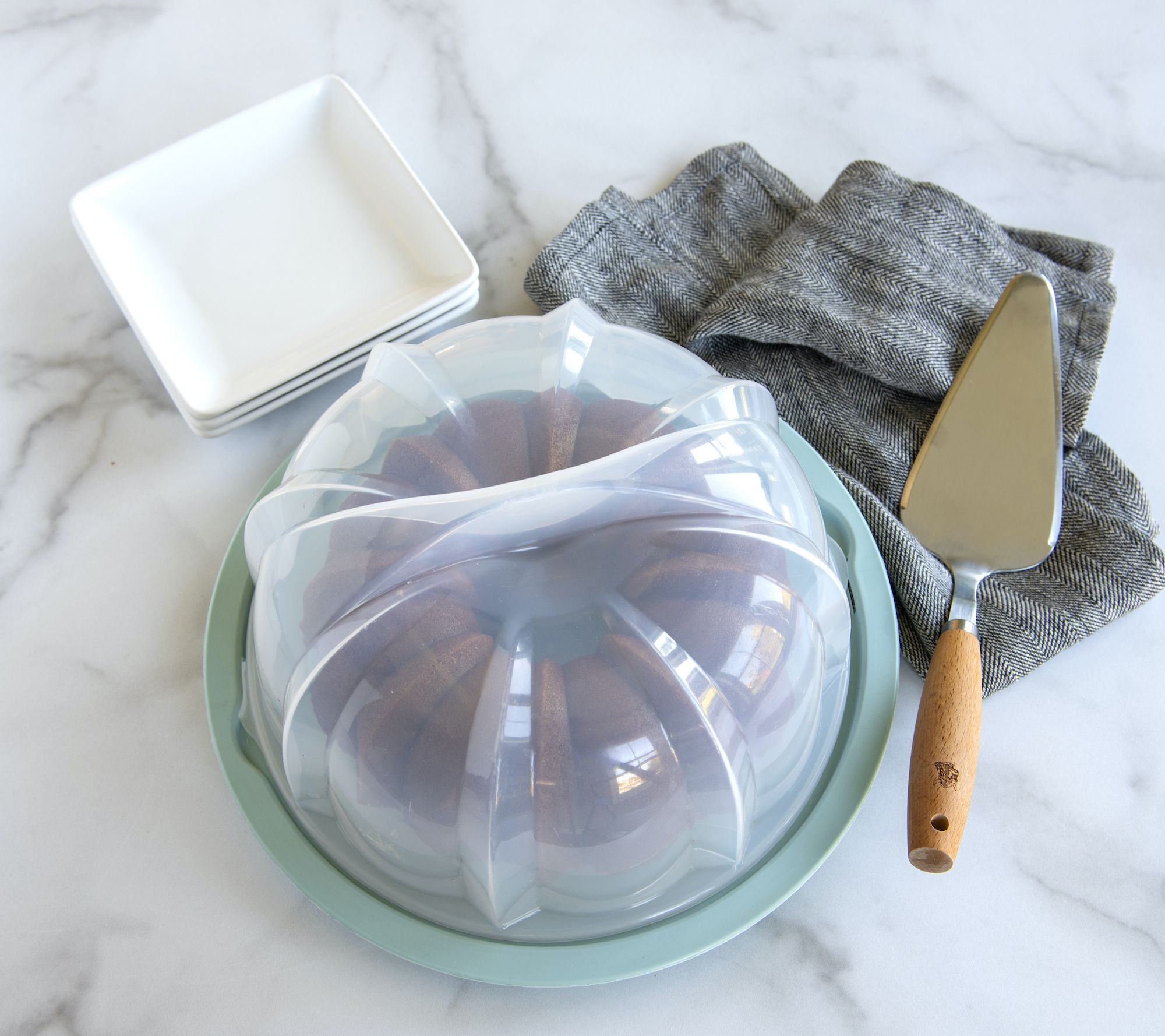 • Cake keeper: translucent lid; twist-to-lock base; plastic construction; dishwasher-safe