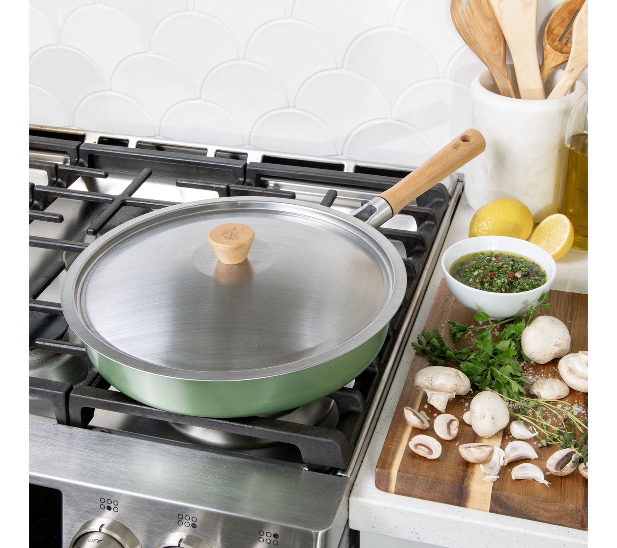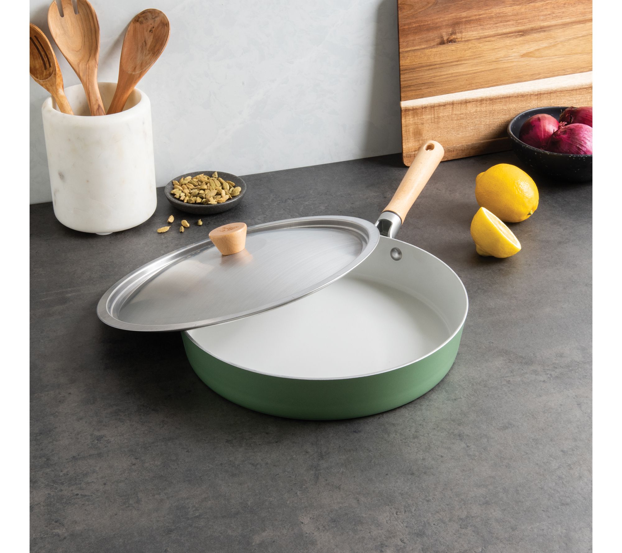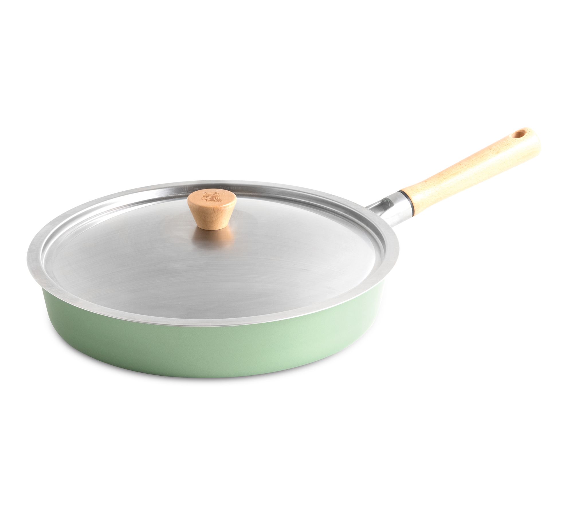 Sear, saute, and simmer with confidence using this Cardamom 12" nonstick frying pan with lid, where vibrant style meets easy functionality. Its quick-heating aluminum design and ceramic nonstick surface handle everything from scrambled eggs to savory stir-fries, while the wooden handle and brushed stainless steel lid bring Scandinavian charm to everyday cooking. From Nordic Ware.
