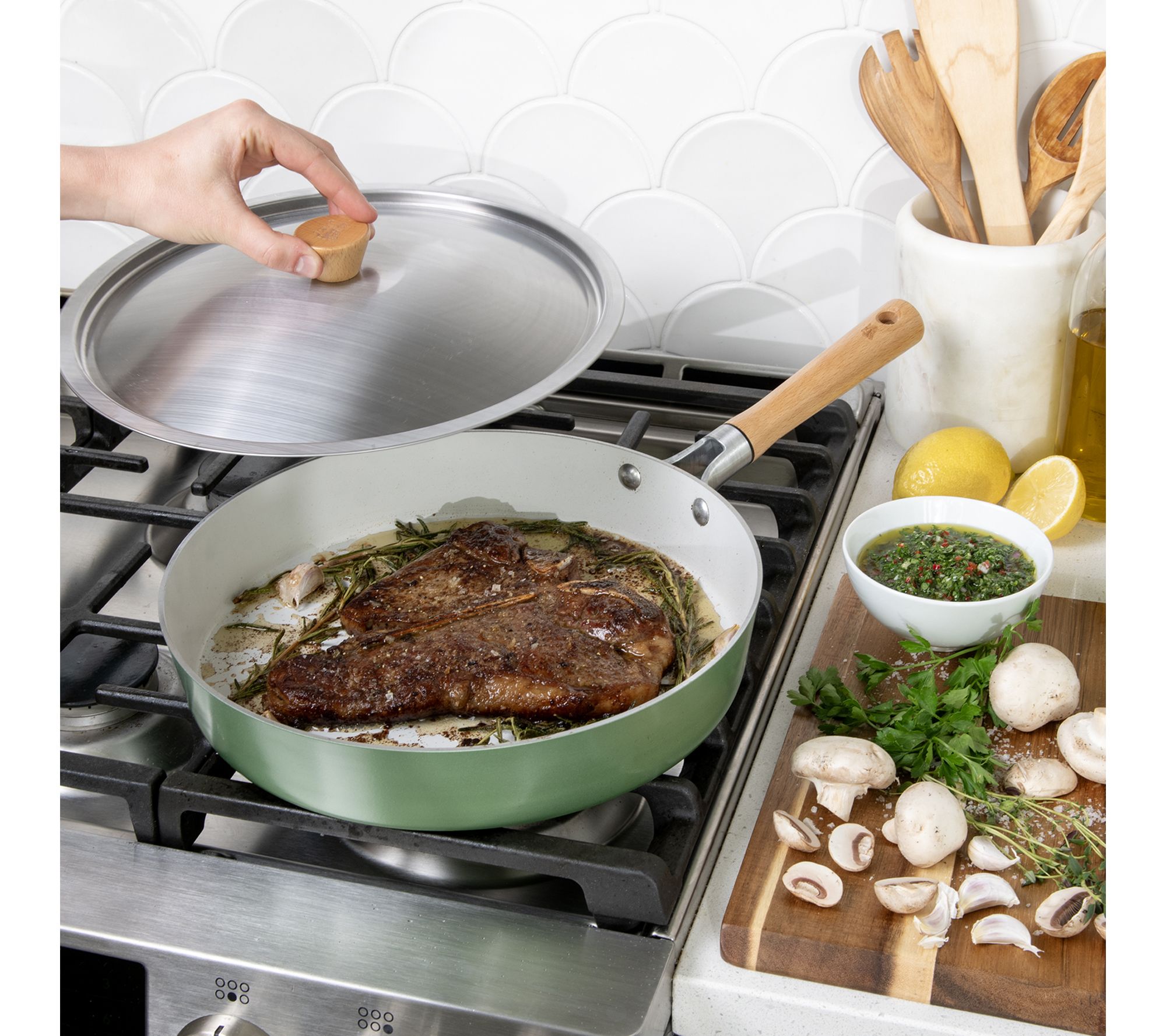 • Brushed stainless steel lid locks in heat and moisture; wooden handle and knob add a Scandinavian-inspired touch