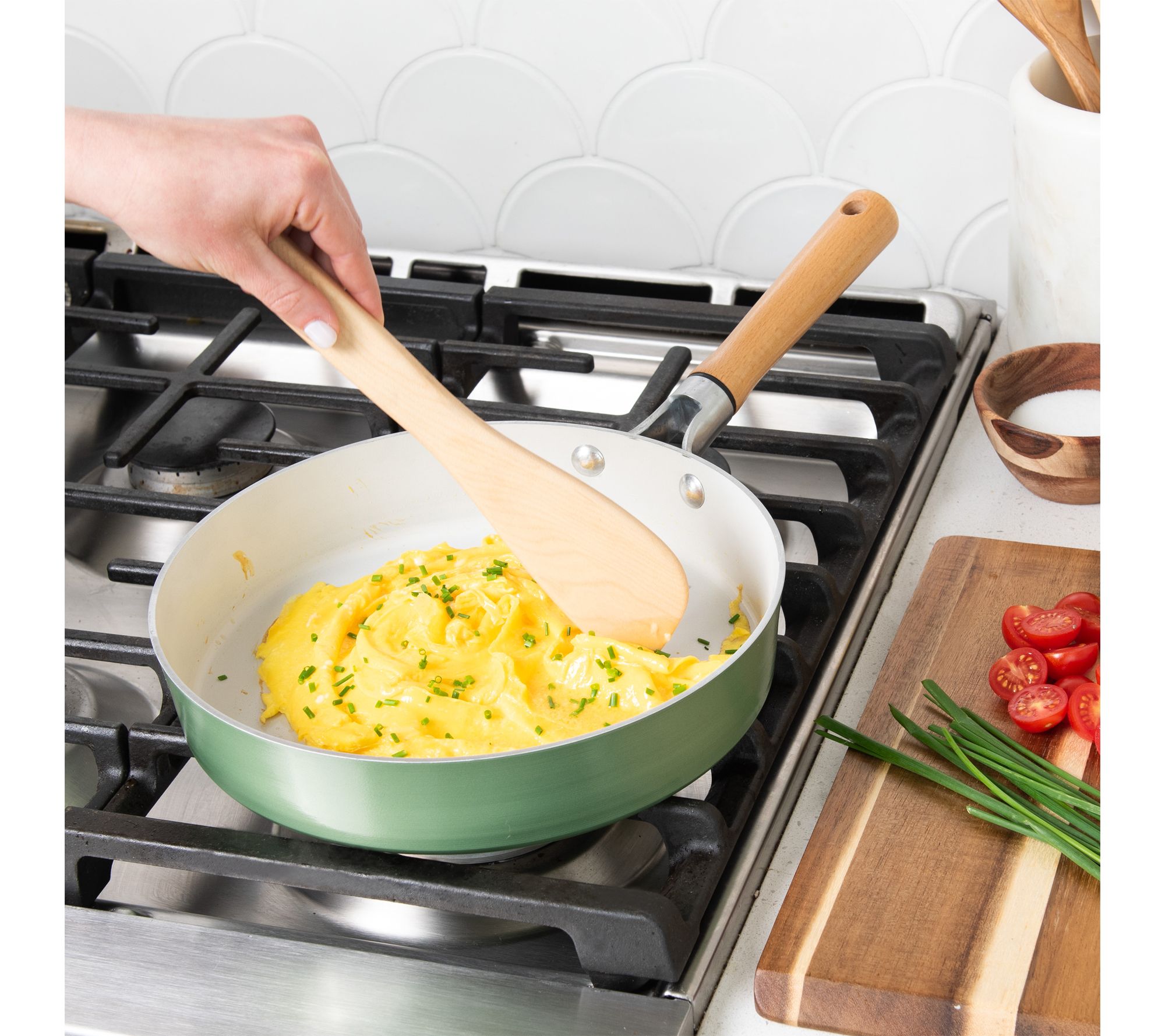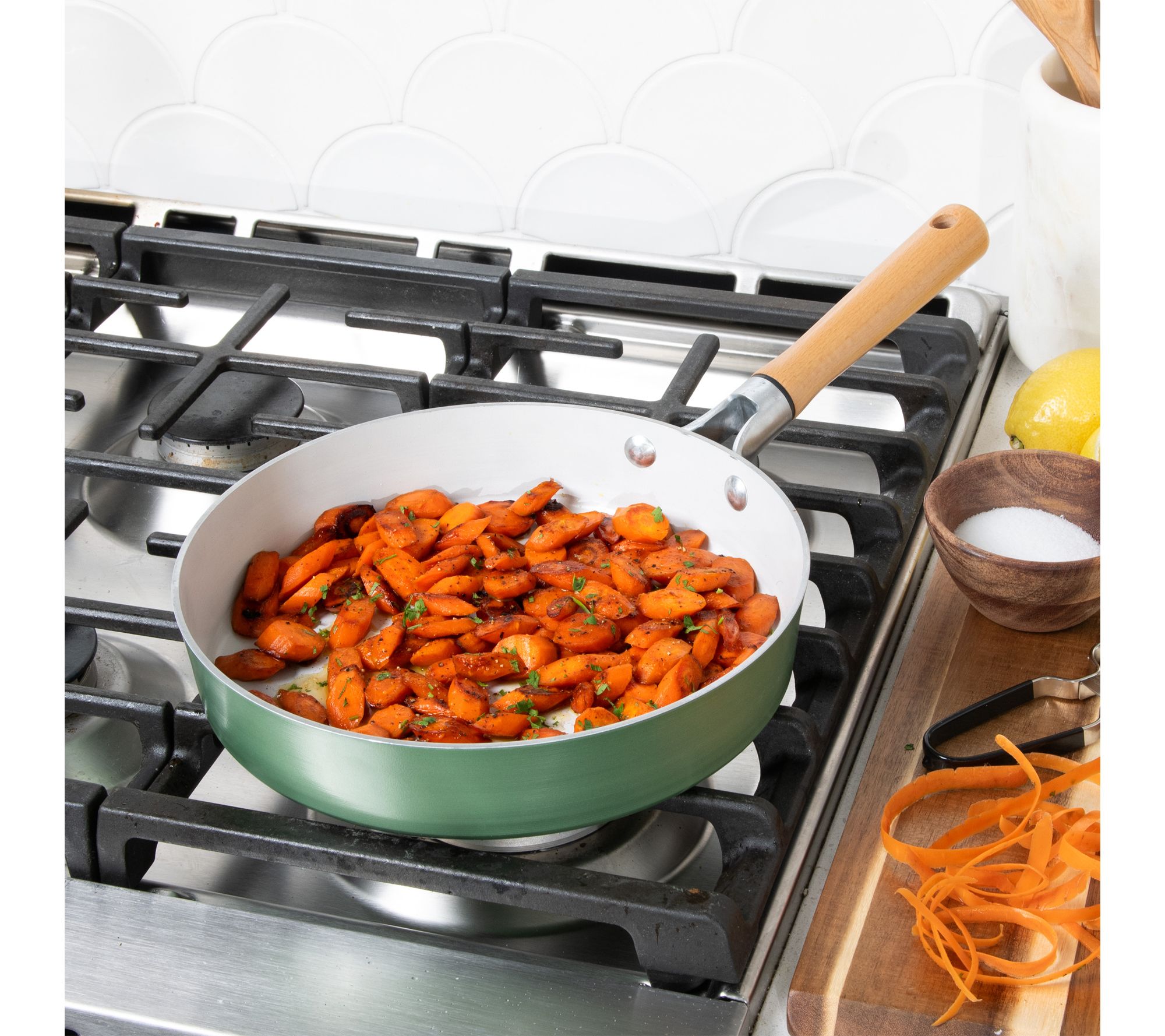 • Spun aluminum construction for fast, even heating with authentic wood handle accents