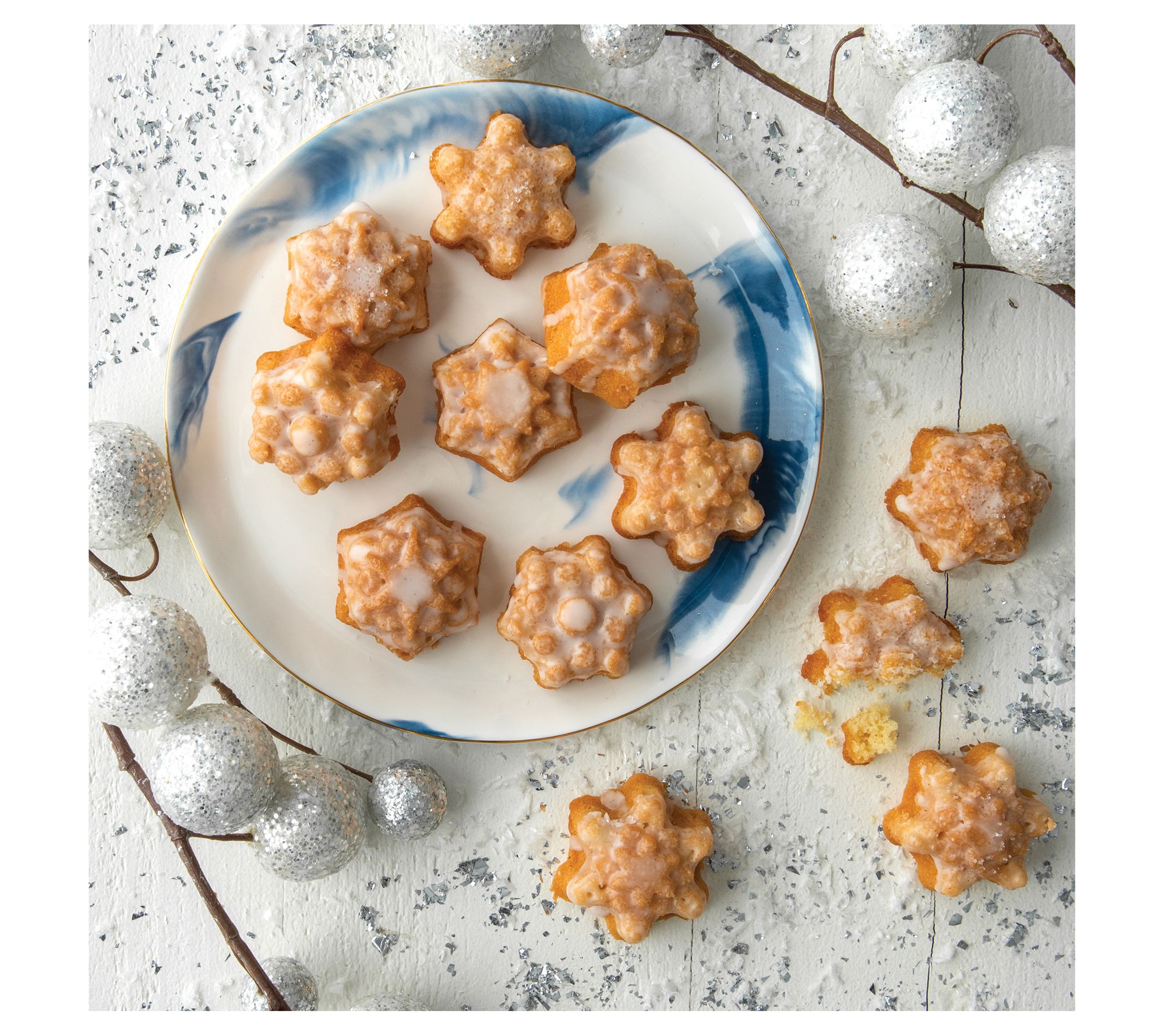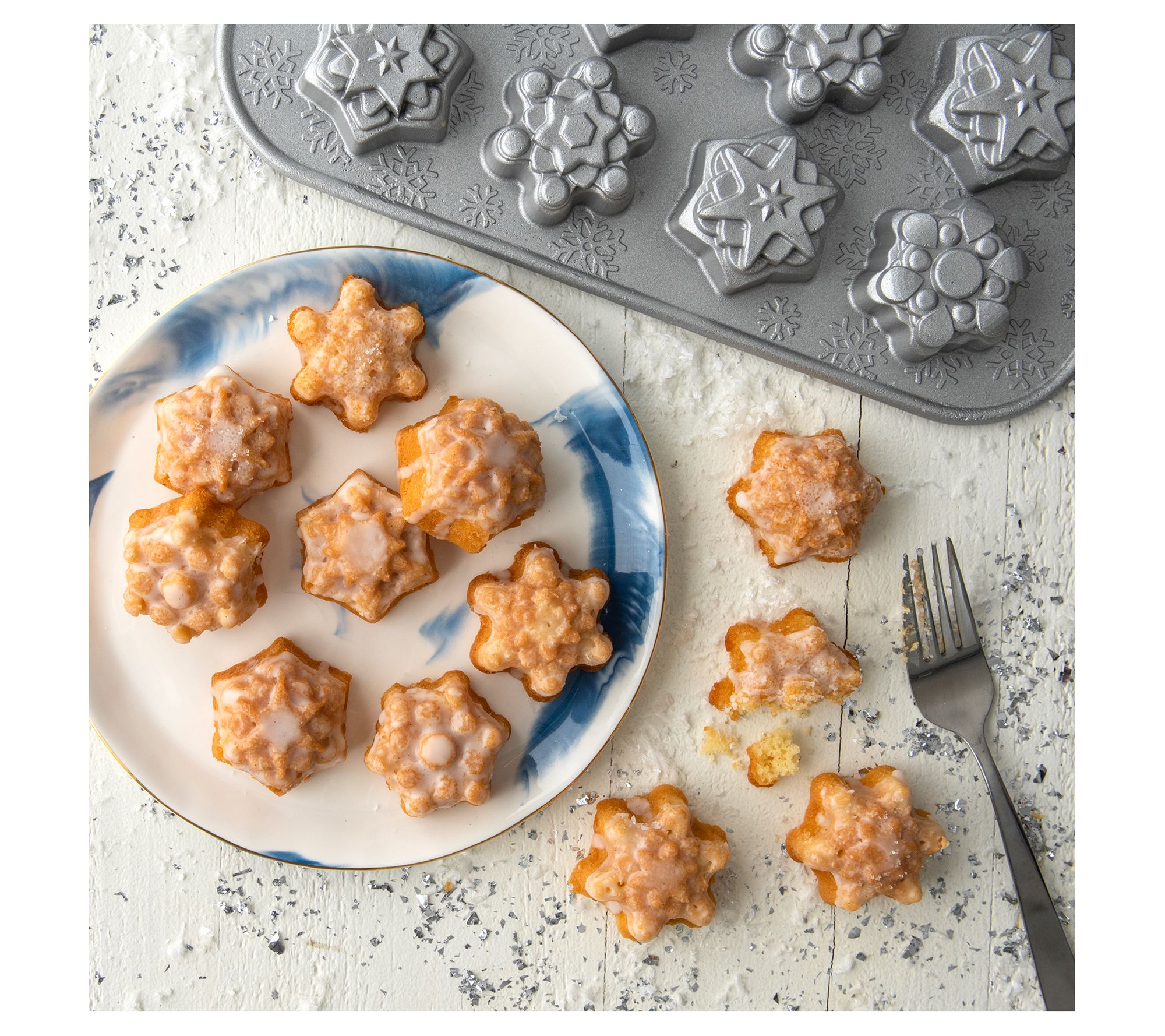 Serve up iconic snowflake-shaped cakelets for the occasion with this set including a sparkling silver-finished pan and a sugar duster for a frosty presentation. From Nordic Ware.