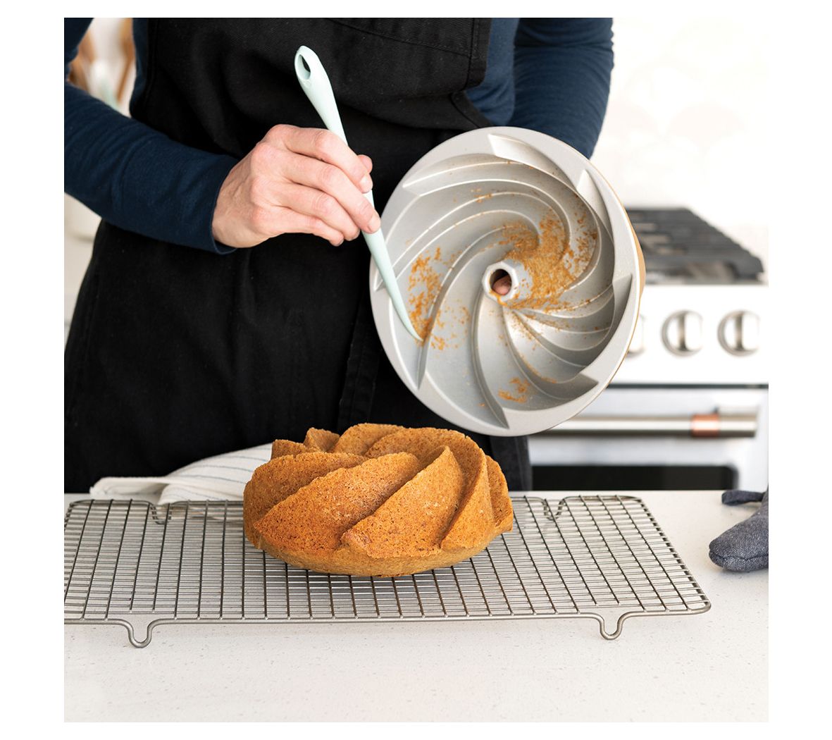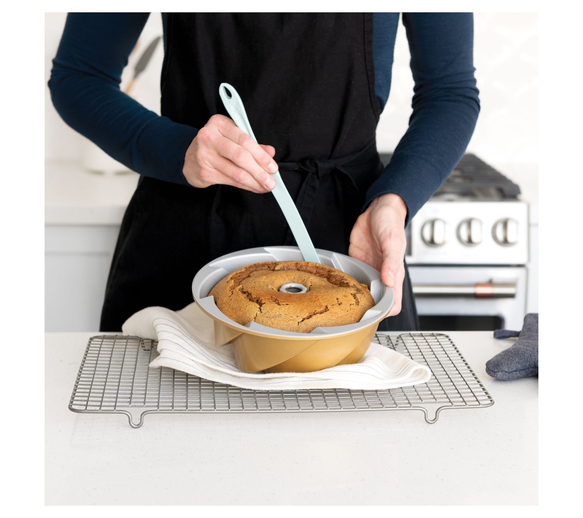Holiday baking turns into a show-stopping centerpiece with the Gingerbread House Bundt and Tools Set. Create beautifully detailed cakes in the festive pan, then use the included finishing tools for effortless decorating, slicing, and serving at your next gathering. Watch smiles appear as you unveil a whimsical treat -- no extra molds or fancy skills required. From Nordic Ware.