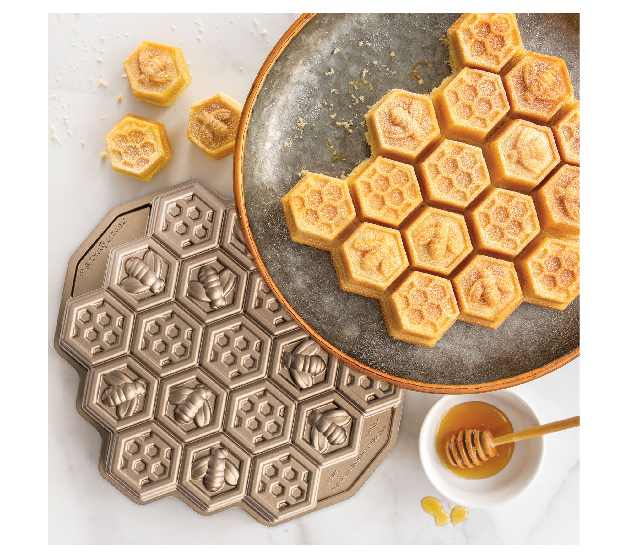Buzz-worthy dessert! Create a honeycomb-inspired confection that divides into 19 perfectly portioned cakelets with this cast aluminum pan. From Nordic Ware.