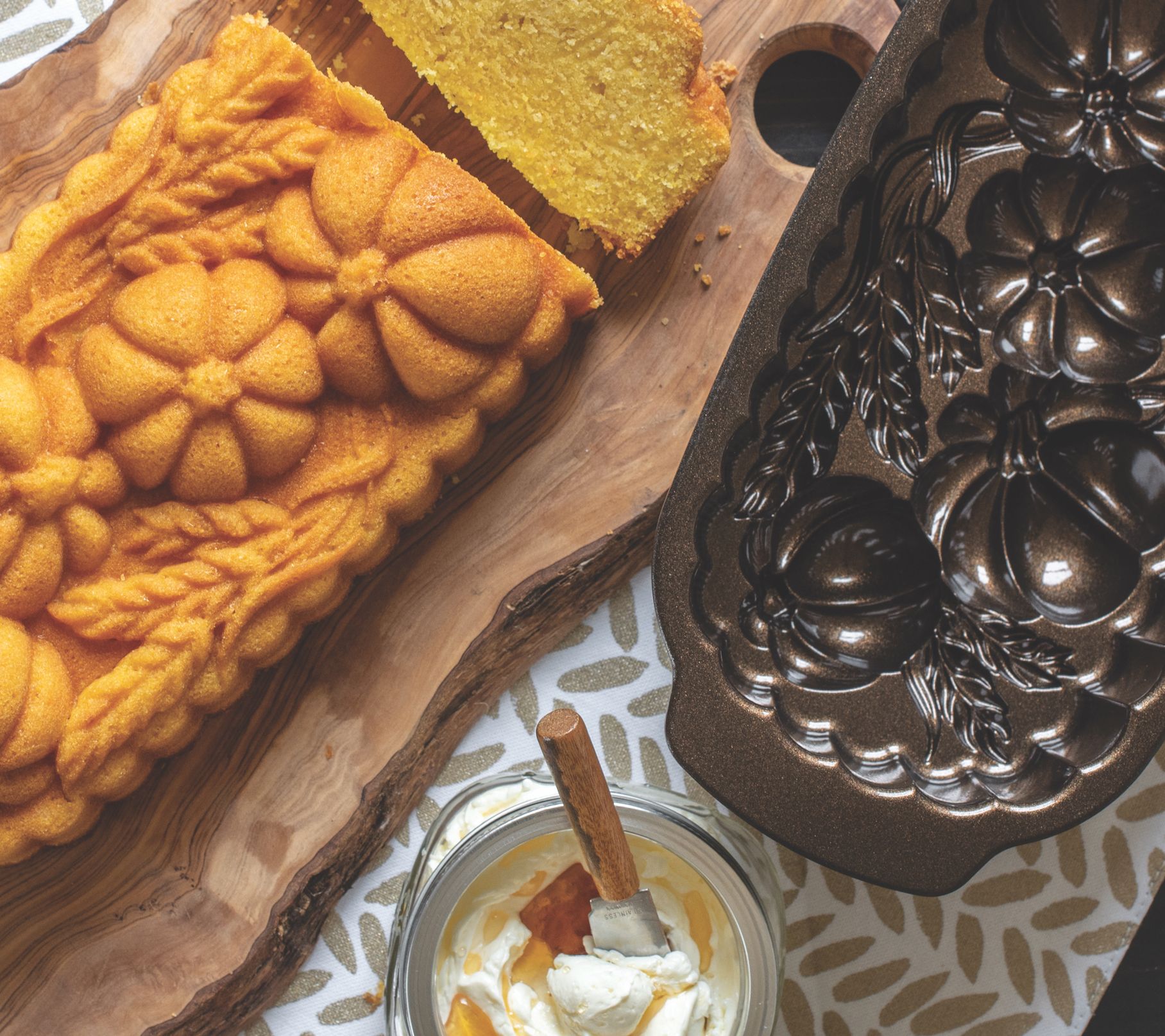 • Includes 6-cup Wheat and Pumpkin loaf pan and loaf cake keeper