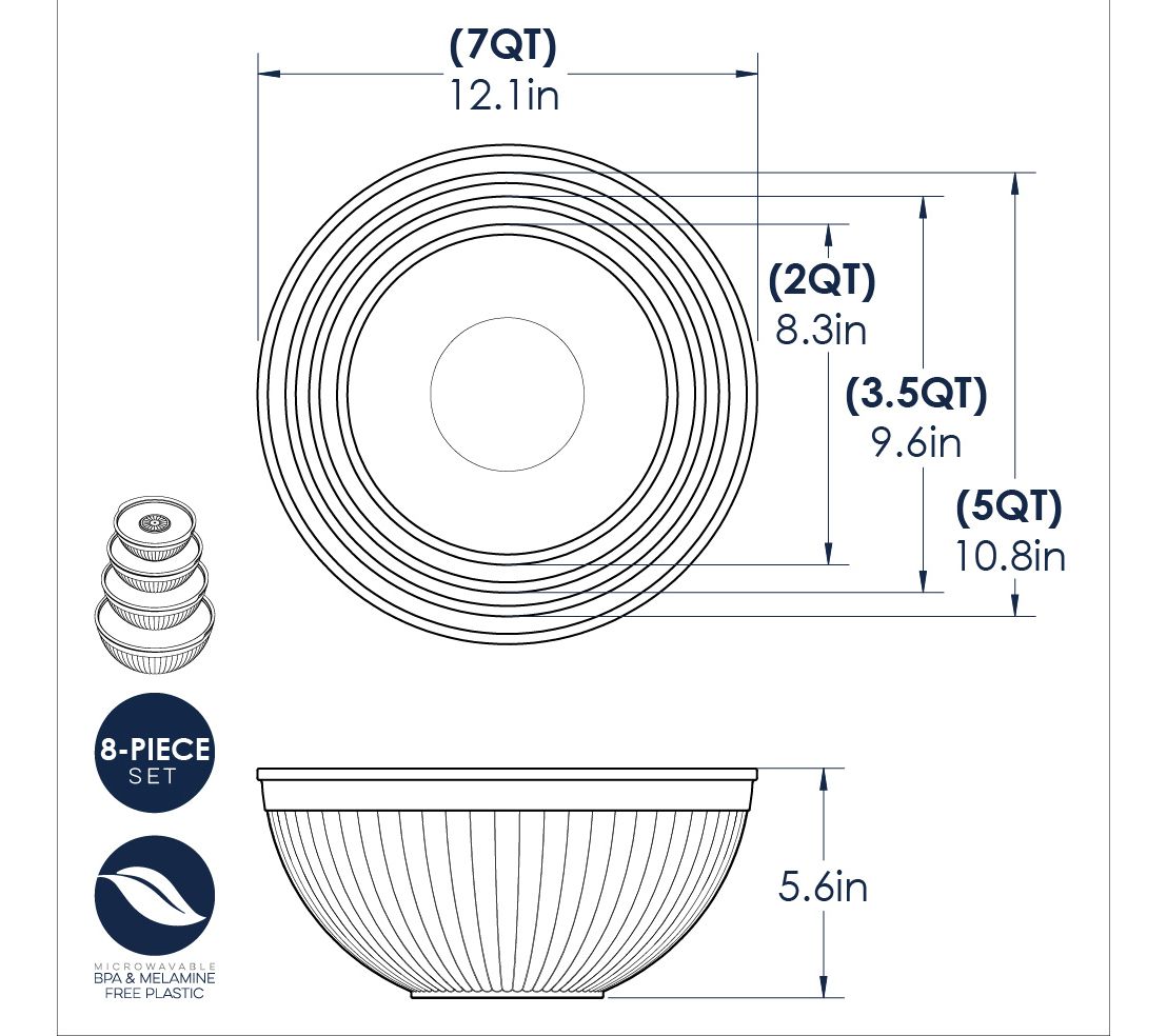 • Includes one 2-qt bowl with lid, one 3.5-qt bowl with lid, one 5-qt bowl with lid, and one 7-qt bowl with lid