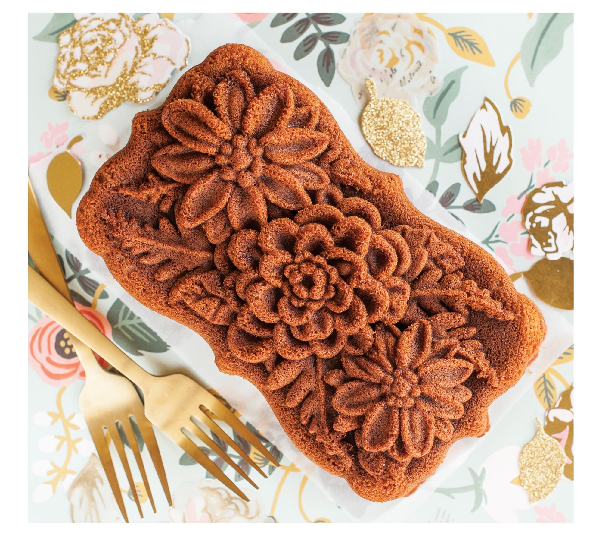 Ferns and flowers form a vibrant array atop this fresh and lovely loaf pan -- for any occasion where flowers are appropriate (which is always)! From Nordic Ware.