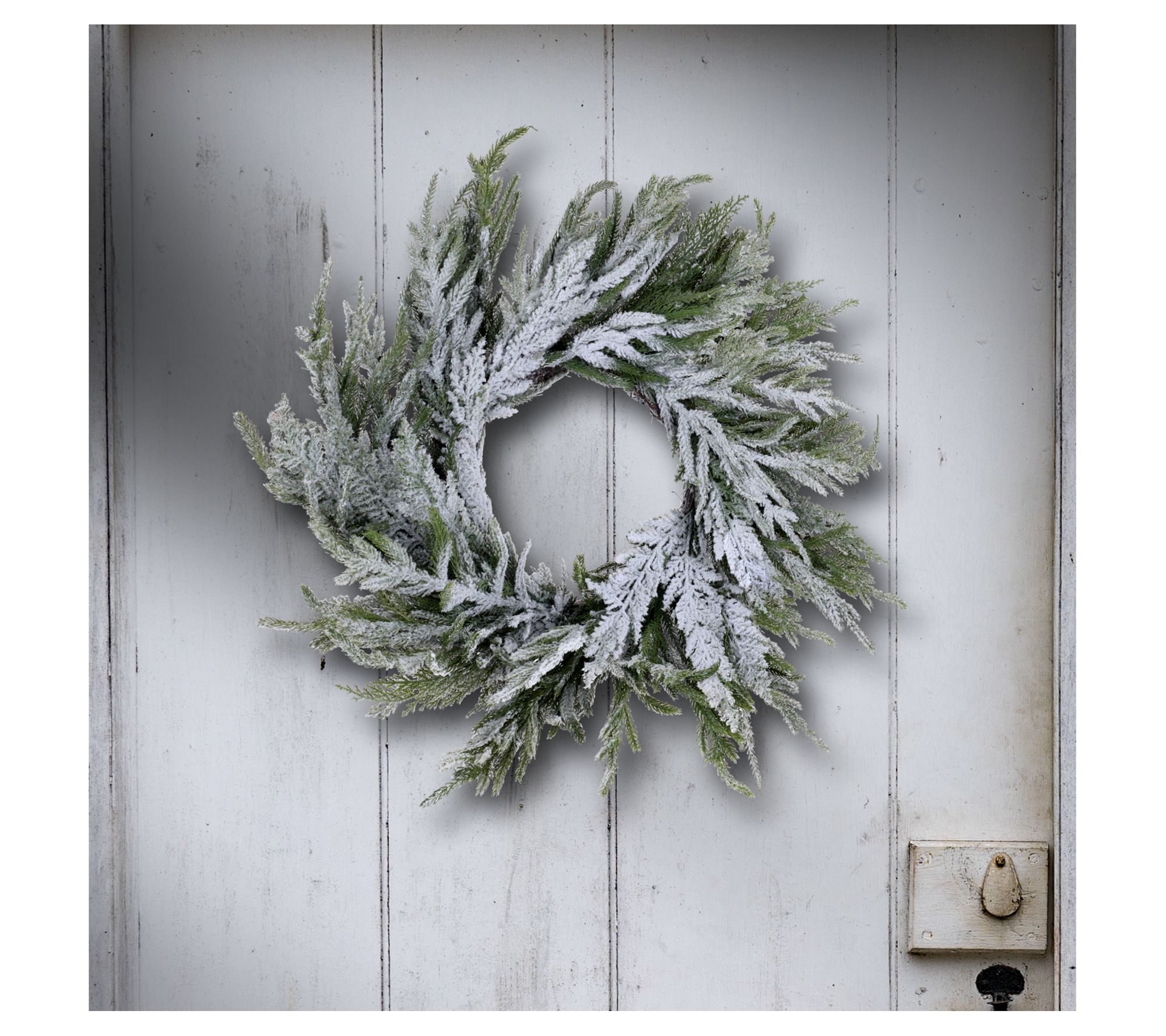 Get your home ready for the holiday season with the Norfolk Pine Wreath With Snow by Valerie. This lifelike wreath, crafted from real-touch plastic in natural green hues, is perfect for adding a touch of winter wonderland charm to doors, windows, and fireplaces. From the Valerie Parr Hill Collection.