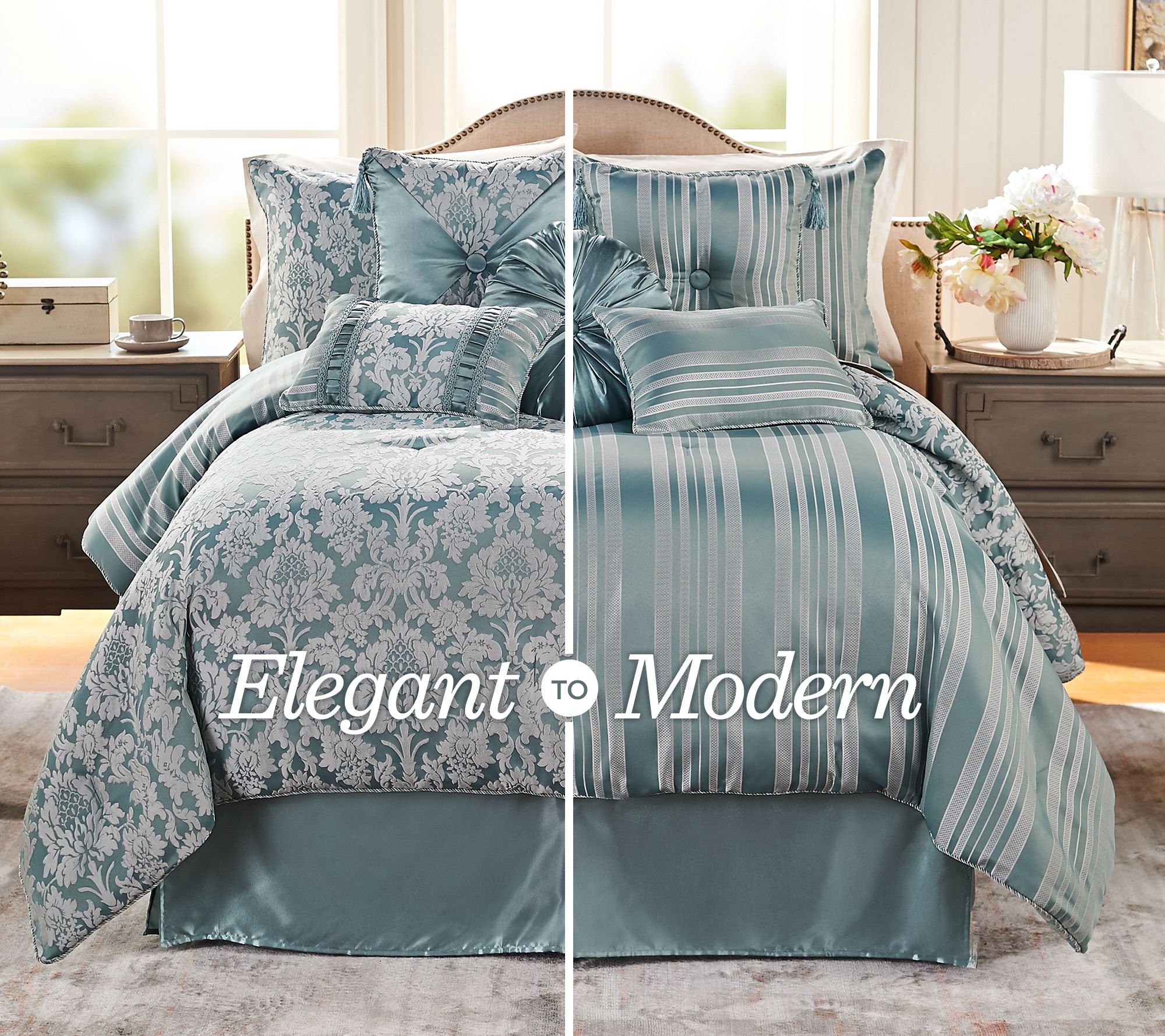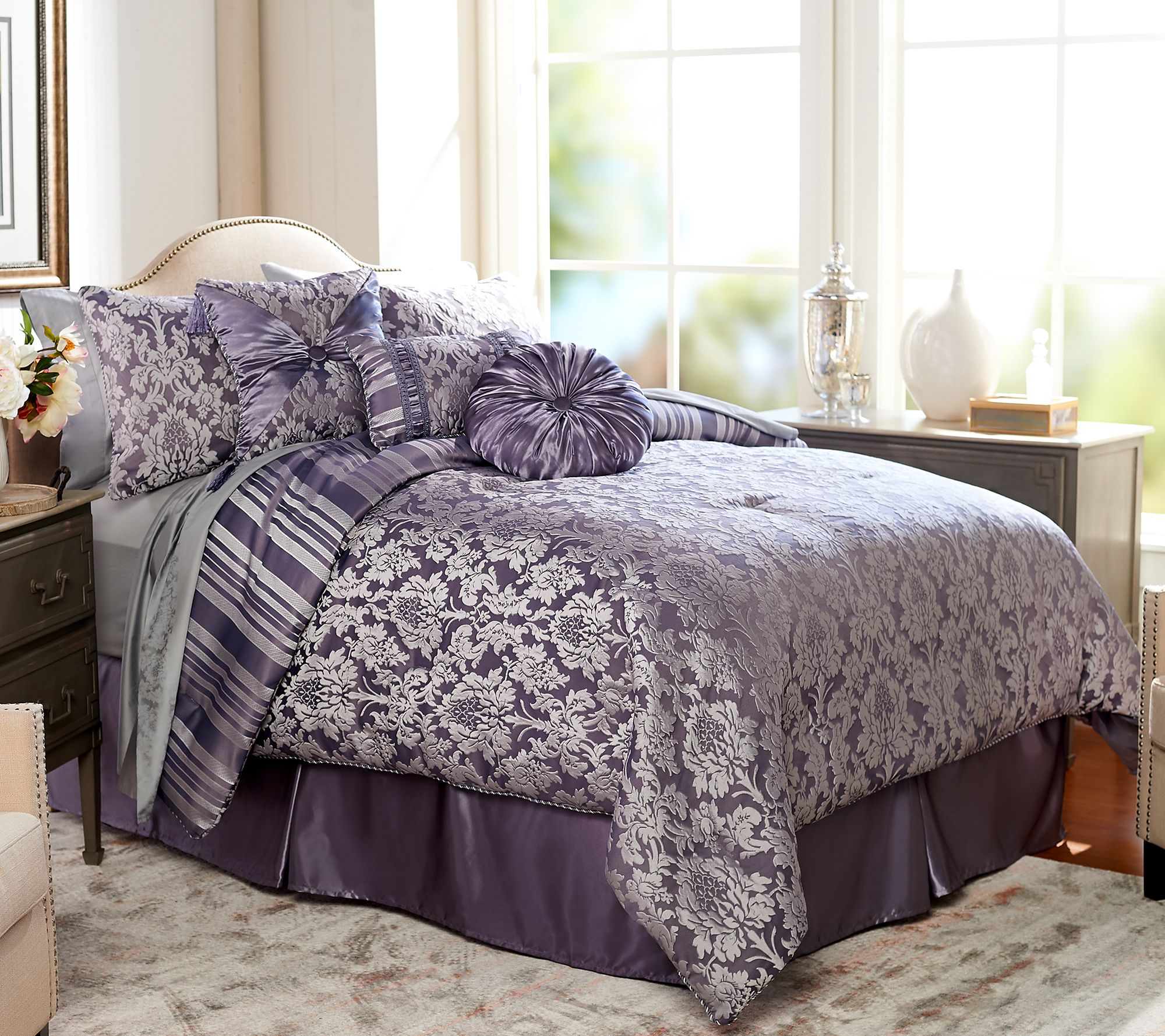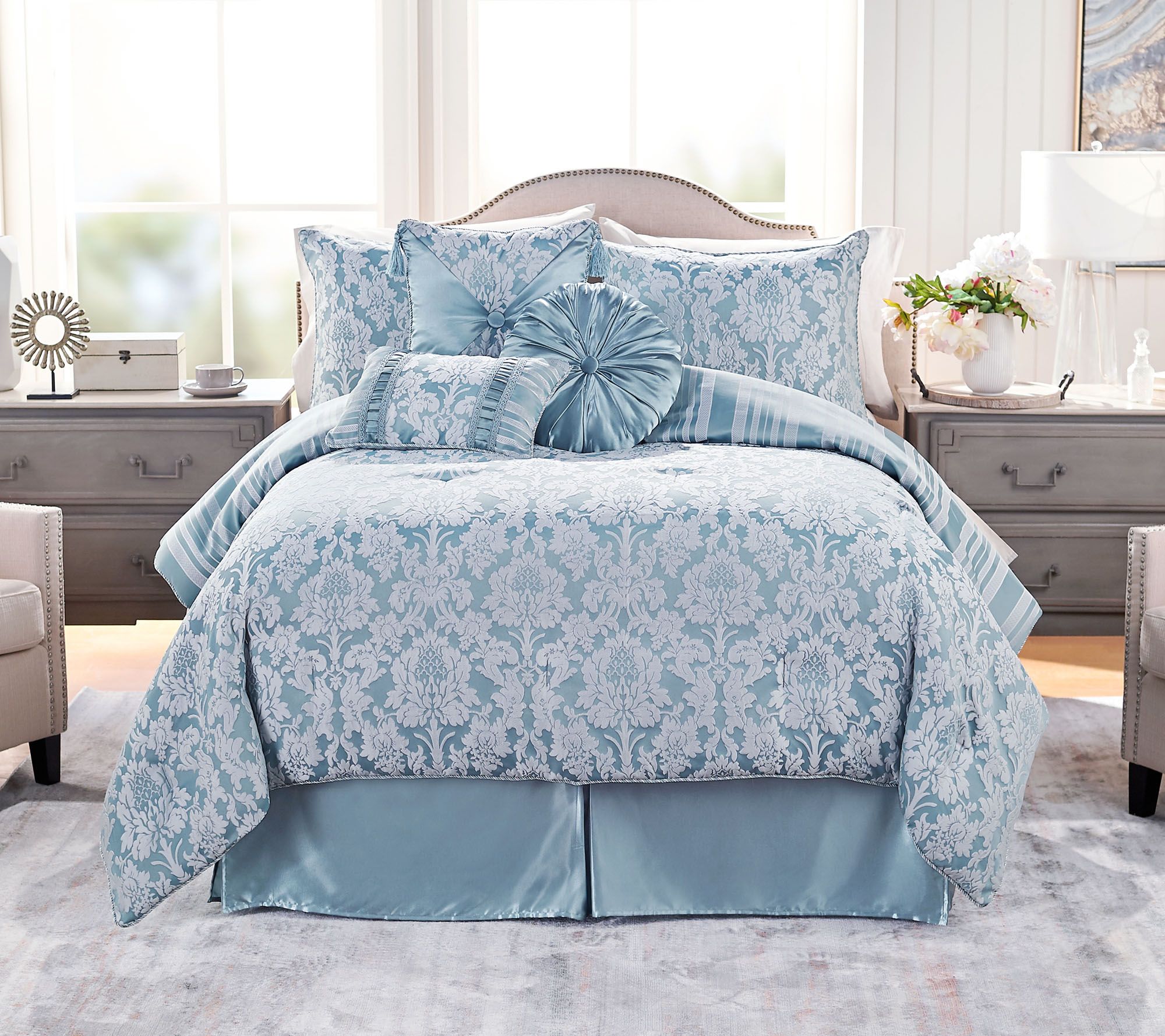 • Includes one comforter, one sham, one bed skirt, one decorative pillow, one breakfast pillow, and one round pillow