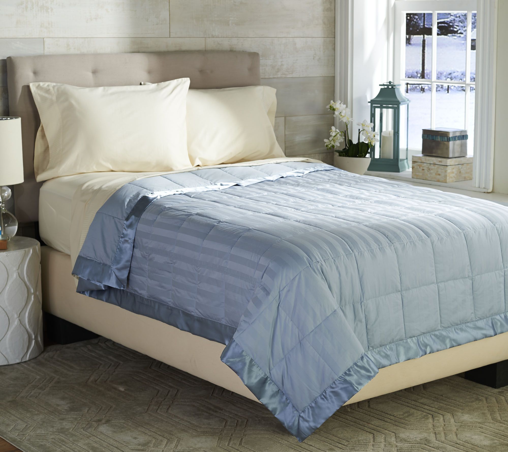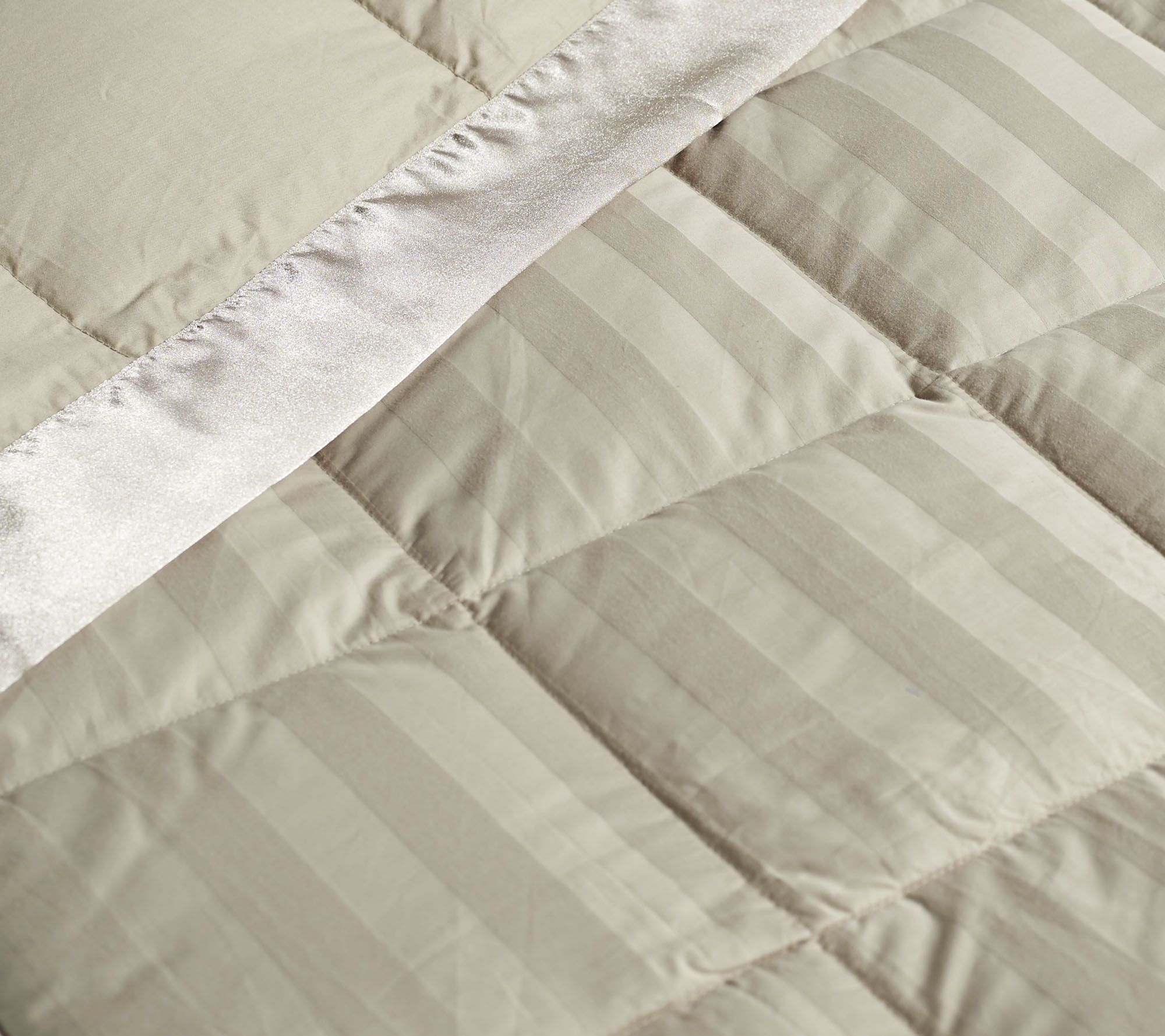 Down for the count. You'll enjoy a warm and cozy night's sleep beneath this Northern Nights cotton dobby down blanket. The reversible blanket is trimmed with satin binding and designed with a pretty woven damask striped fabric. From Northern Nights(R) Bedding.
