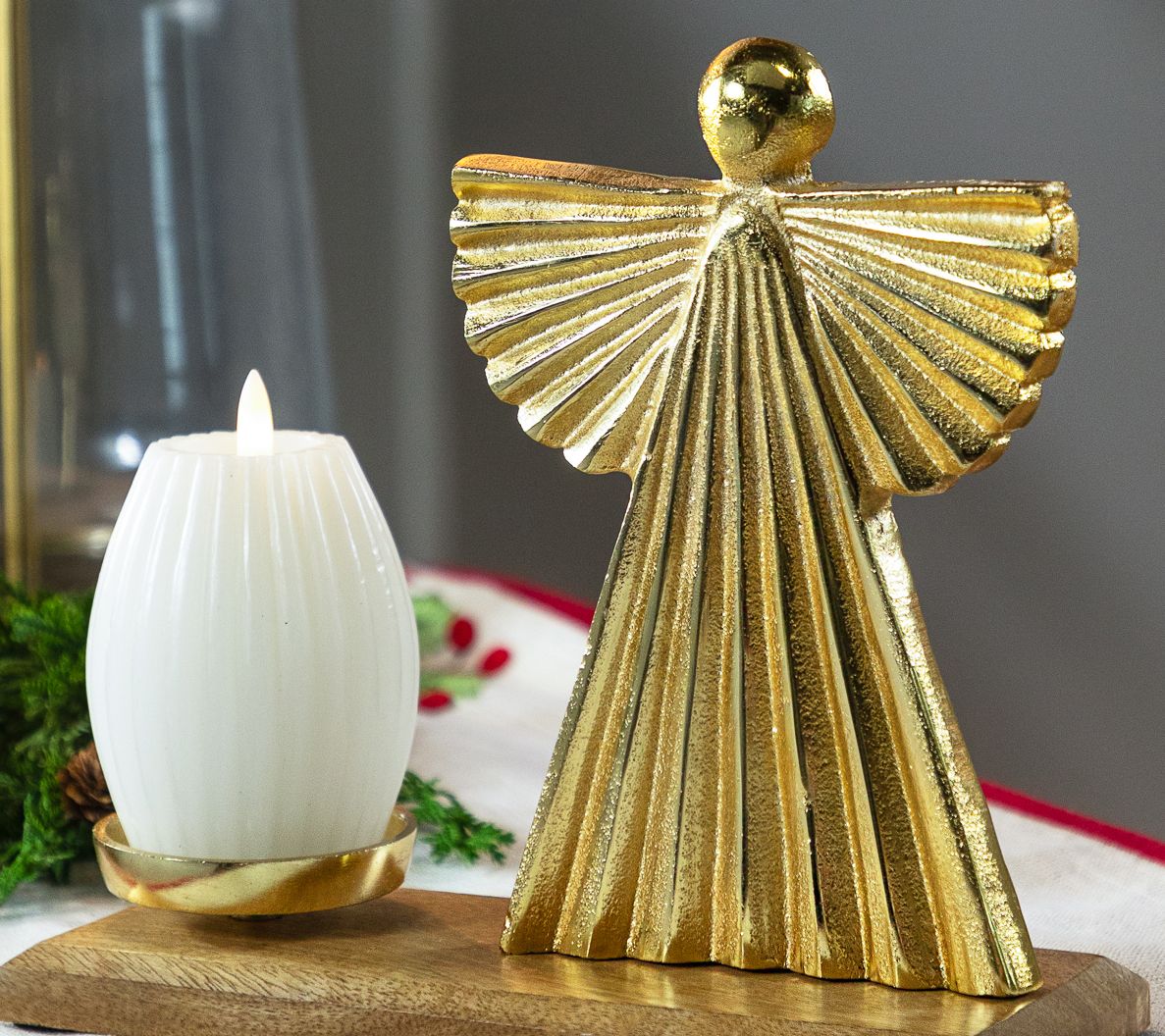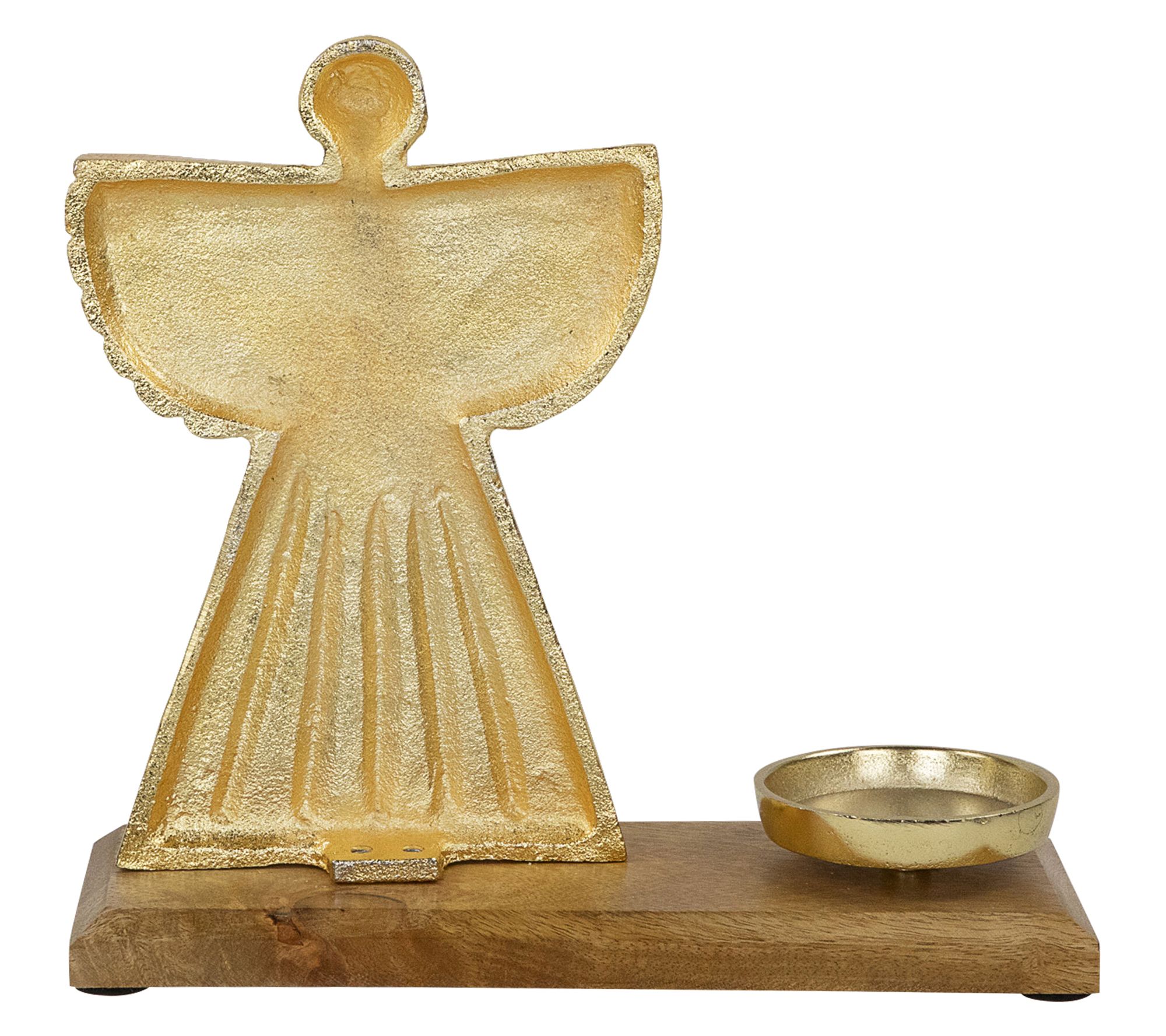 Enhance your holiday ambiance with this angel votive holder, a graceful addition to festive displays or table centerpieces. Crafted with a beautifully textured goldtone metal angel, it offers a subtle elegance that complements your decor. Resting on a sturdy rectangular wooden base, this piece provides a safe home for your votive candle, perfect for a serene, warm glow. Let this charming accent bring a touch of celestial magic to your home. From Northlight.